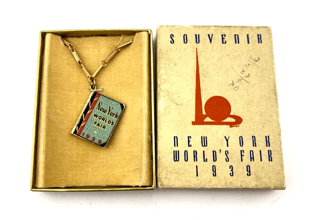 An uncommon and finely preserved 1939 New York World’s Fair souvenir bracelet, featuring a miniature articulated book charm and its original presentation box. Pieces combining wearable design with intact historical packaging are increasingly difficult to find.