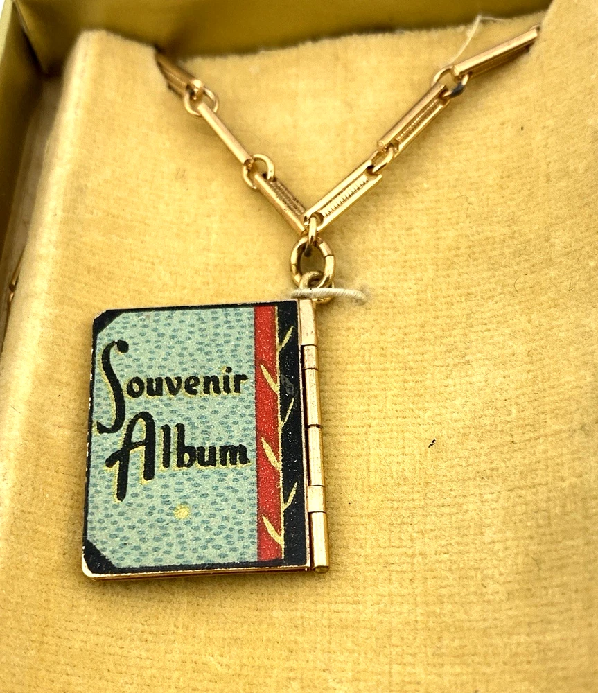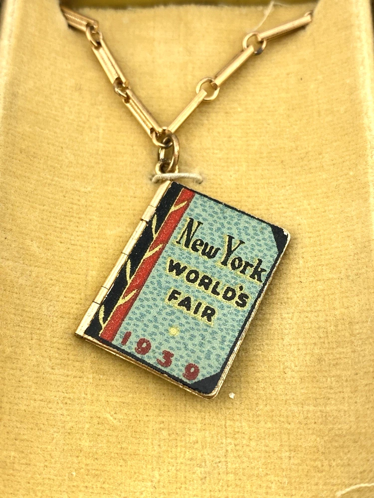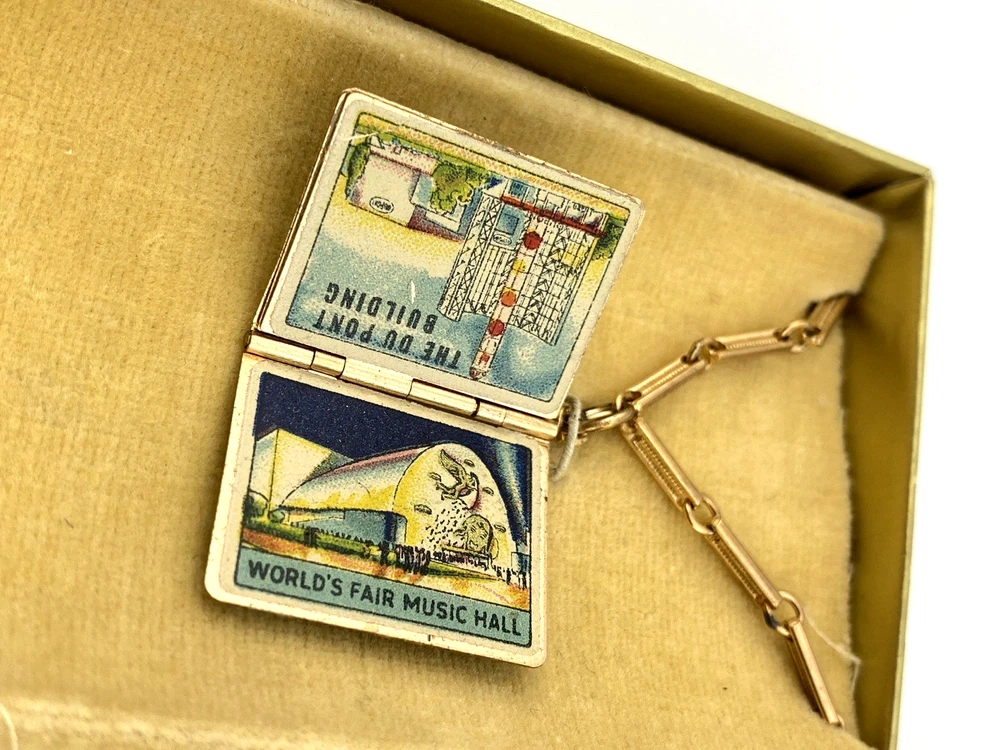 Suspended from a fine gold tone bar link chain, the charm takes the form of a small articulated booklet with full color serigraphed metal panels. The cover reads “New York World’s Fair 1939,” with “Souvenir Album” on the reverse.