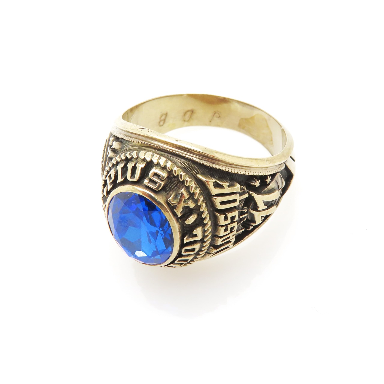 The school motto is “Loyalty, Piety, Purity”, carved in a circle around a triangle on the ring shoulder, opposite the year 77.