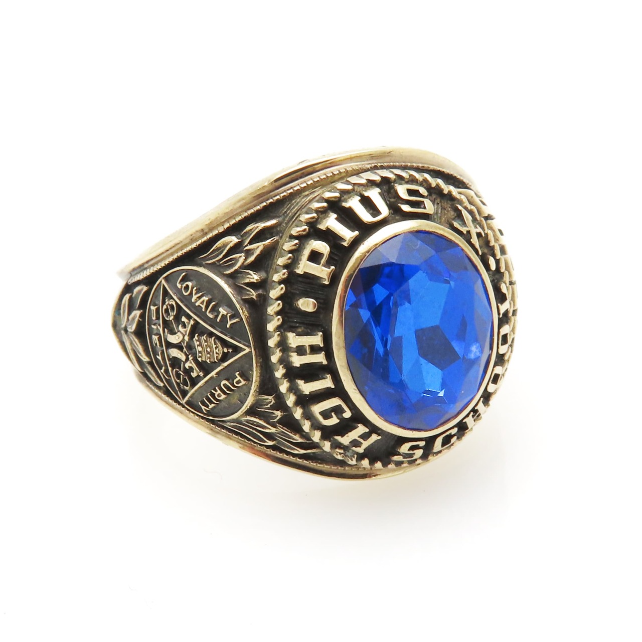 A very nicely made antiqued gold school ring for Pius X High School, Class of 1977. The quality is very good, the details are strong and legible, the color is antiqued gold making it look older than it really is. It is costume jewelry, not fine.