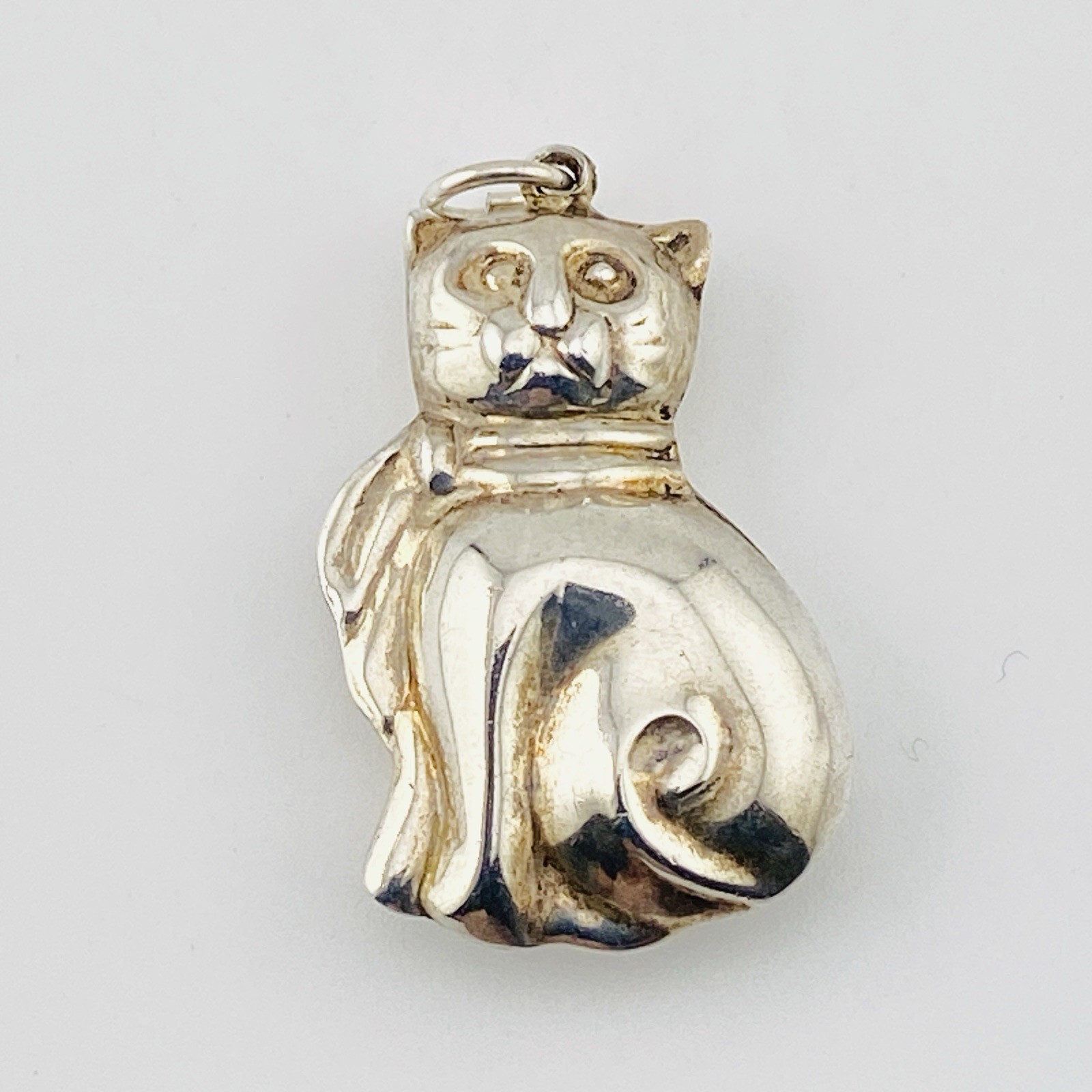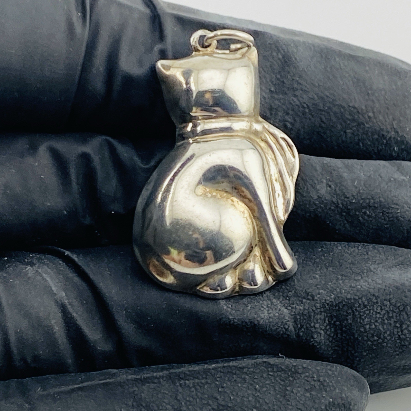 A sweetly sculpted sterling silver cat pendant with a rounded, dimensional form and unmistakable personality.