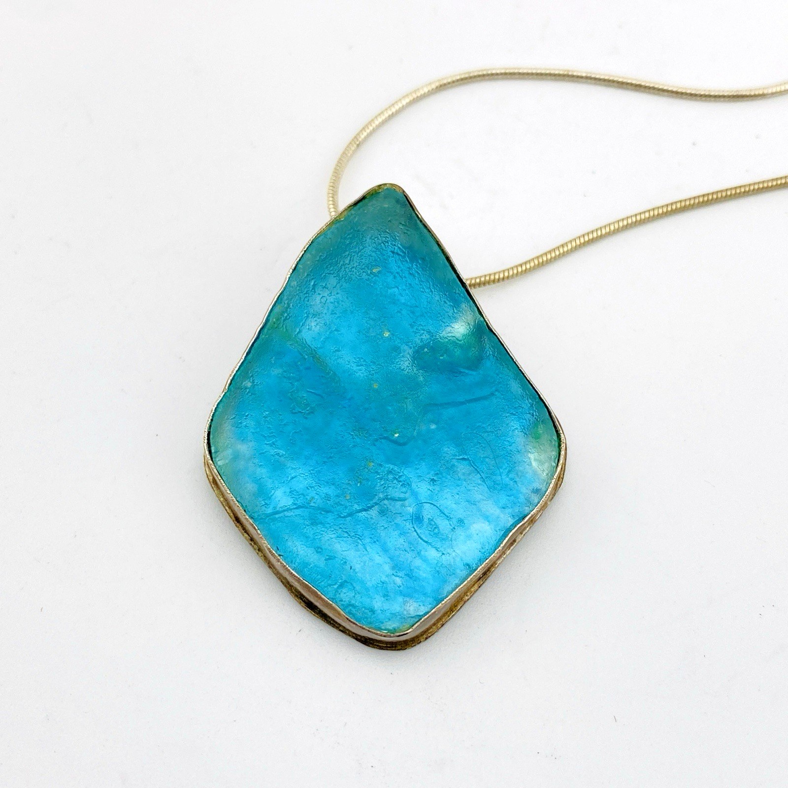 The glass shard is cut in a kite-like shape and framed in a clean silver bezel. The pendant originally had pin hardware, which was removed by a previous owner, allowing it to be worn as a necklace. The conversion is neatly executed and does not detract from the visual balance of the piece.
