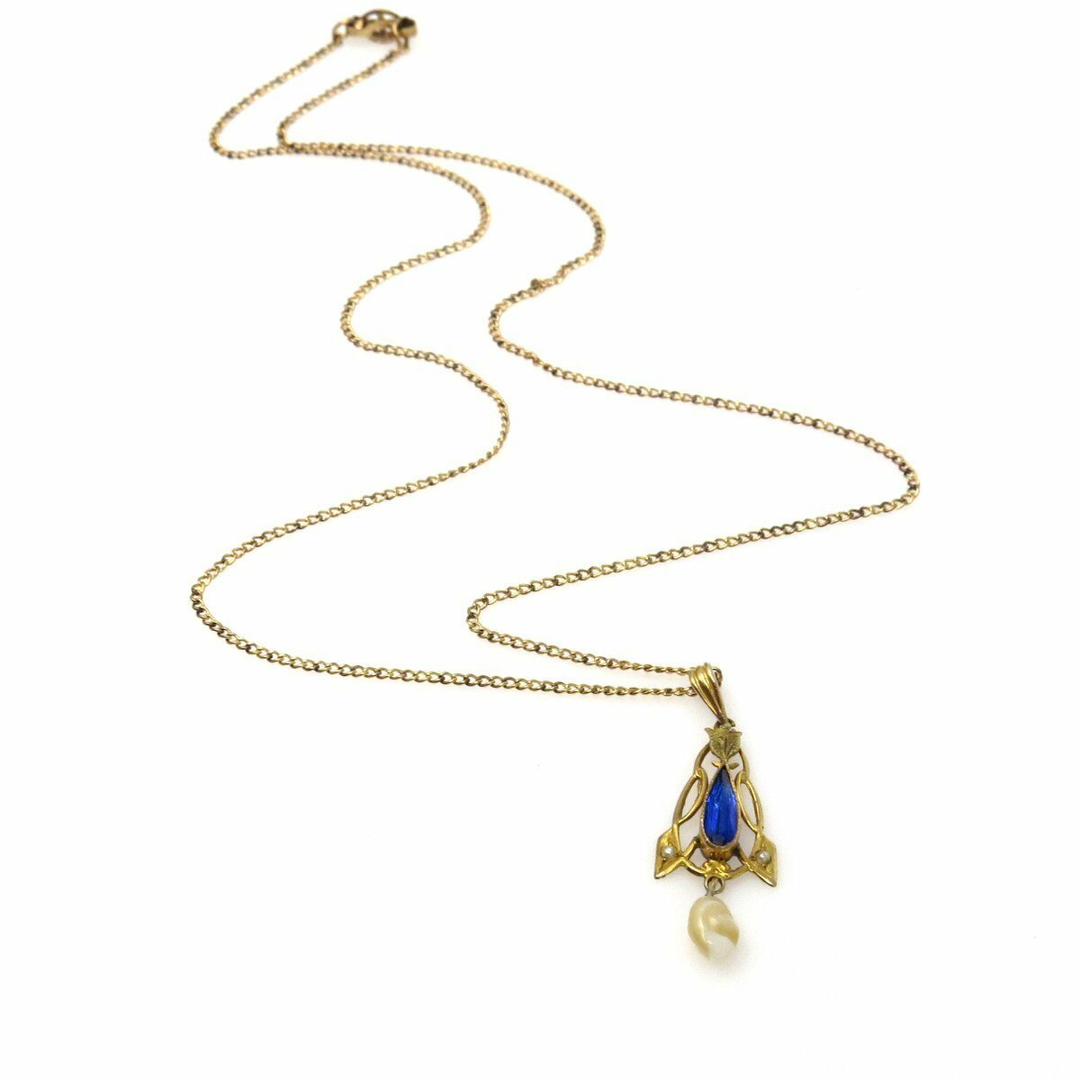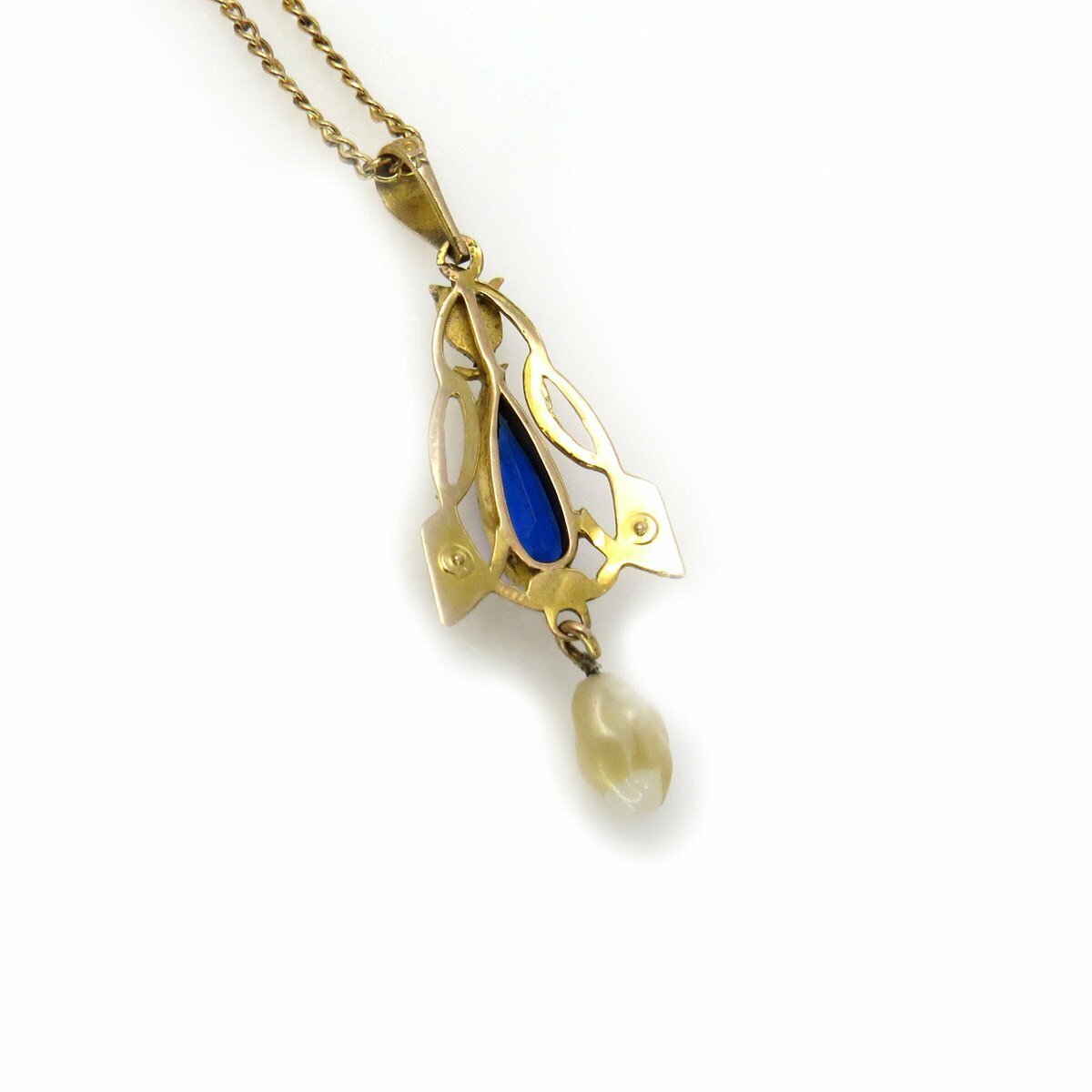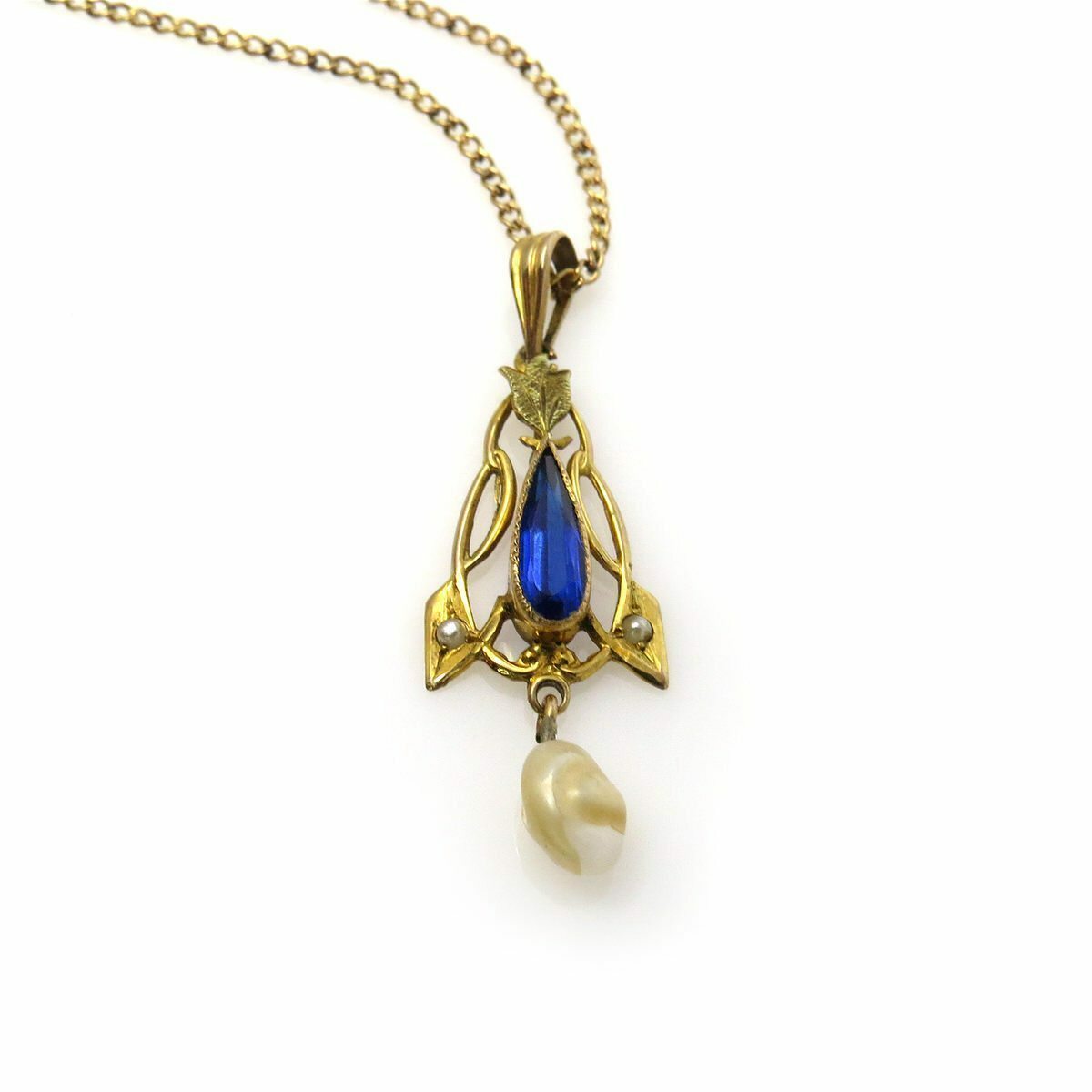 Above the blue stone setting is an applied green gold leaf. The center drop is a natural (not cultured) baroque pearl.