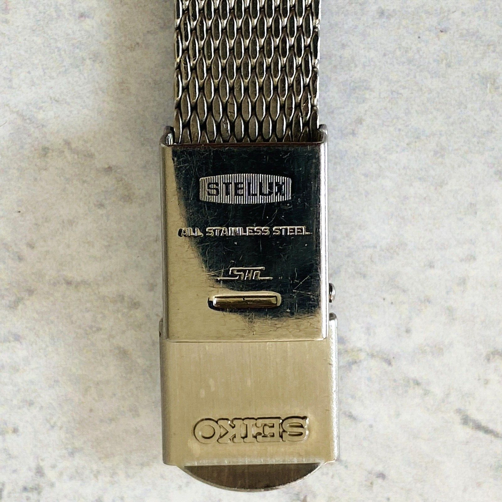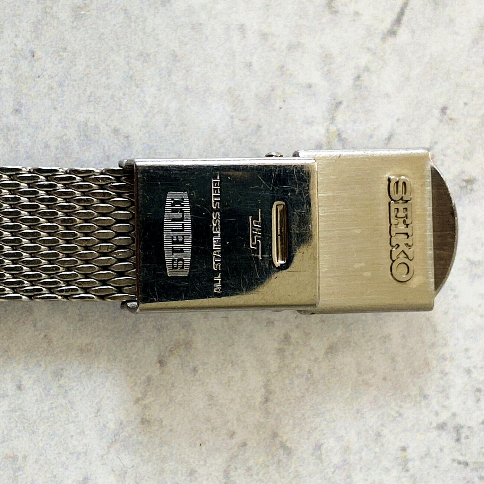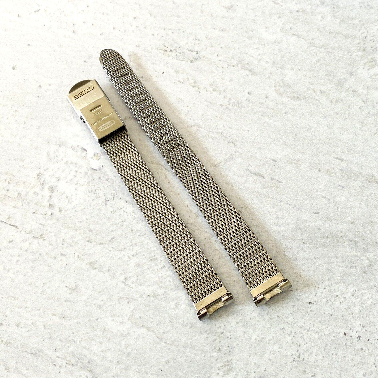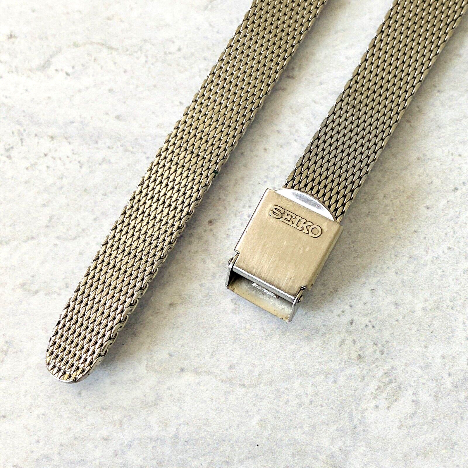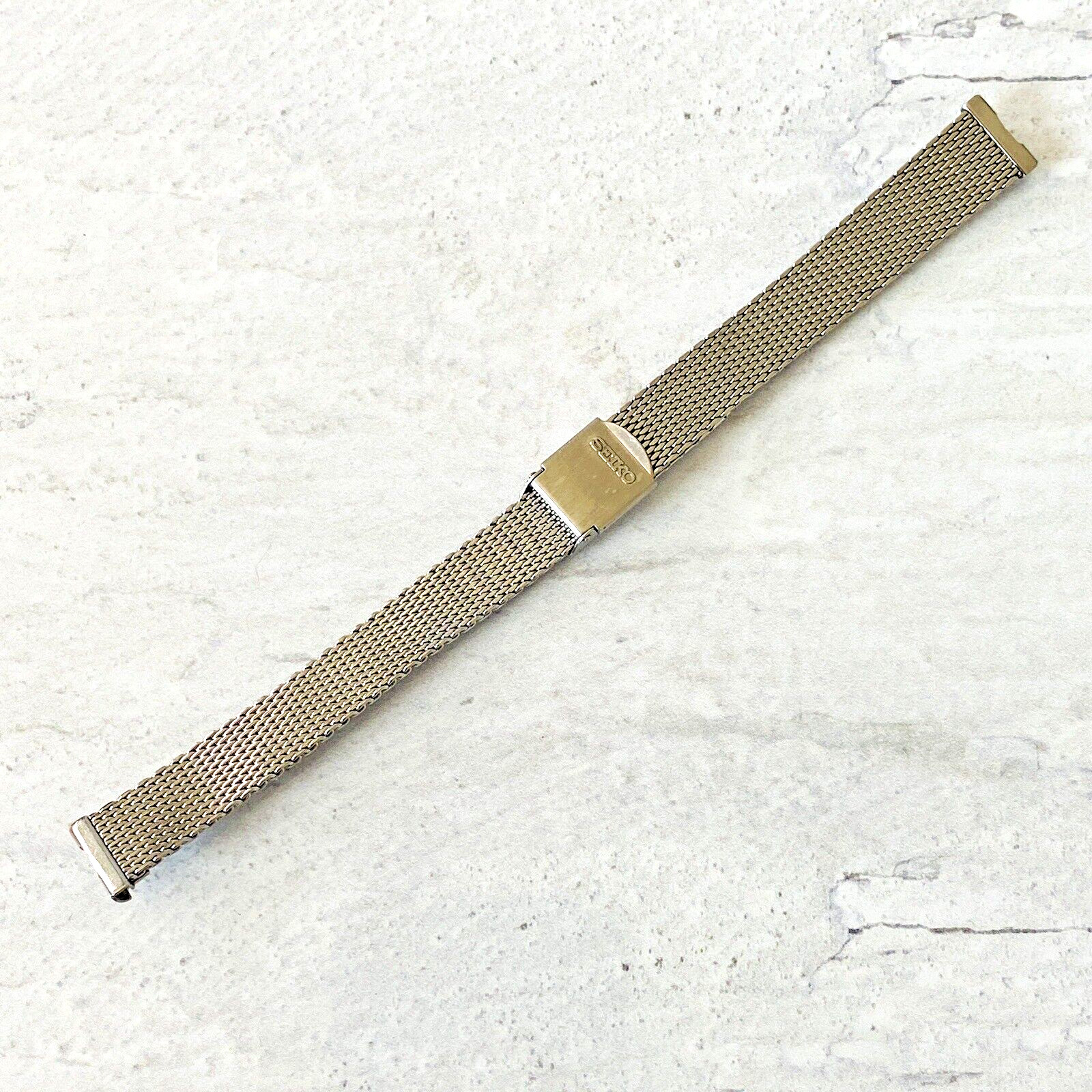 It has 12mm lugs. It is a stainless steel mesh two-part band with the Seiko logo embossed at the snap buckle.