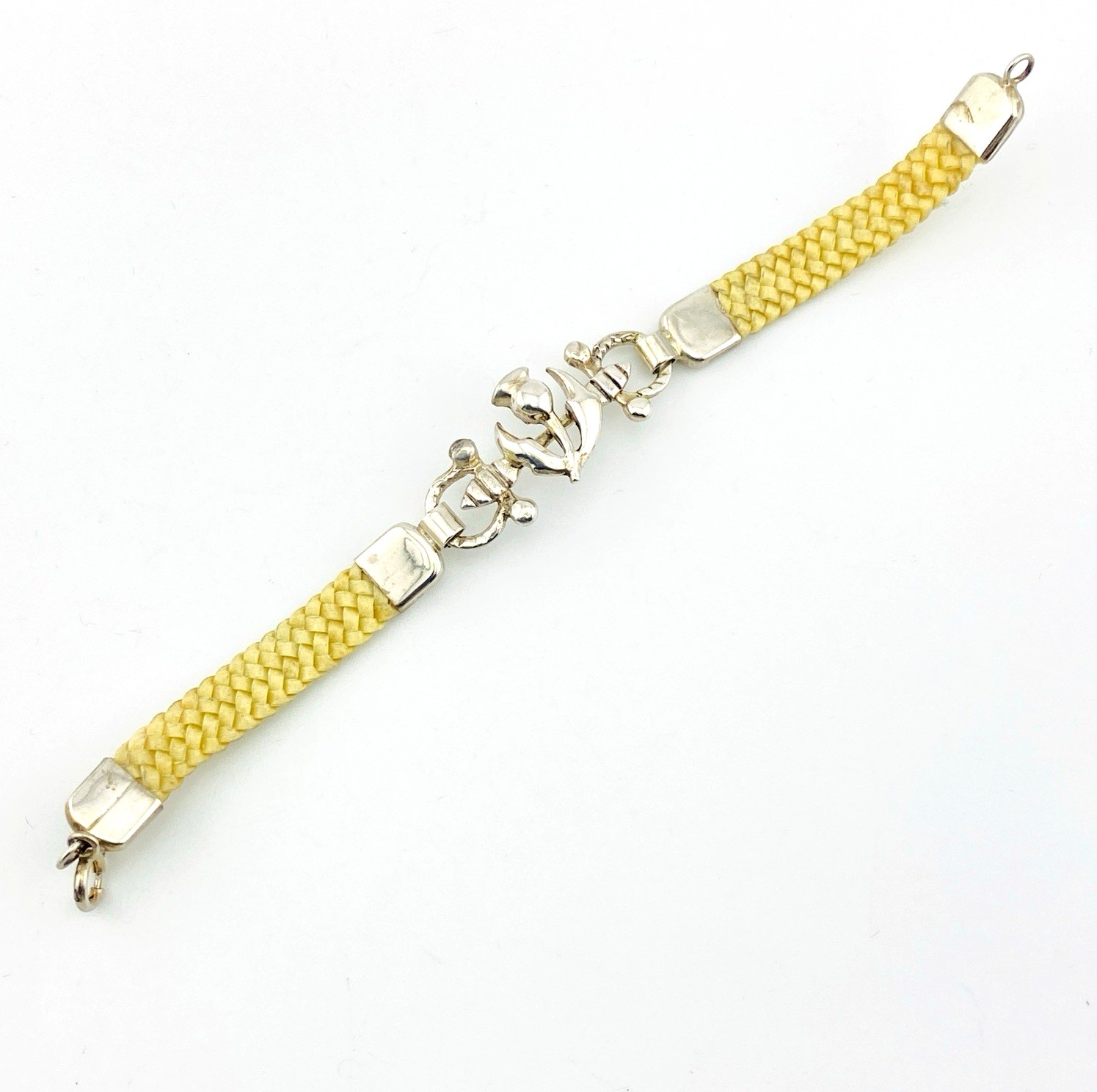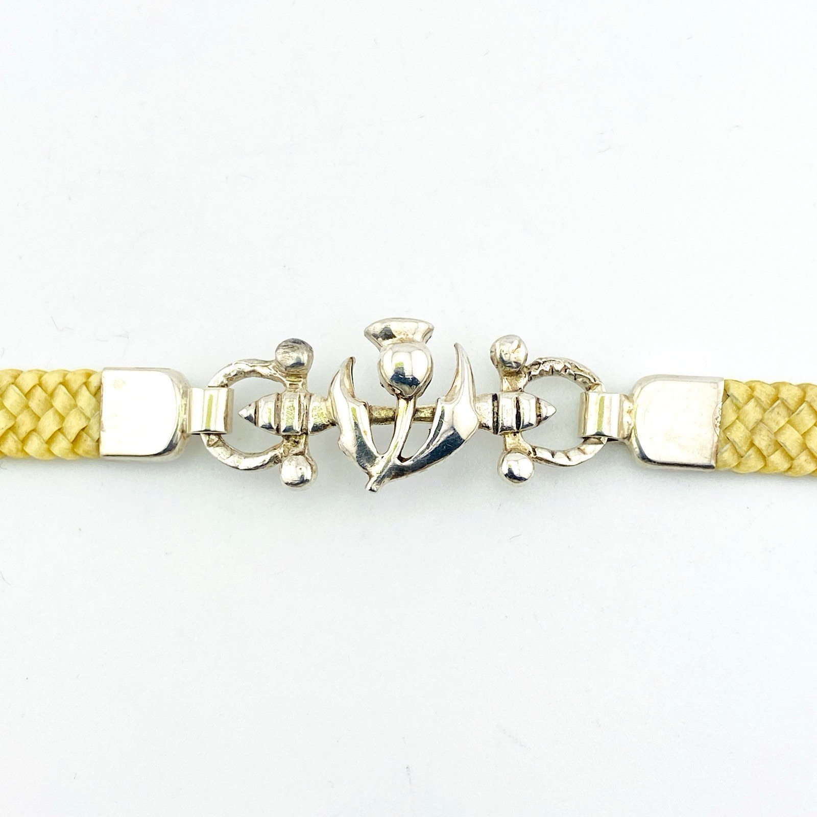This vintage bracelet features a dimensional openwork thistle centerpiece crafted in 900 silver. The thistle—long associated with Scotland—rests atop paired horse-bit forms and is finished with two tightly woven linen bands, creating a distinctive texture and refined artisan appearance.