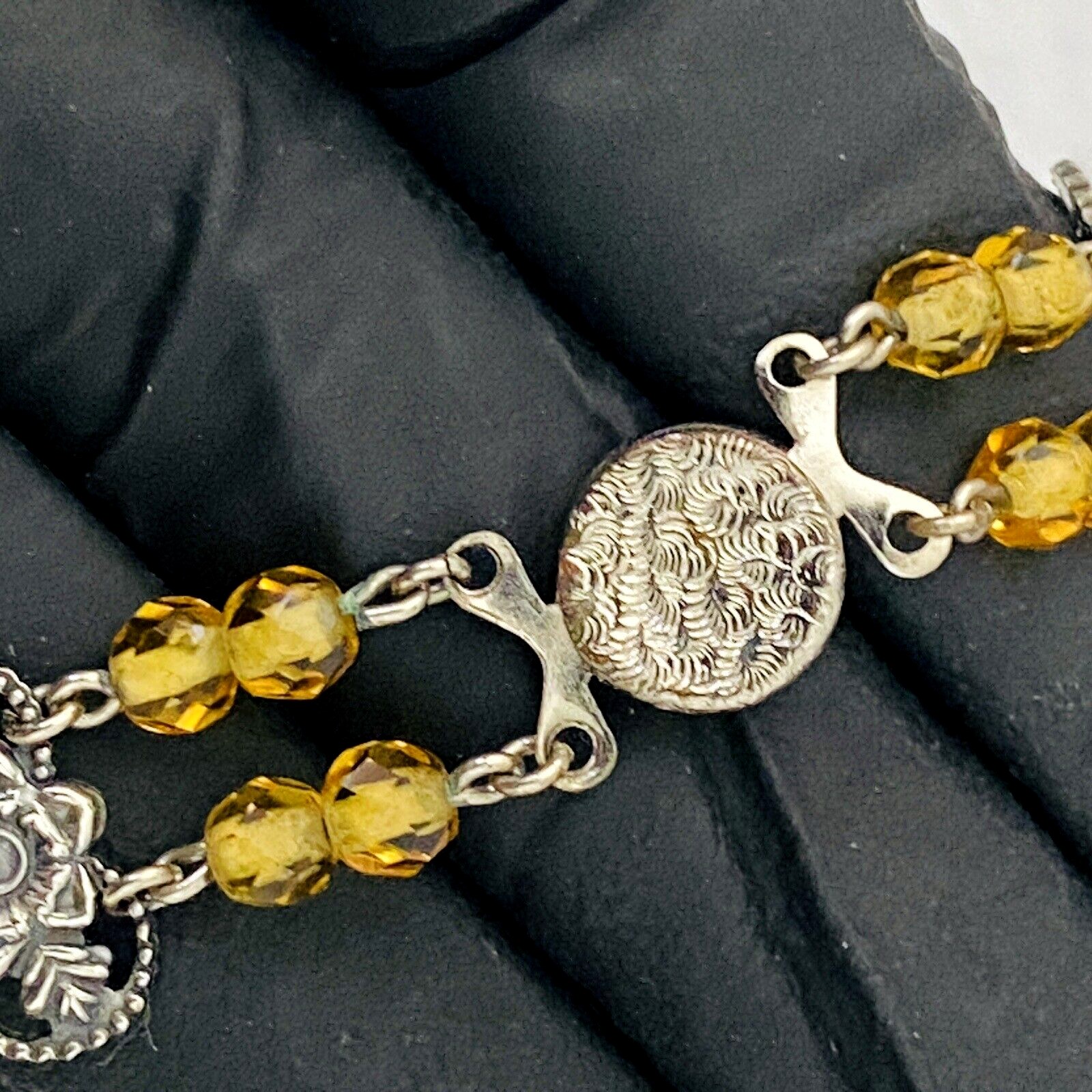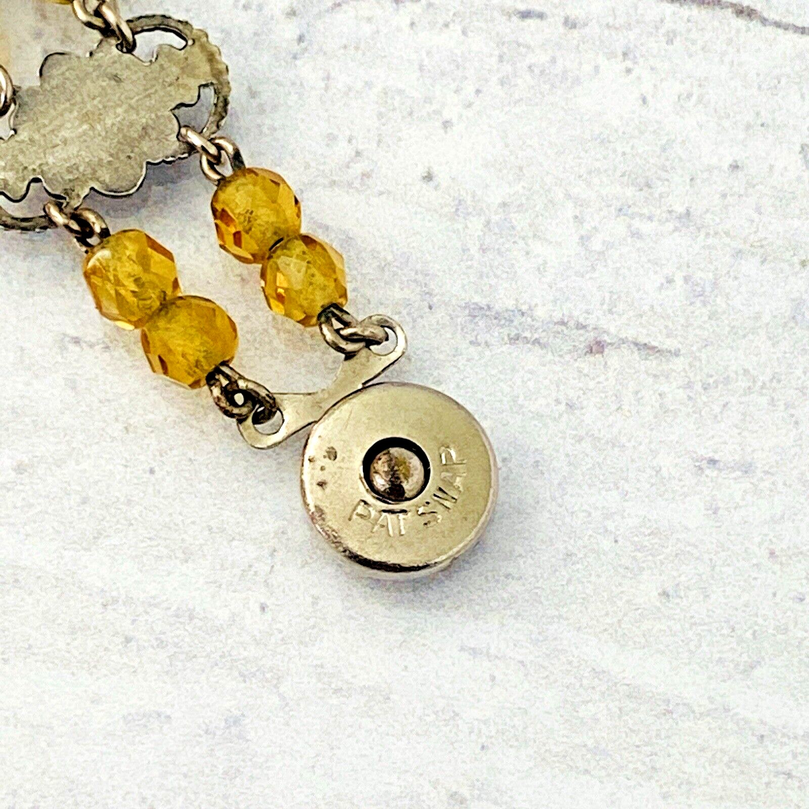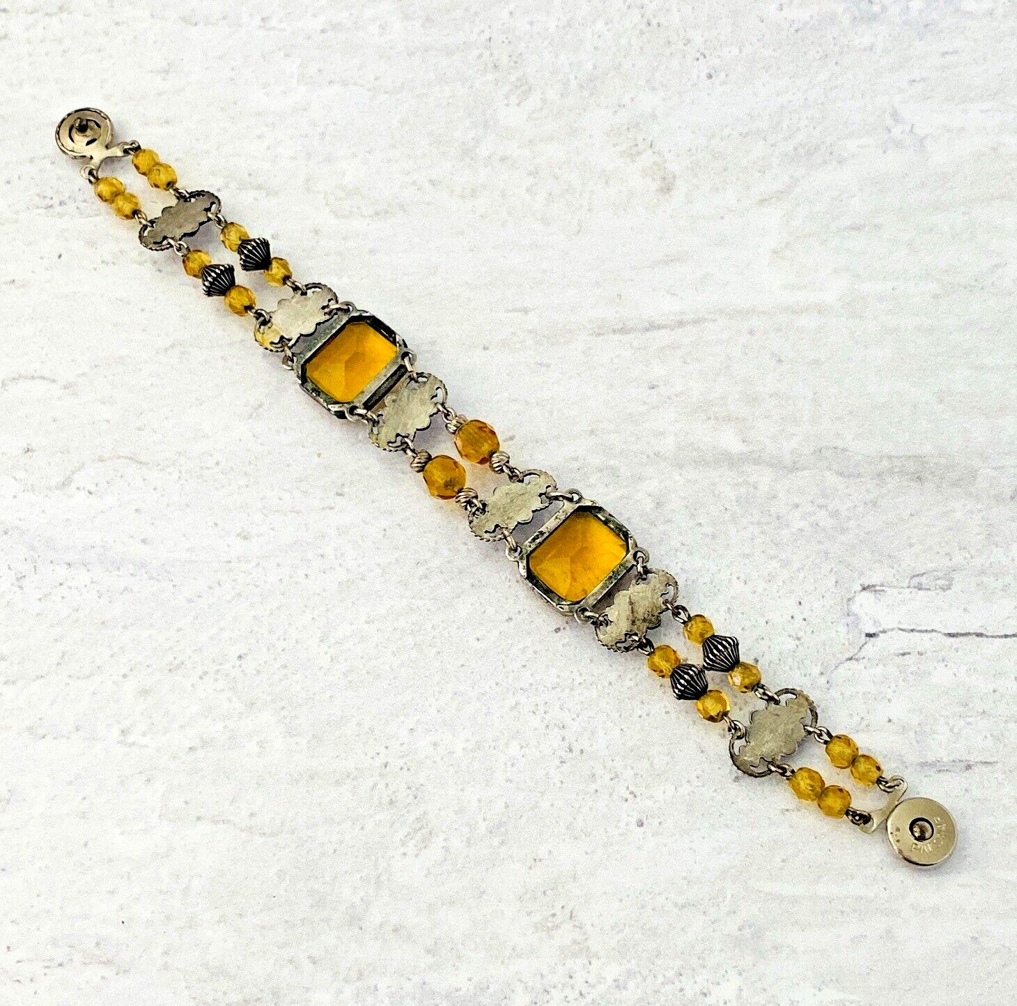 This beautiful vintage bracelet showcases classic Czech glass craftsmanship, featuring warm citrine-colored glass beads and faceted crystals set against silver-tone metal. The design combines stamped floral bar links with softly glowing glass elements, creating a balanced mix of structure and sparkle.
