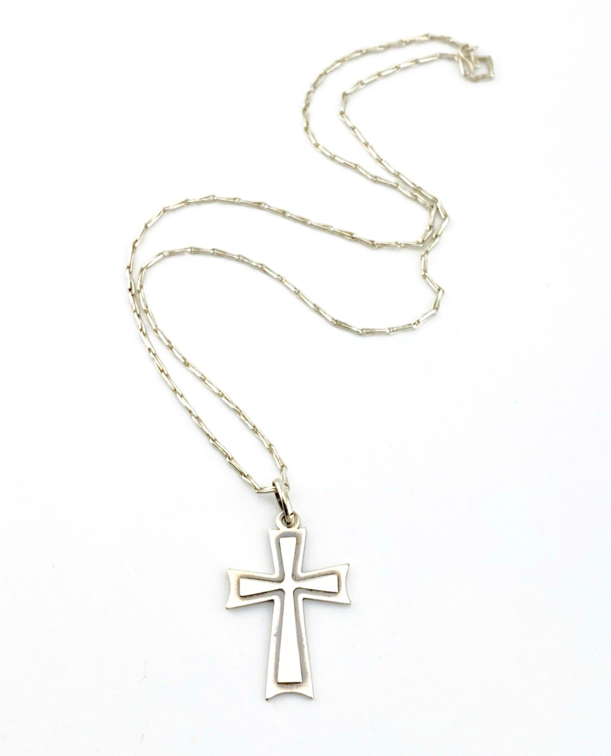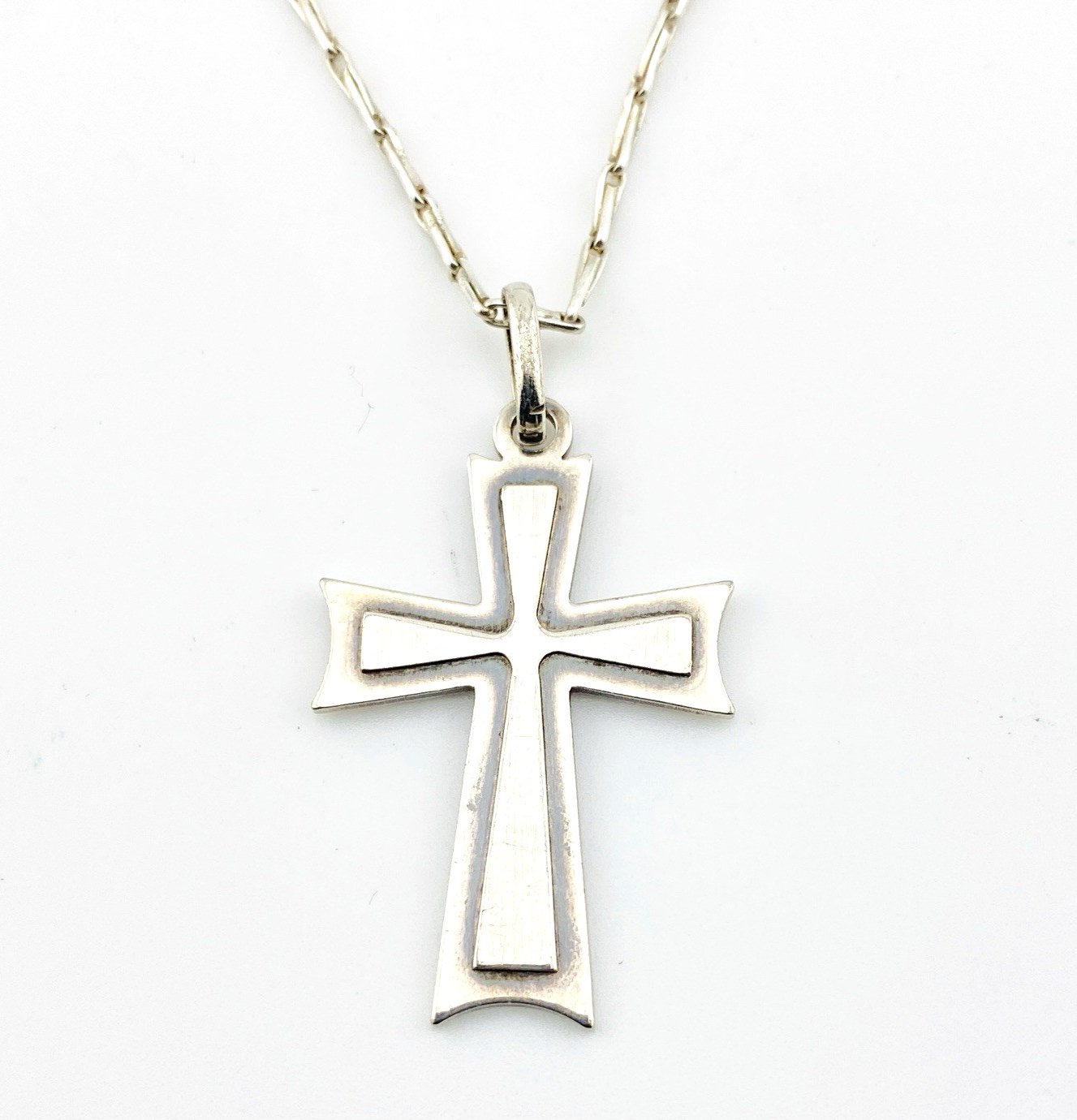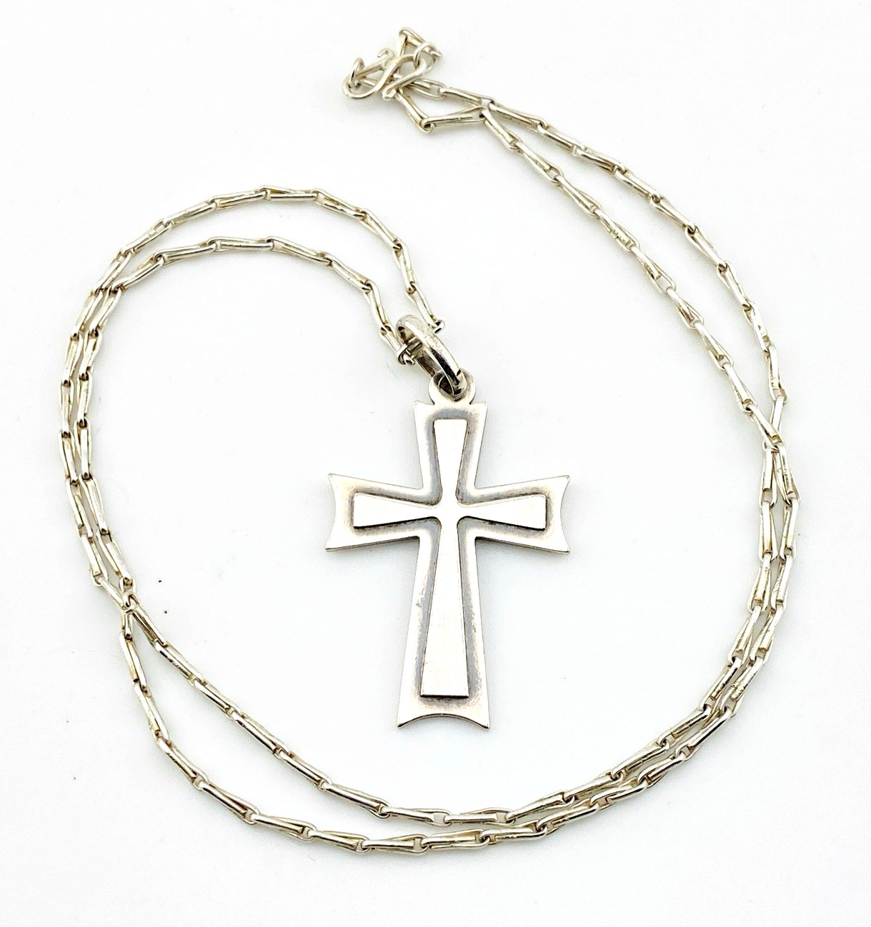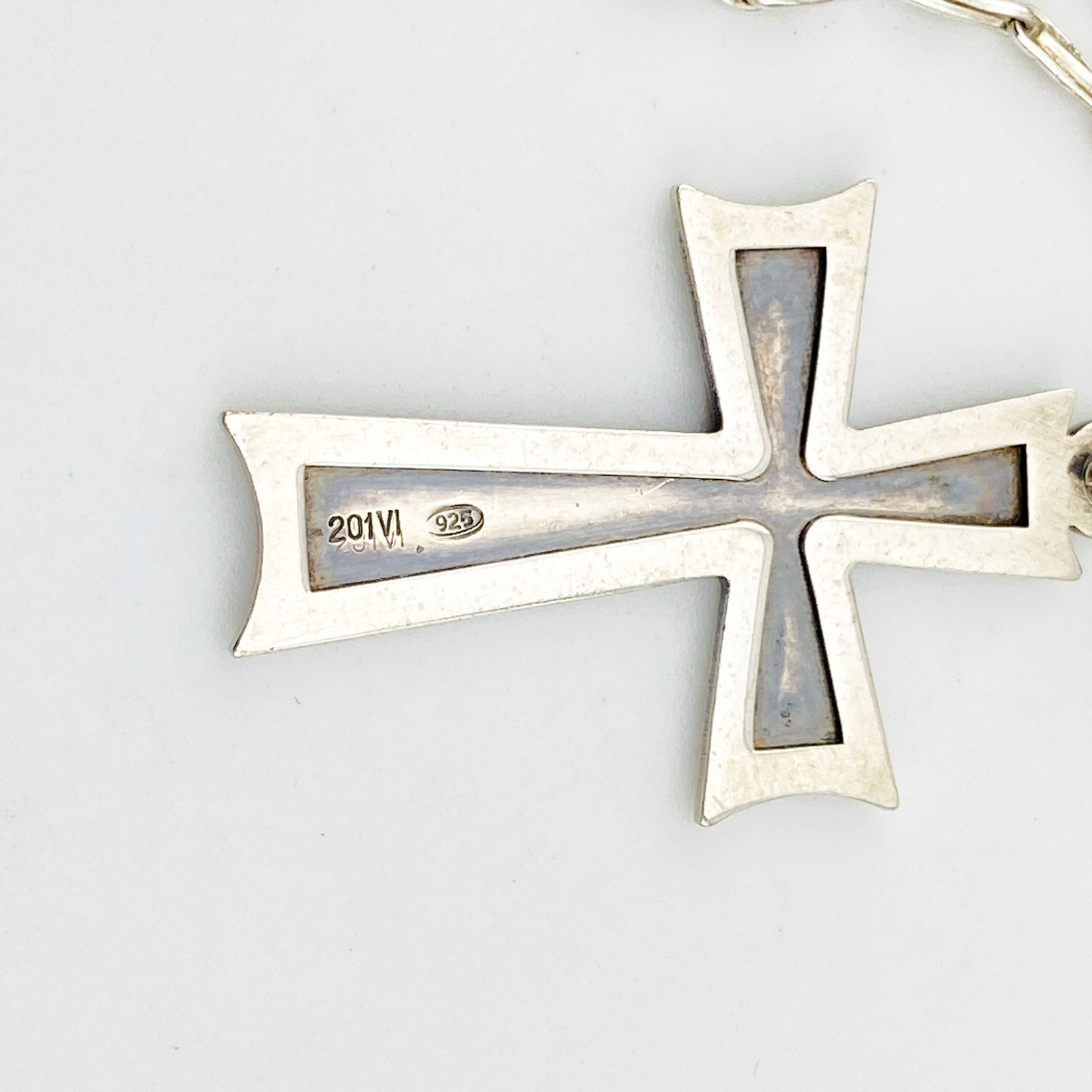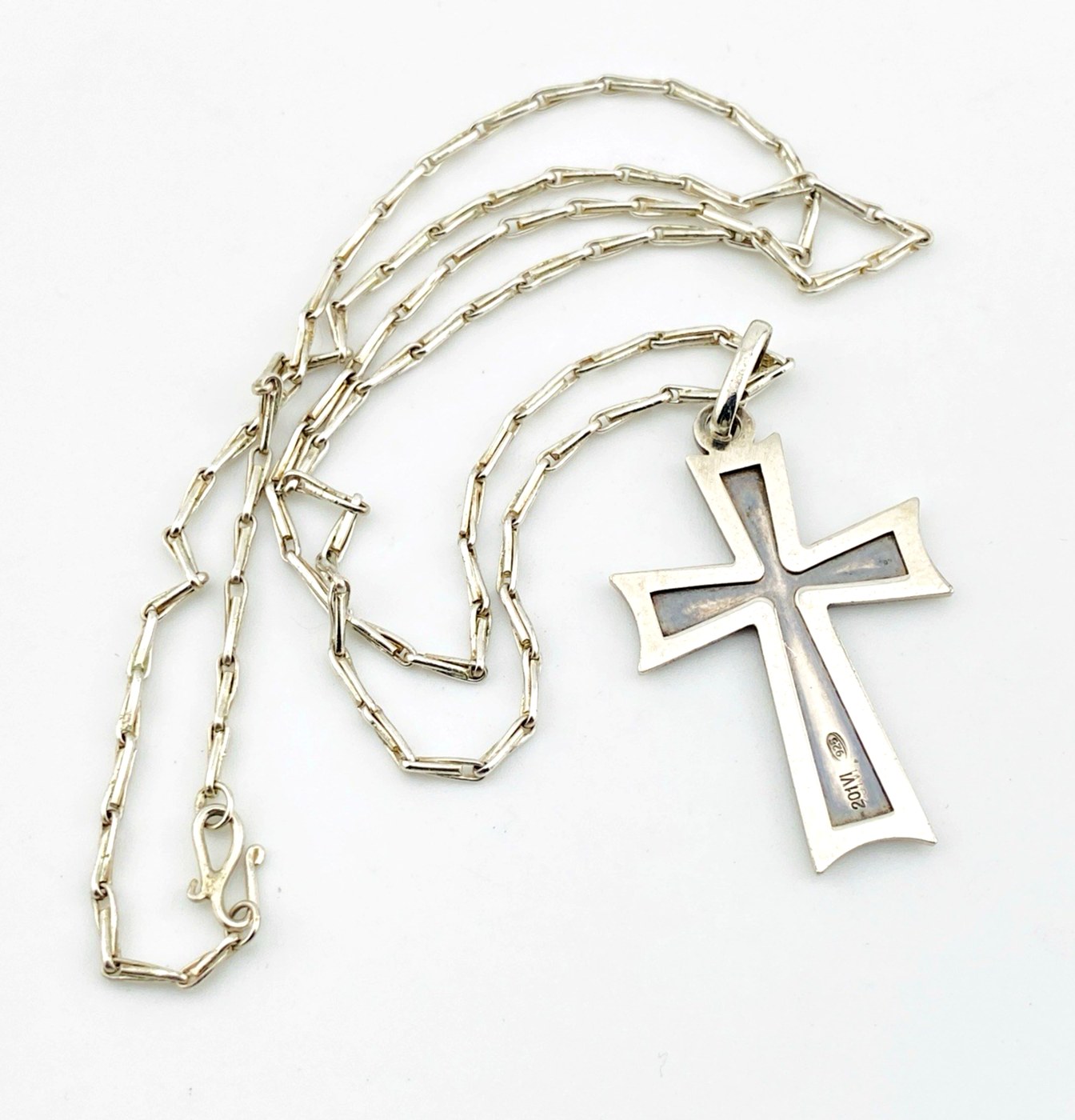 A beautiful cross pendant on a handcrafted, tight paperclip chain, approximately 19 inches long, and in excellent condition, marked on the pendant. The chain has been acid tested to verify the sterling content.