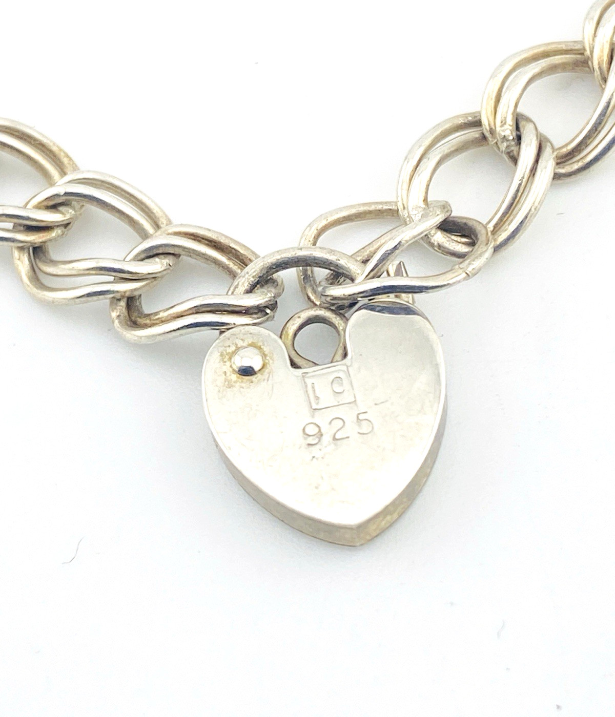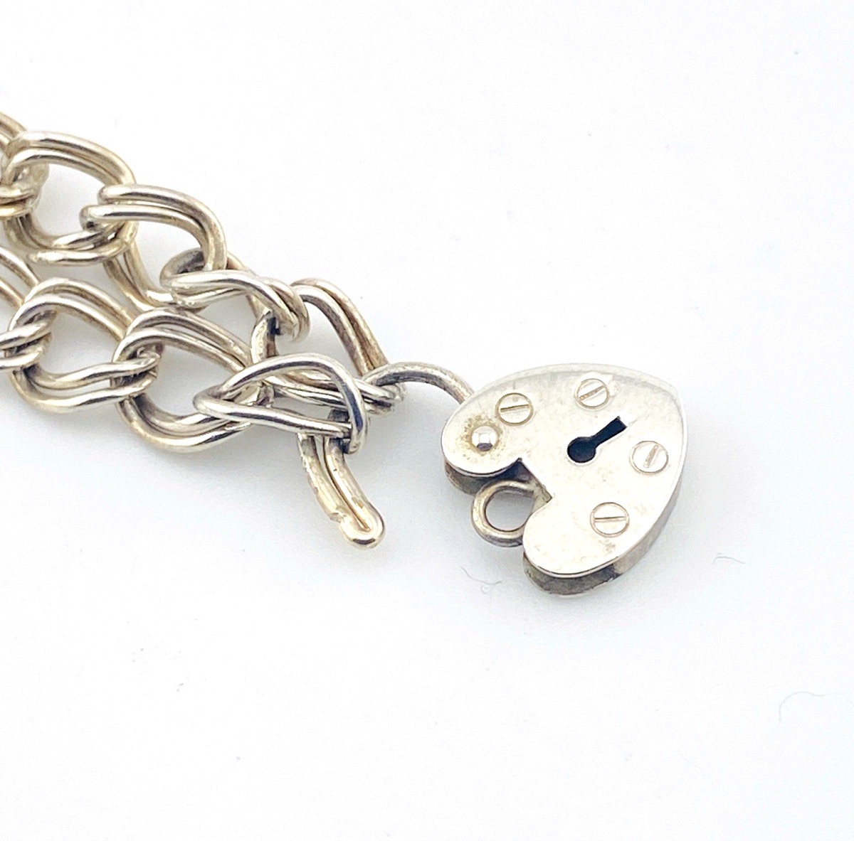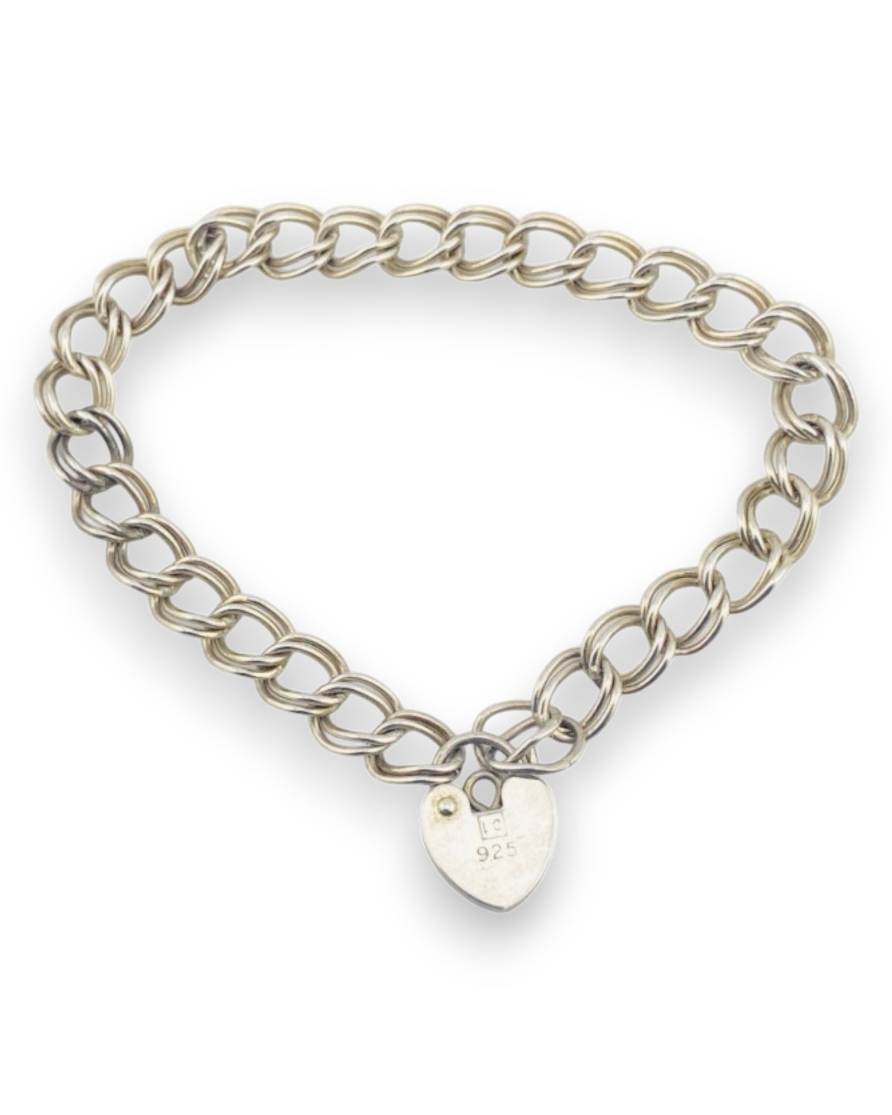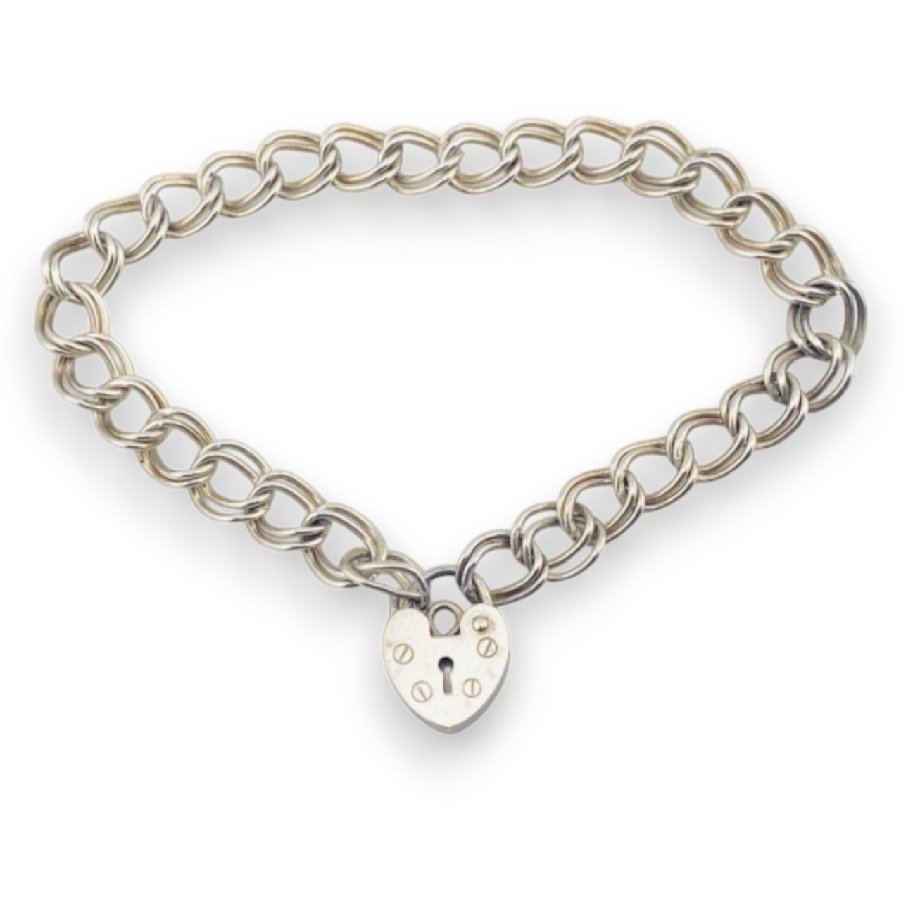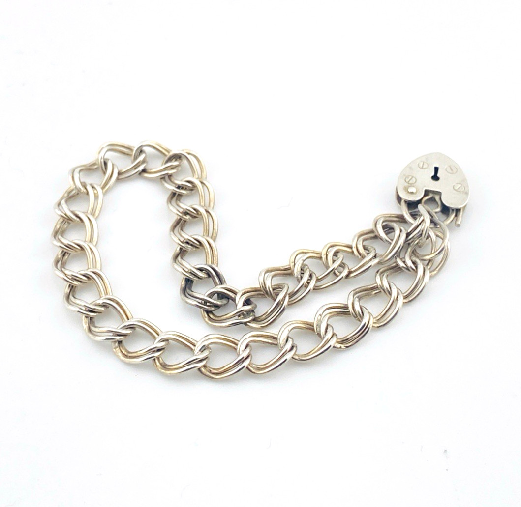 A timeless vintage sterling silver bracelet featuring a classic double curb link chain finished with a heart-shaped padlock clasp. Clean, versatile, and quietly distinctive, this piece offers both function and charm in a traditional design.