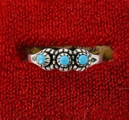 A delicate Bell Trading Post sterling silver petit point turquoise band ring that can be stacked with other rings or bands. This type of setting is also called snake eyes.