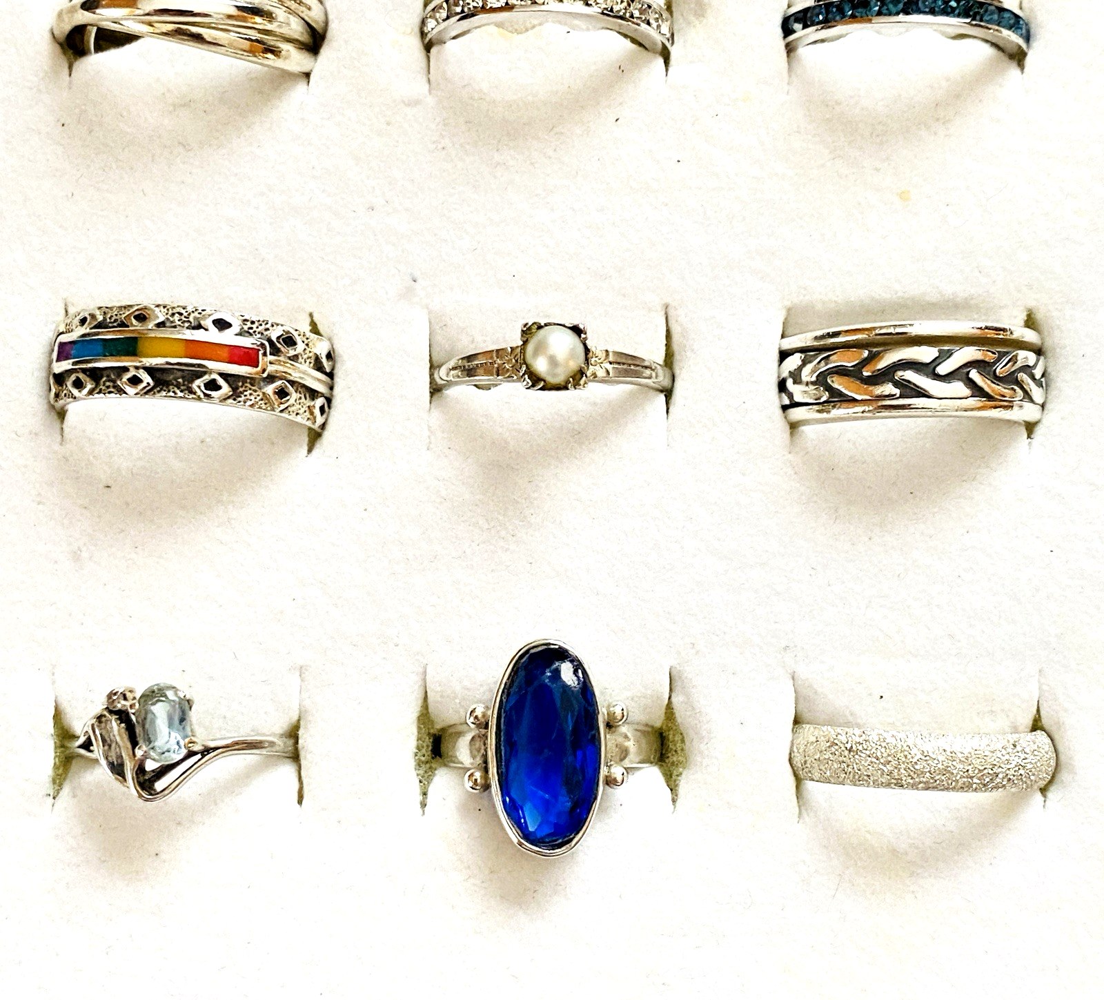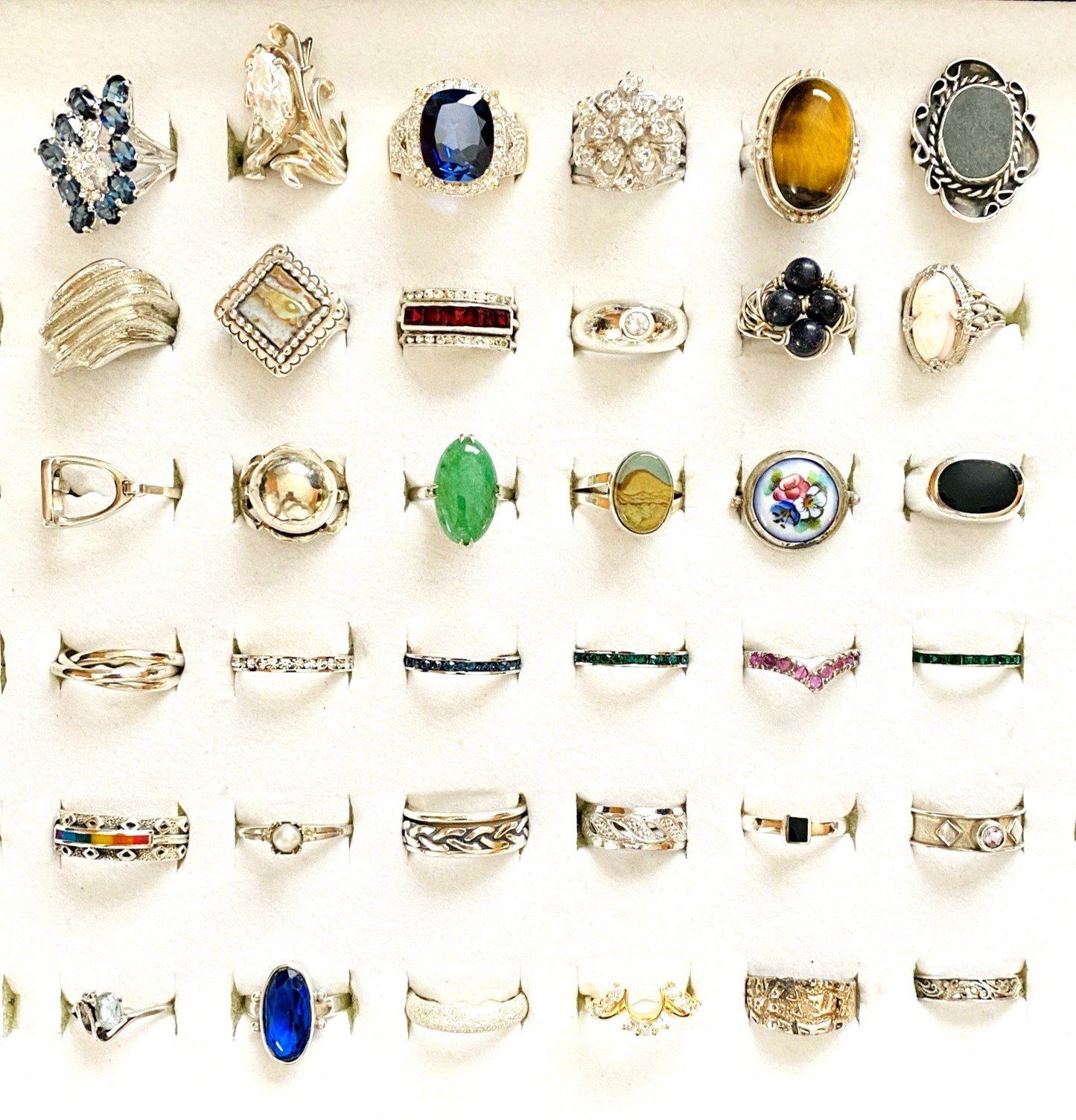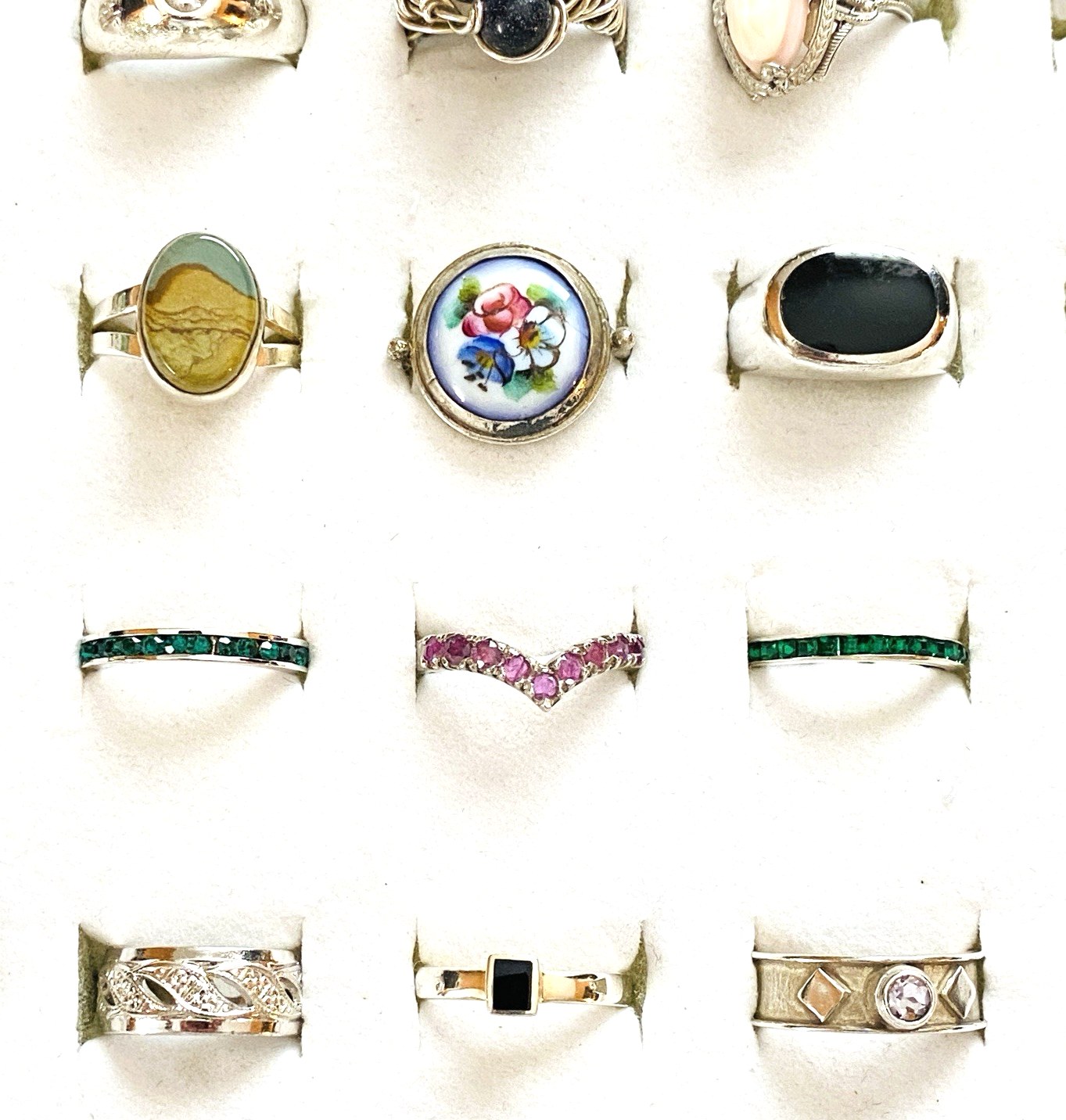 This fabulous lot totals 36 different rings. Of these, 35 are sterling silver, marked or tested. 1 is silver-plated (floral finifit enamel), and 1 is set with a hand-carved pink shell cameo. There is a great assortment of styles and ages, and a fabulous group of unusual gemstones.