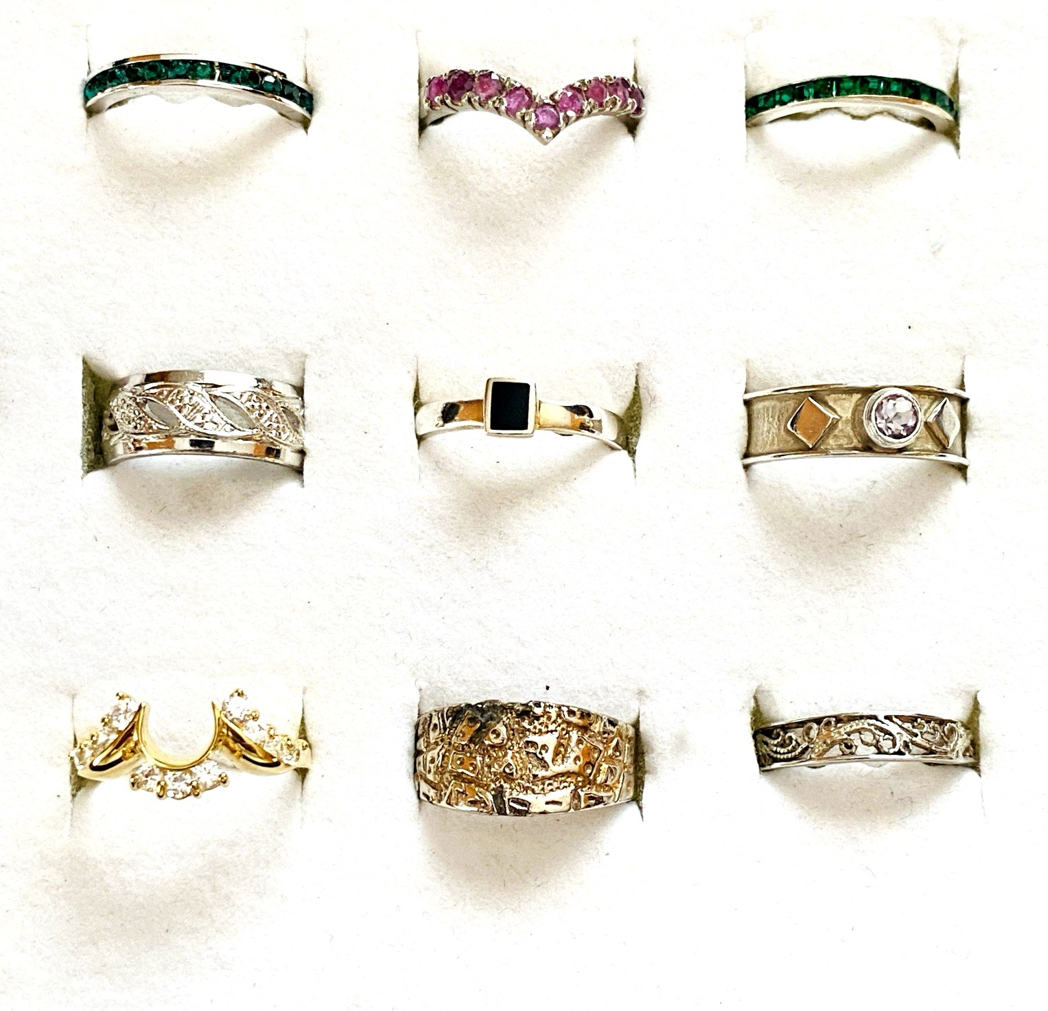 Styles range from classic infinity bands set with sapphire and CZ to the brutalist artisan-made cubic zirconia ring. There are at least two Mid-Century. All are vintage, ranging in age from the 1950s to contemporary, a spinner band ring with a rope design and the rainbow colored enamel.