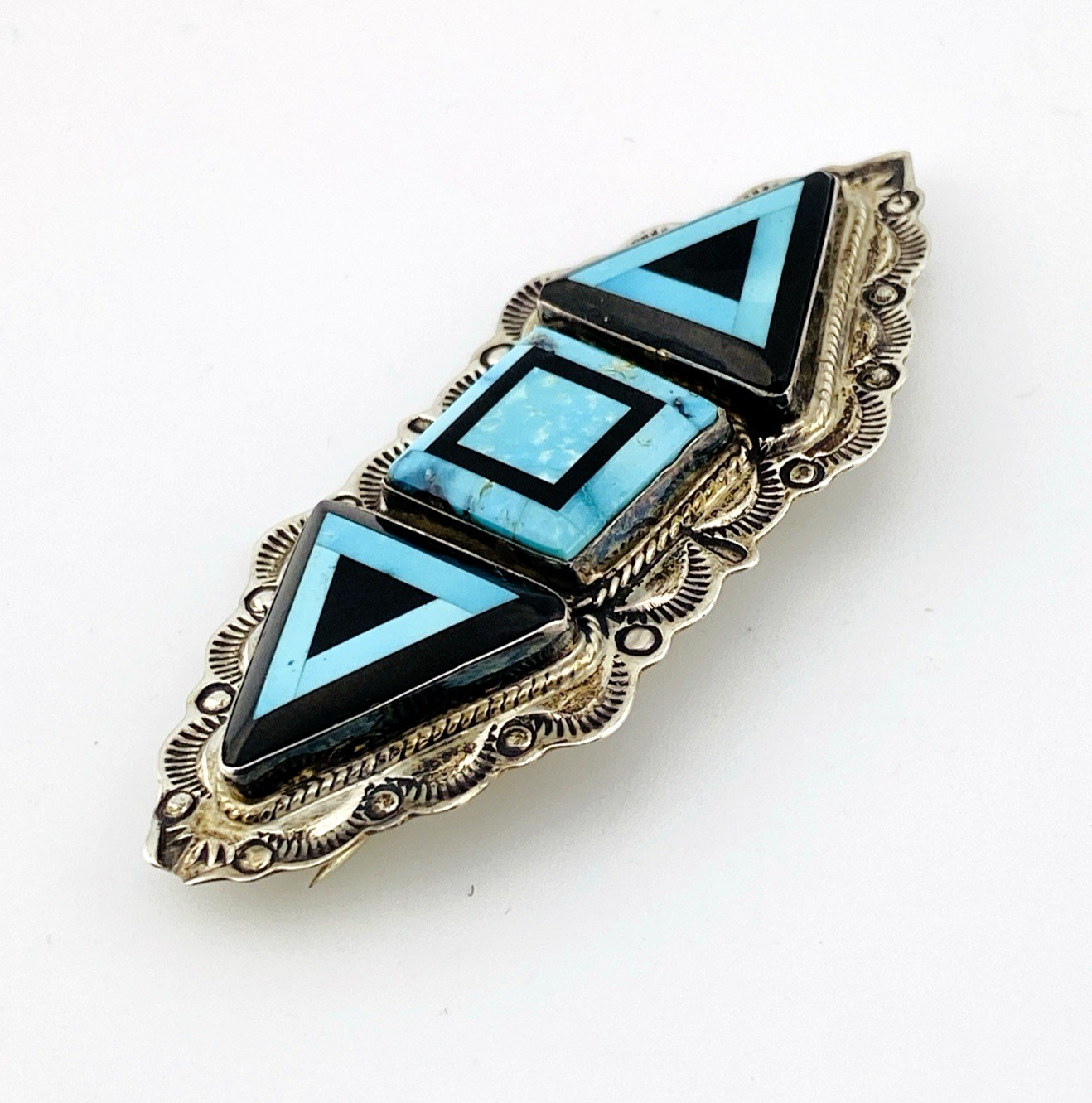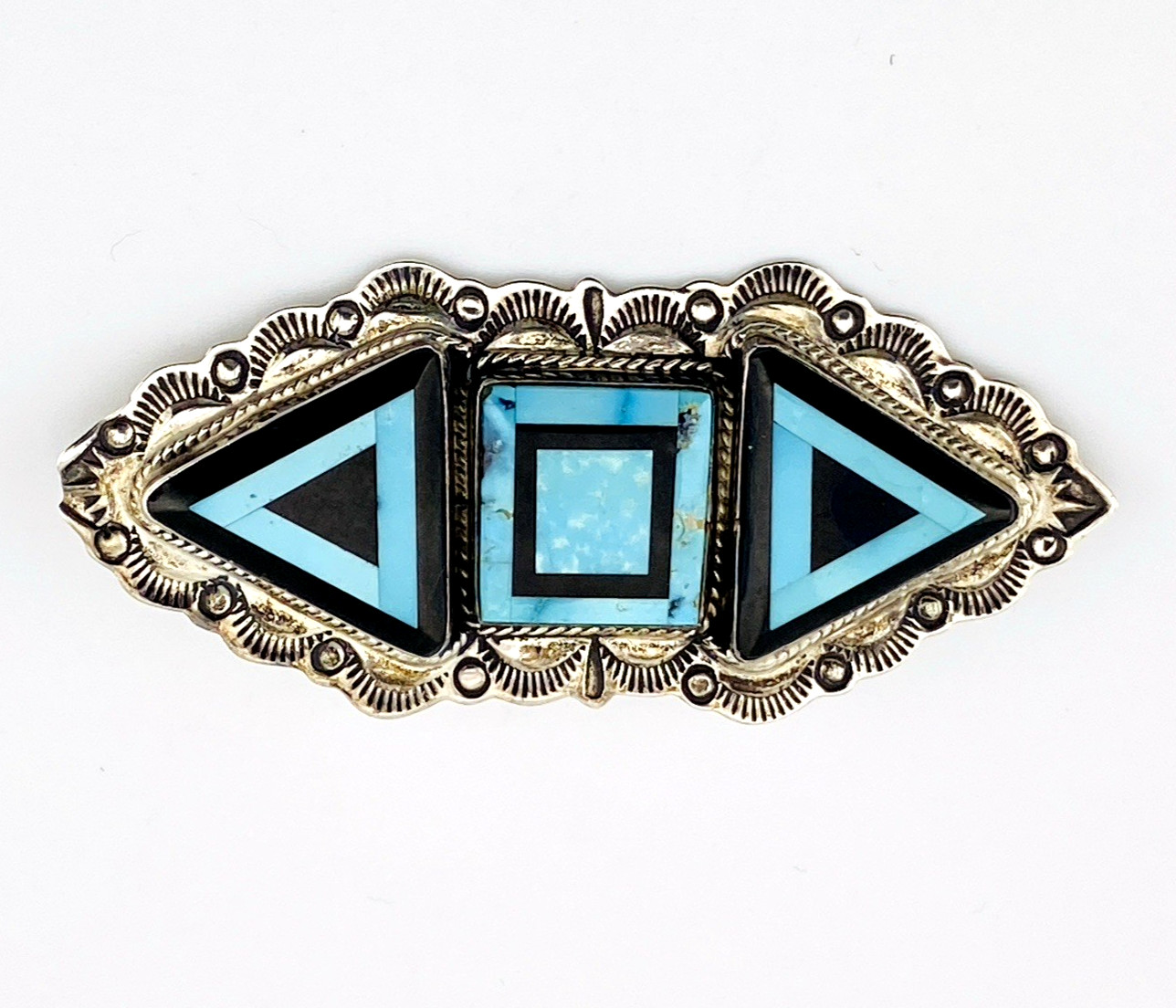 The design balances clean, architectural shapes with traditional silverwork. Triangular and square inlay panels are carefully fitted to create crisp contrast between vivid turquoise and deep black onyx, framed by a detailed, hand-stamped sterling border. The result is graphic and sculptural, with strong mid-century modern influence.