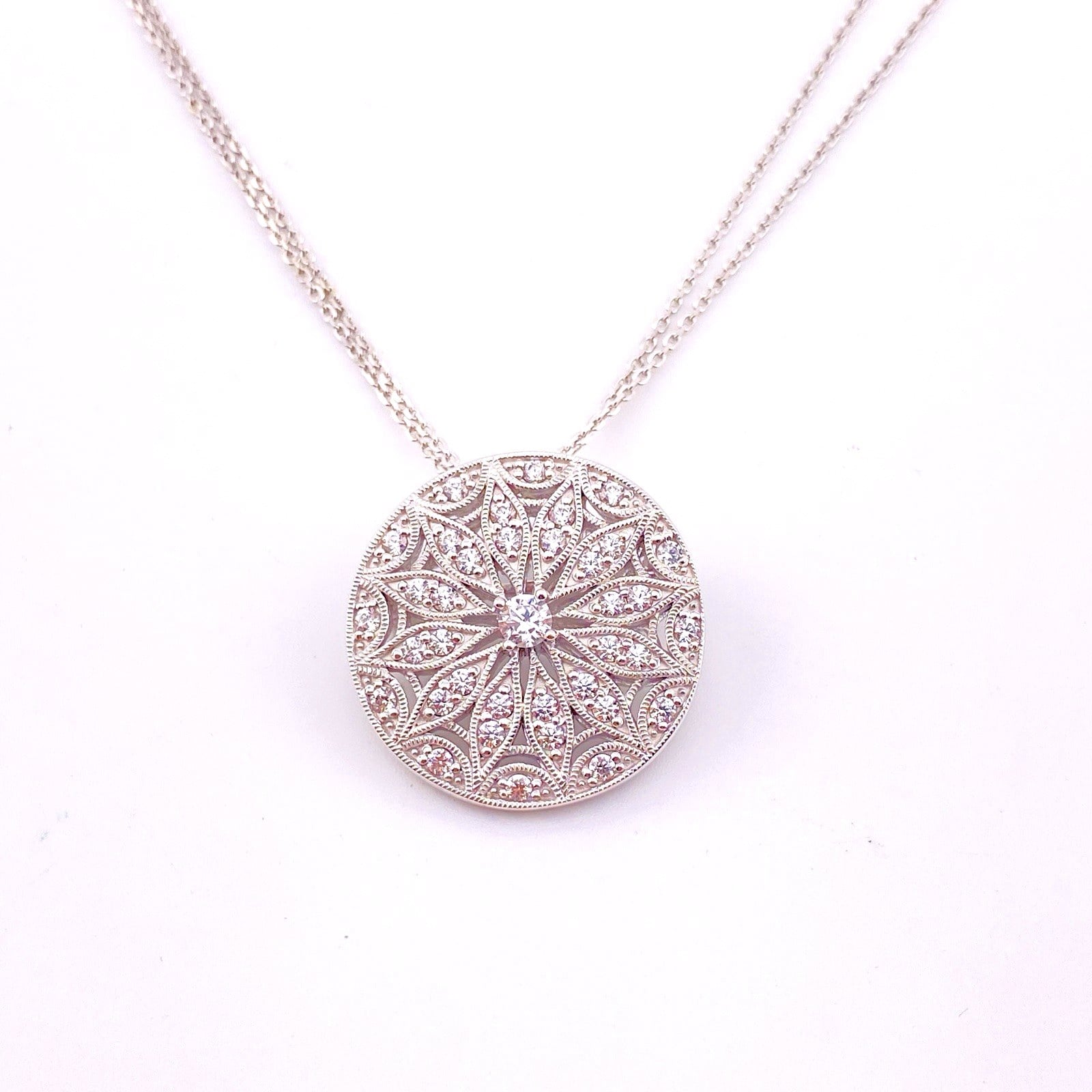 This elegant designer piece by Tacori showcases the brand’s signature attention to detail in a refined openwork mandala design. The circular pendant features intricate filigree-inspired detailing accented with sparkling cubic zirconia, creating a radiant starburst effect.