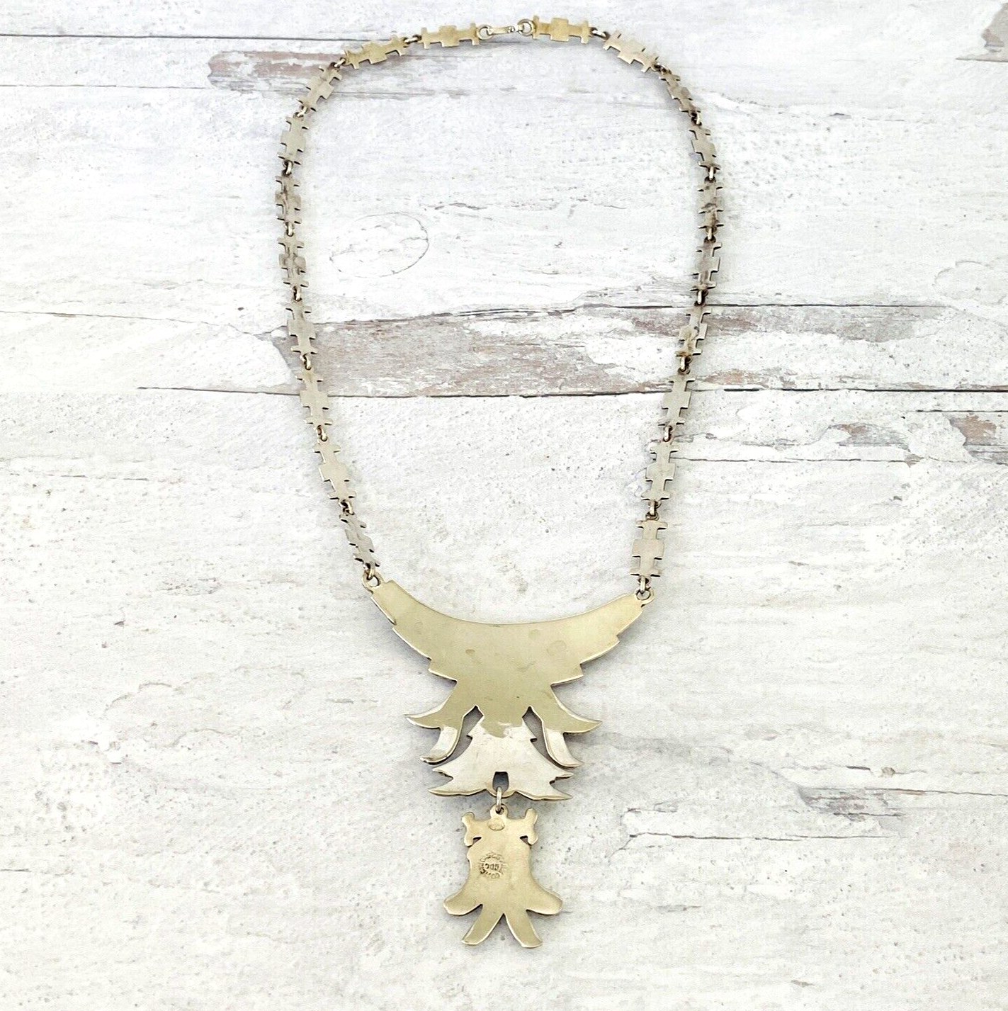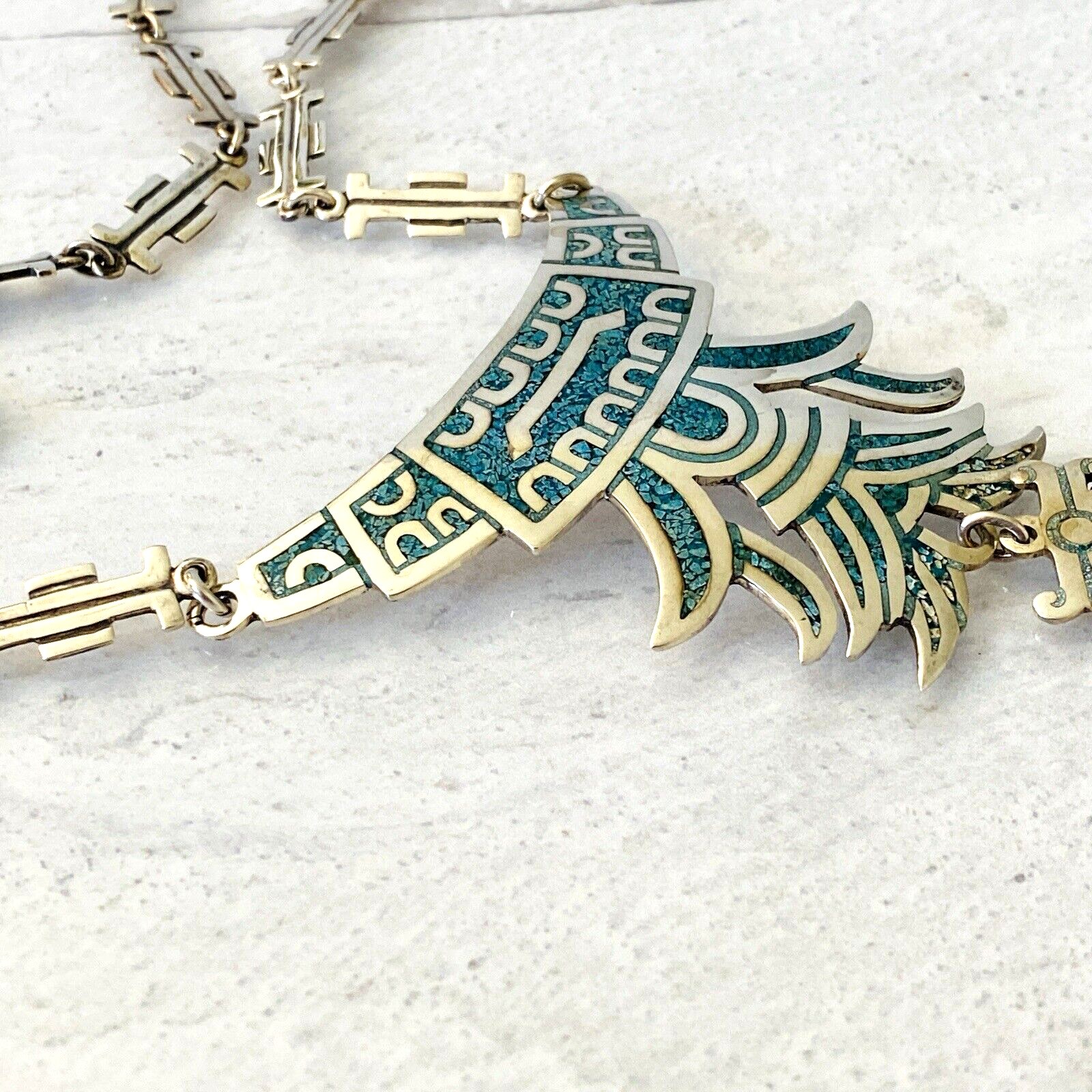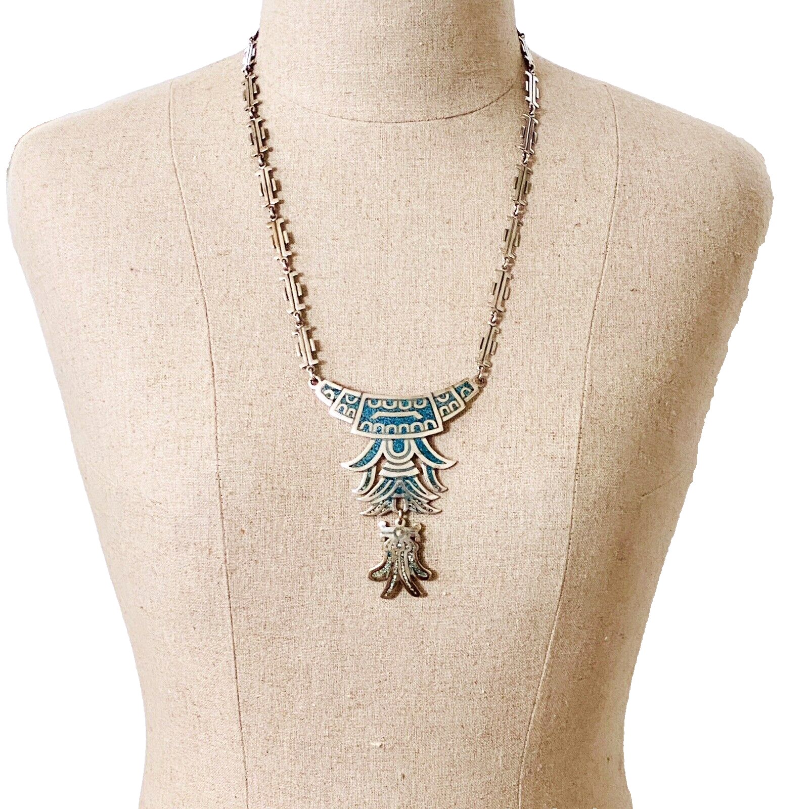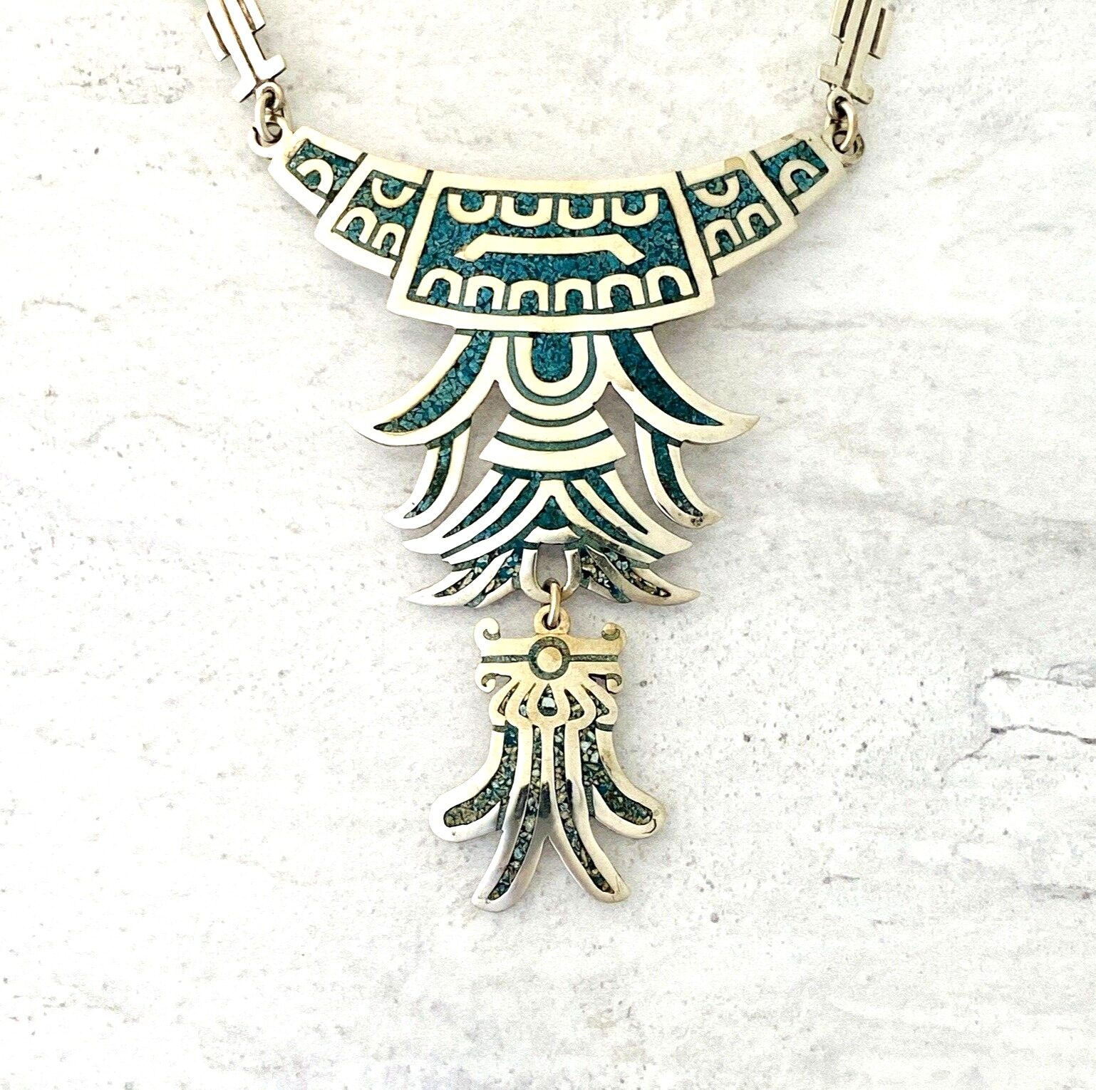 Vintage Taxco Mexican Sterling Silver Turquoise Inlay Necklace – Statement Style and Substantial at 61.4 gr