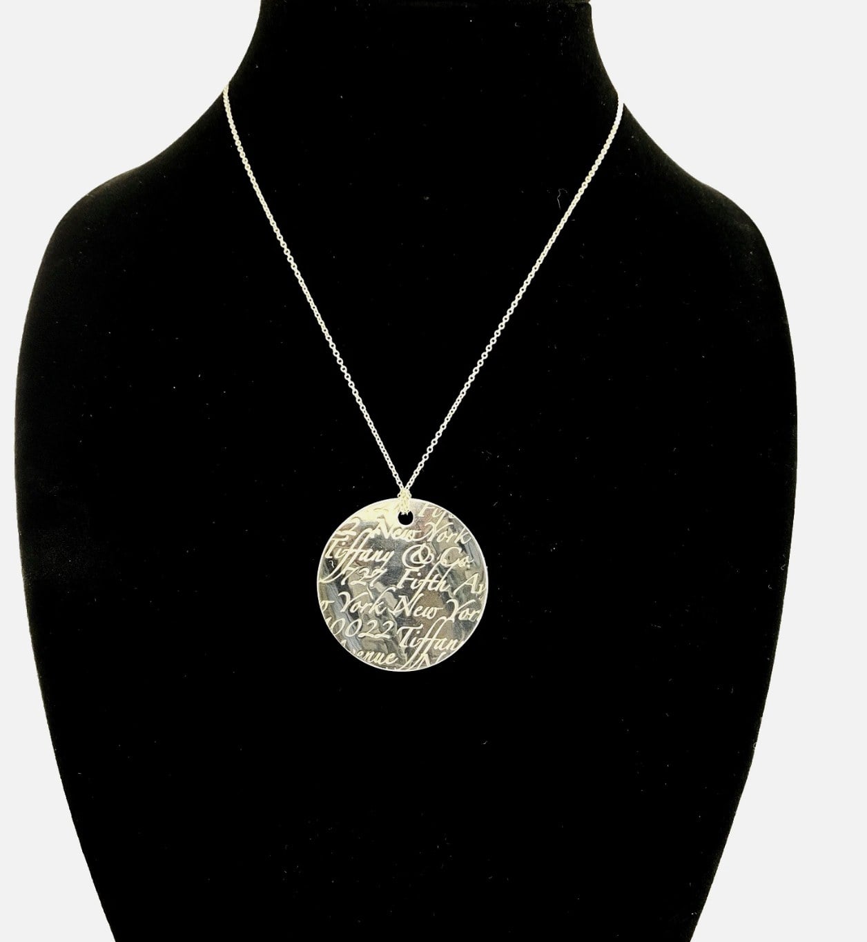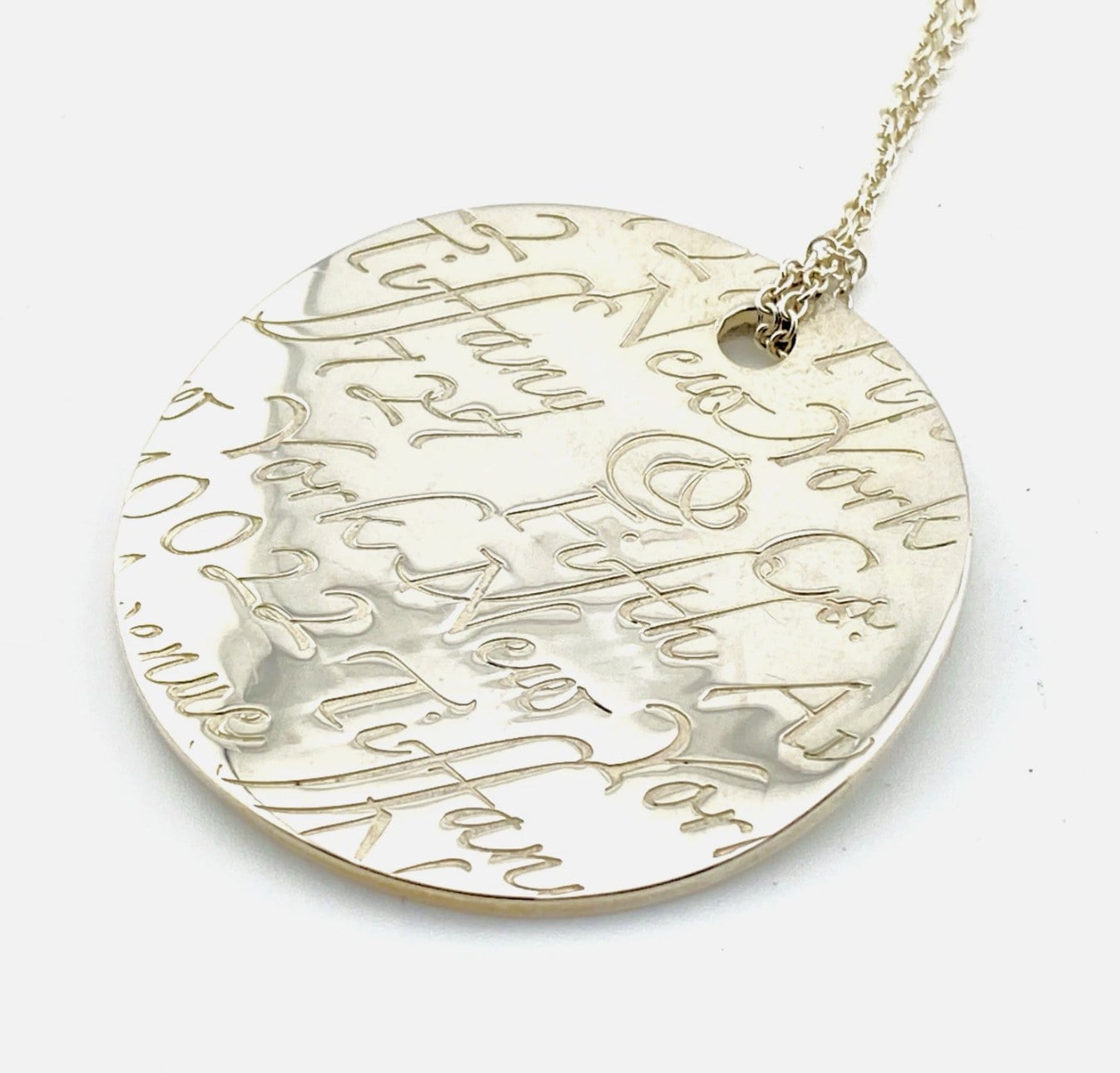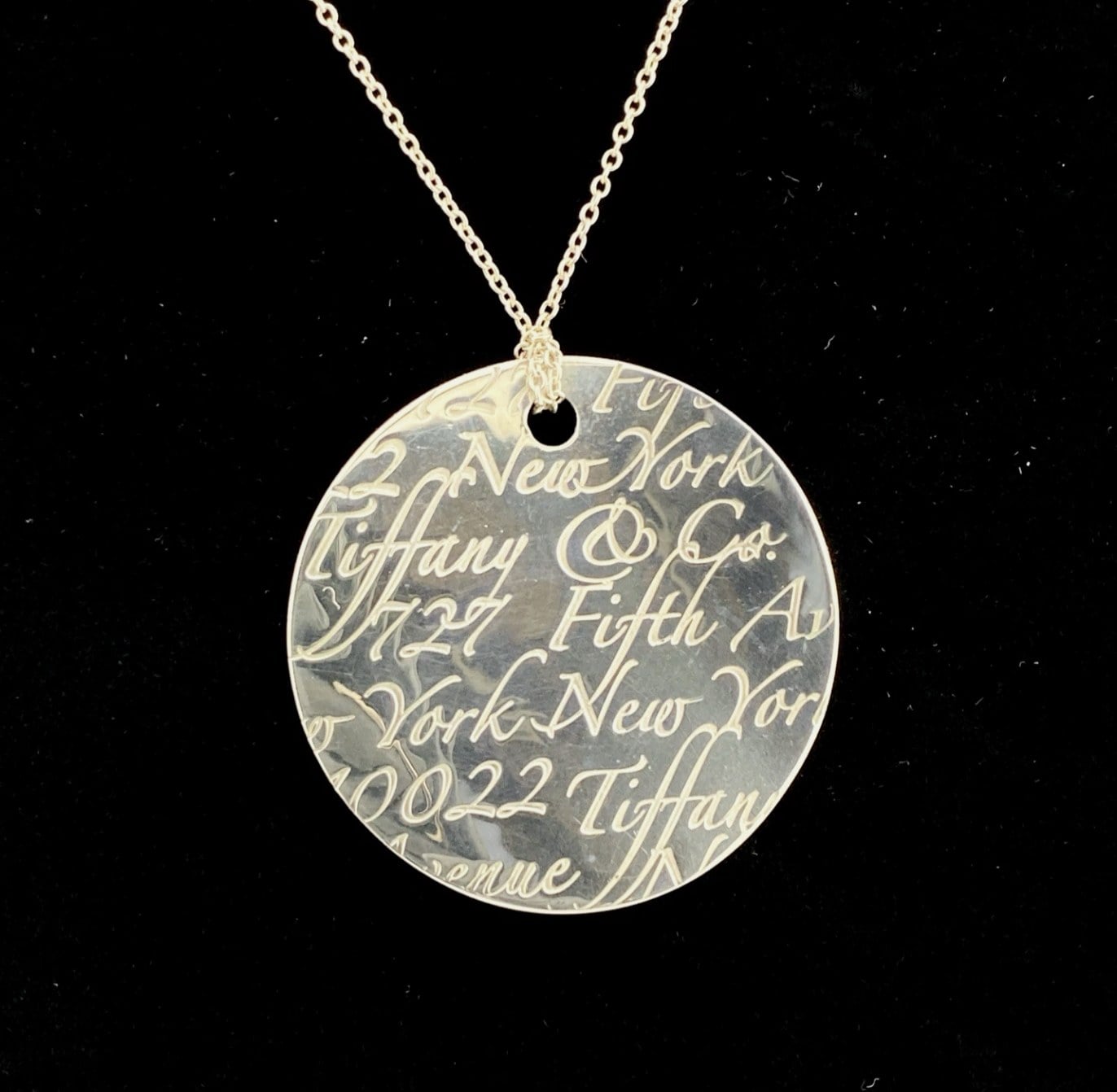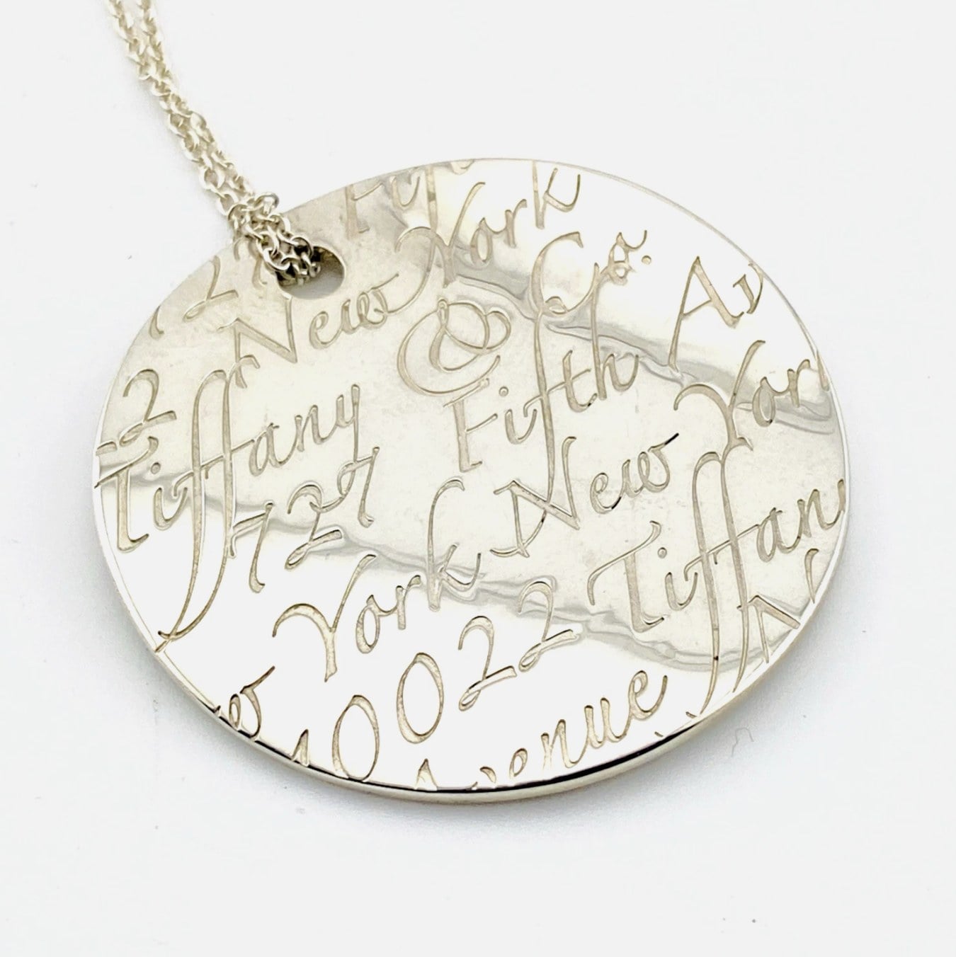 Substantial in presence, the circular pendant measures 1 5/8 inches (42 mm) in diameter and is paired with a classic Tiffany sterling silver chain measuring 19 inches in length. Together they form a refined, wearable artwork with the unmistakable quality that defines Tiffany & Co.