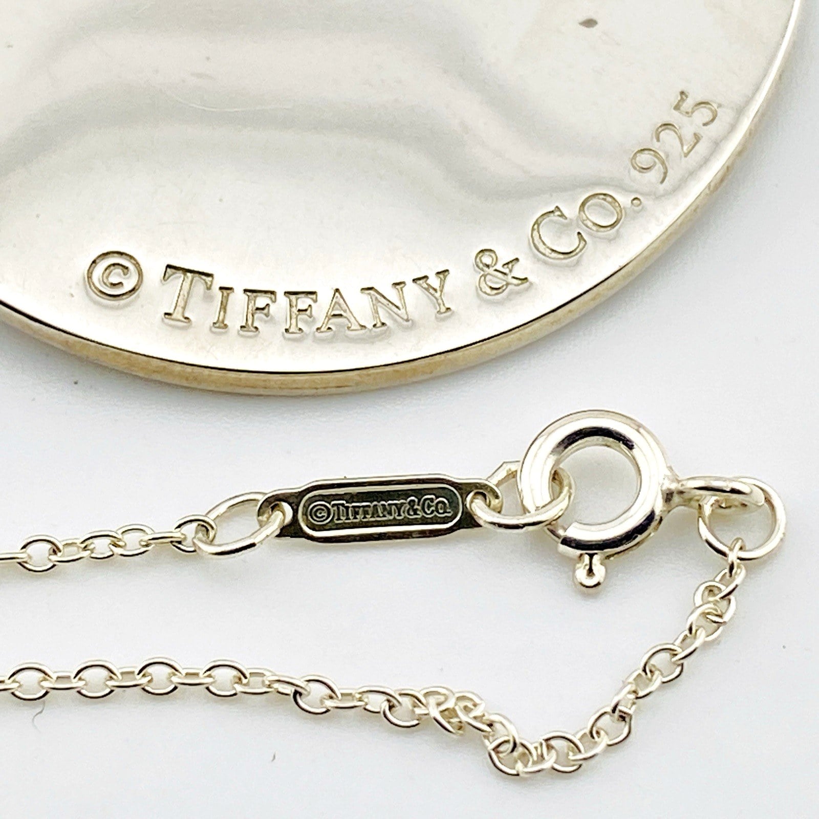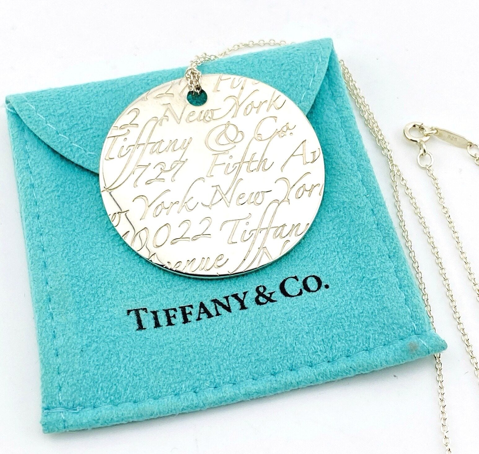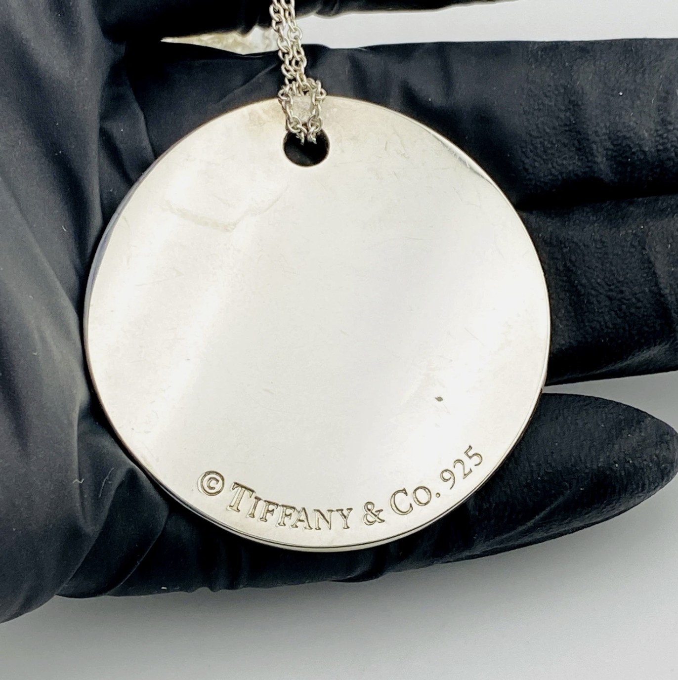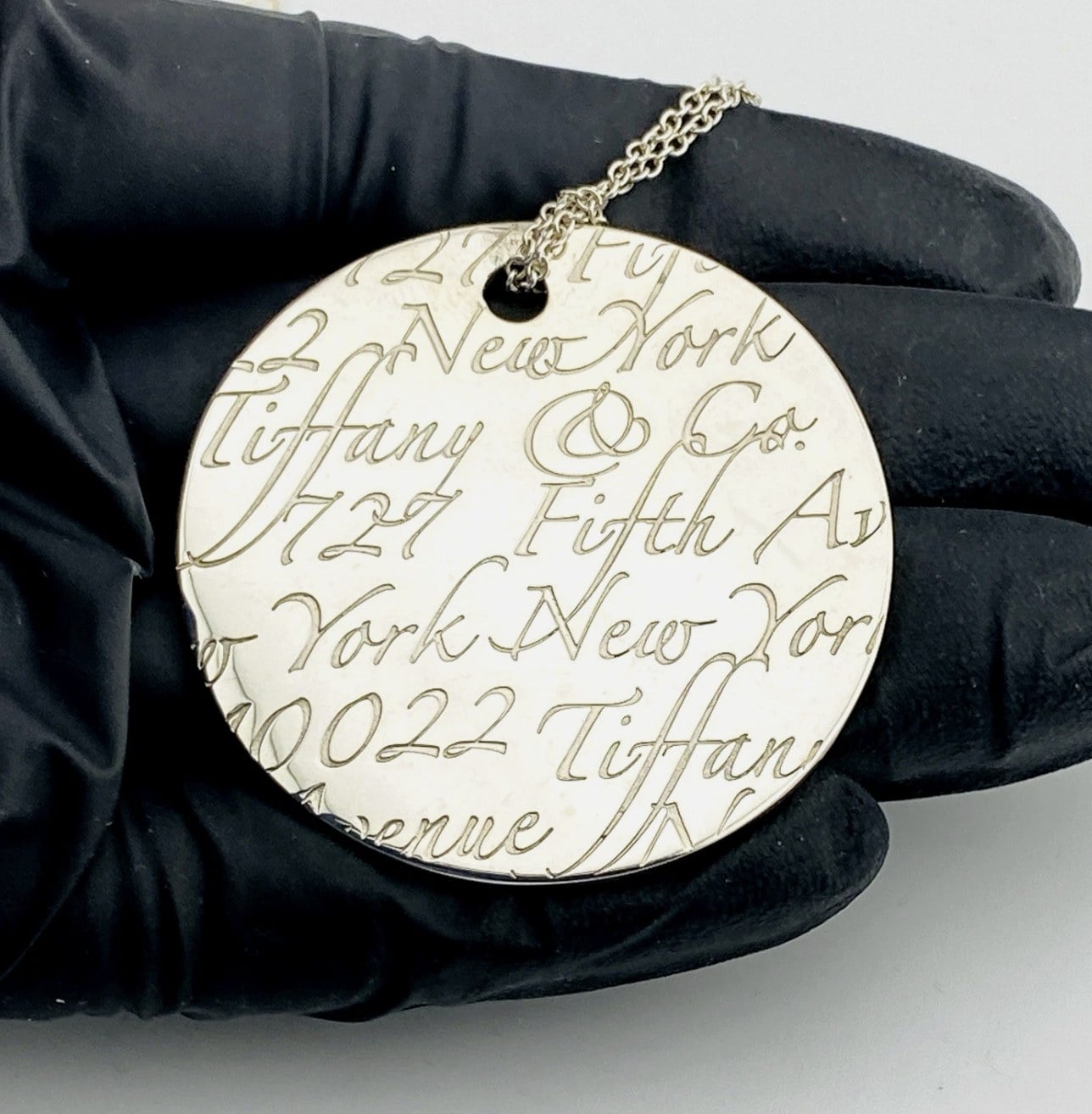 Substantial in presence, the circular pendant measures 1 5/8 inches (42 mm) in diameter and is paired with a classic Tiffany sterling silver chain measuring 19 inches in length. Together they form a refined, wearable artwork with the unmistakable quality that defines Tiffany & Co.