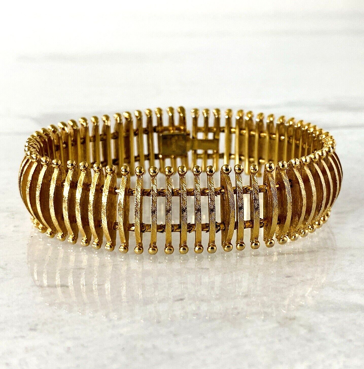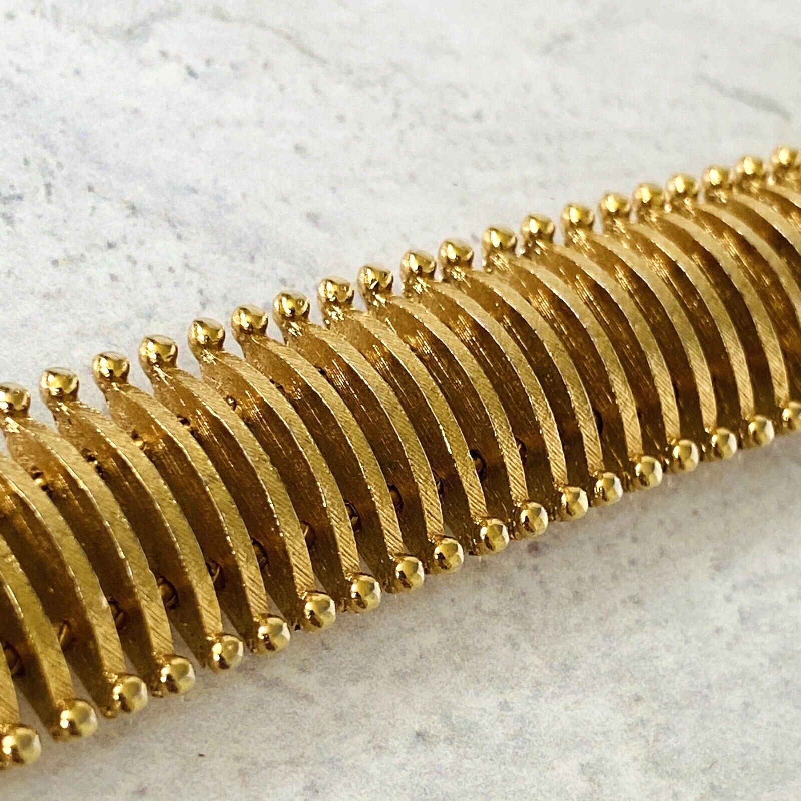 Amazing serpentine-like articulation, each link is textured in all directions and shaped like an arch finished by a polished gold-tone orb.