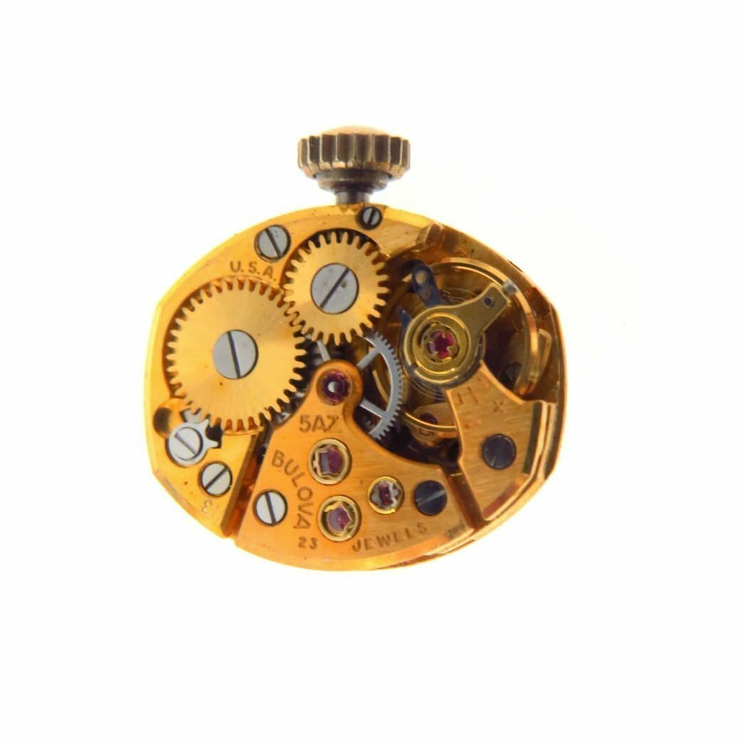 Manual movement cal 5A, 23J or 23 Jewels, marked Bulova 23 Jewels, no serial number. Runs and keeps excellent time. This is one of the highest quality Bulova movements for ladies’ watches. Dial and crystal are pristine.