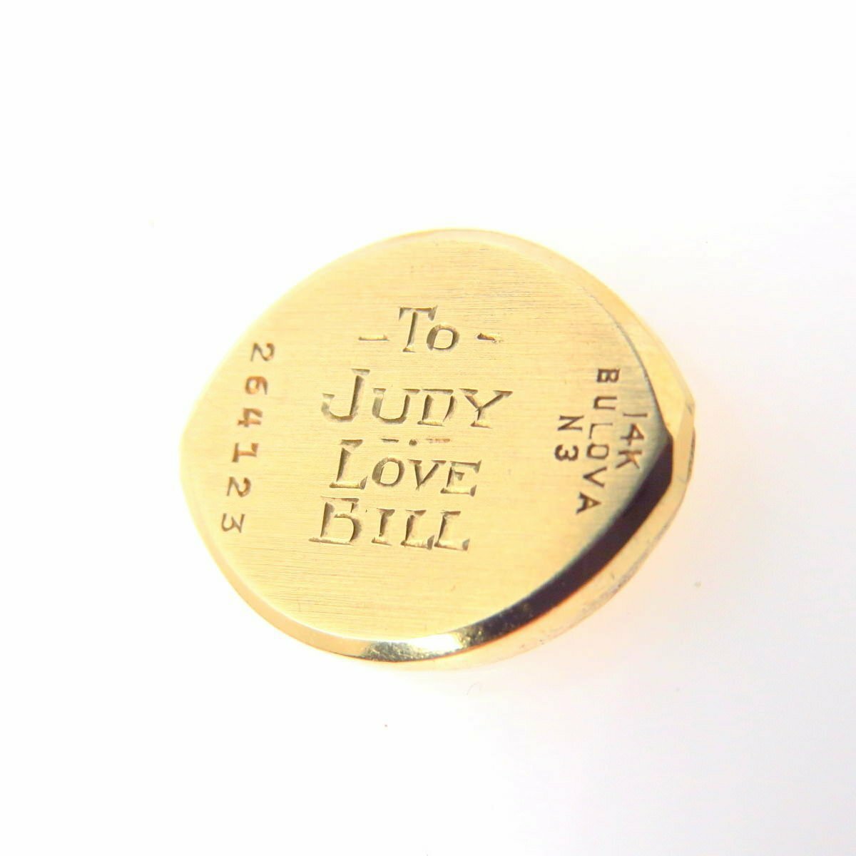 Back of case is engraved “To Judy, love, Bill”. This inscription is not visible. Also stamped Bulova, 14k and N3 for the year (1973). Overall weight approximately 13.6 grams.