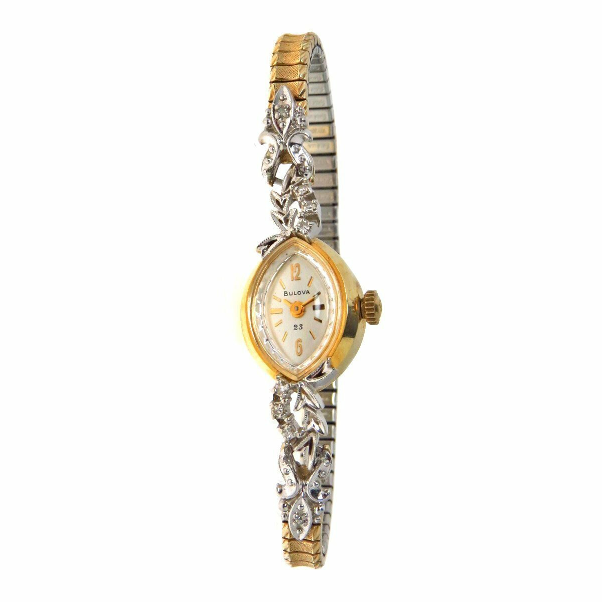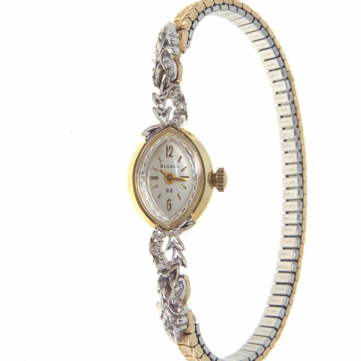 Beautiful vintage two-tone 14k Gold Bulova ladies wristwatch with extended fancy lugs set with Diamonds. Made in 1973, manual movement, 23 Jewels. Expandable gold filled band set with a Diamond is a perfect pairing. It’s the perfect bracelet watch.