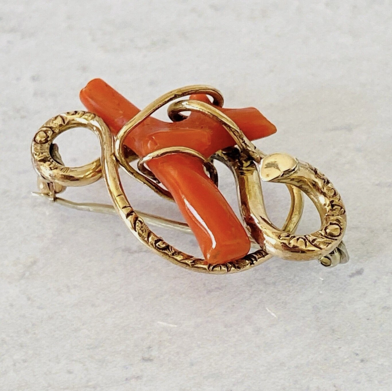 This enchanting Victorian gold-filled brooch depicts a serpent coiled protectively around a natural coral branch—an iconic pairing rich with symbolism. In the Victorian era, snakes represented eternal love and devotion, while coral was treasured for its beauty and believed protective qualities. Together, they create a powerful emblem of affection, protection, and sentiment.
