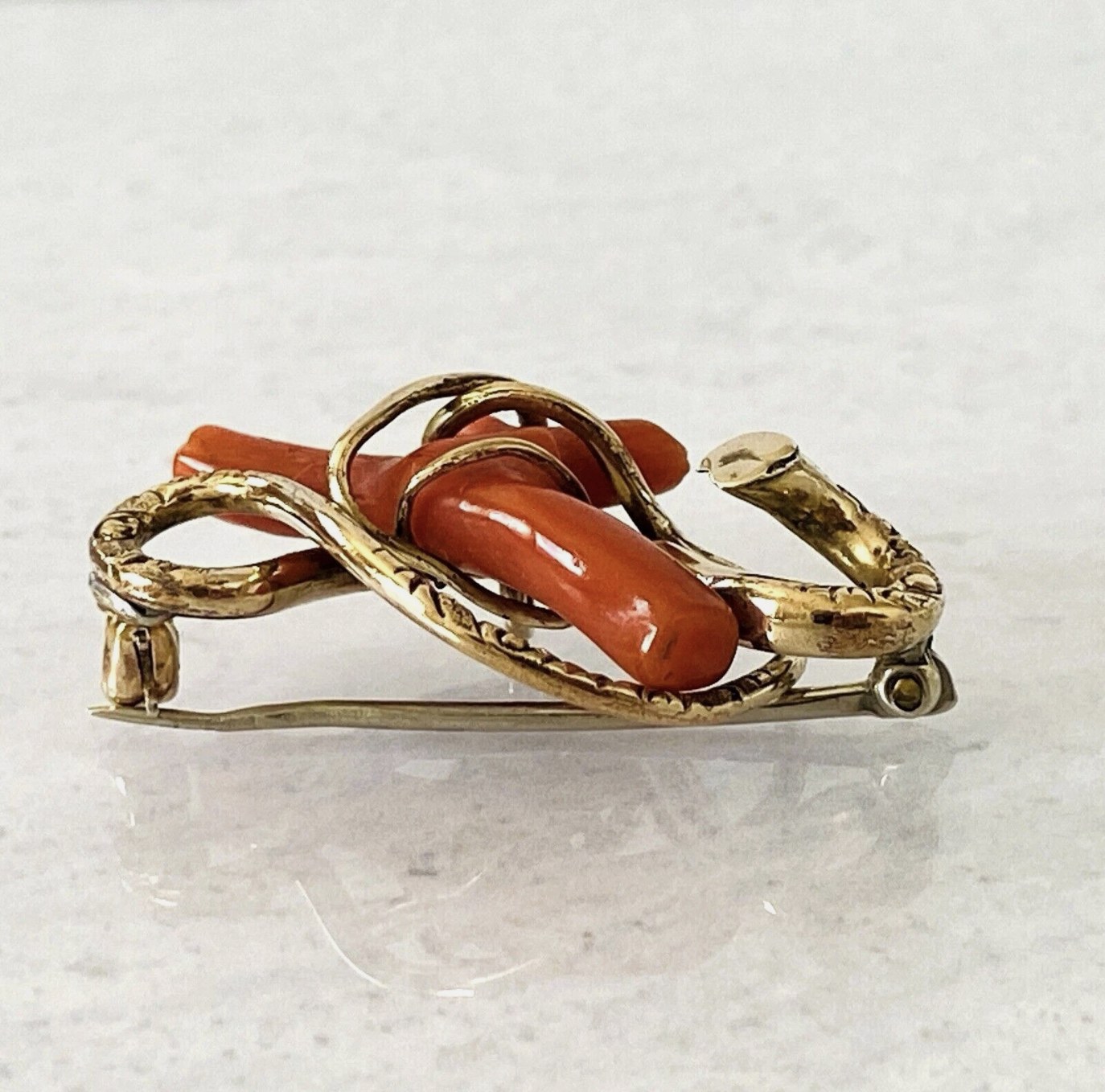 The coral branch is beautifully shaped and in excellent condition, glowing with the warm organic hue prized in 19th-century adornment. The gold-filled serpent curves gracefully around it, with a smooth, polished form that speaks to the refinement of the period. At 1 3/8 inches (37mm) long and 7/8 inch (22mm) wide, this piece is notably larger than many similar brooches, giving it a presence that feels both romantic and bold.