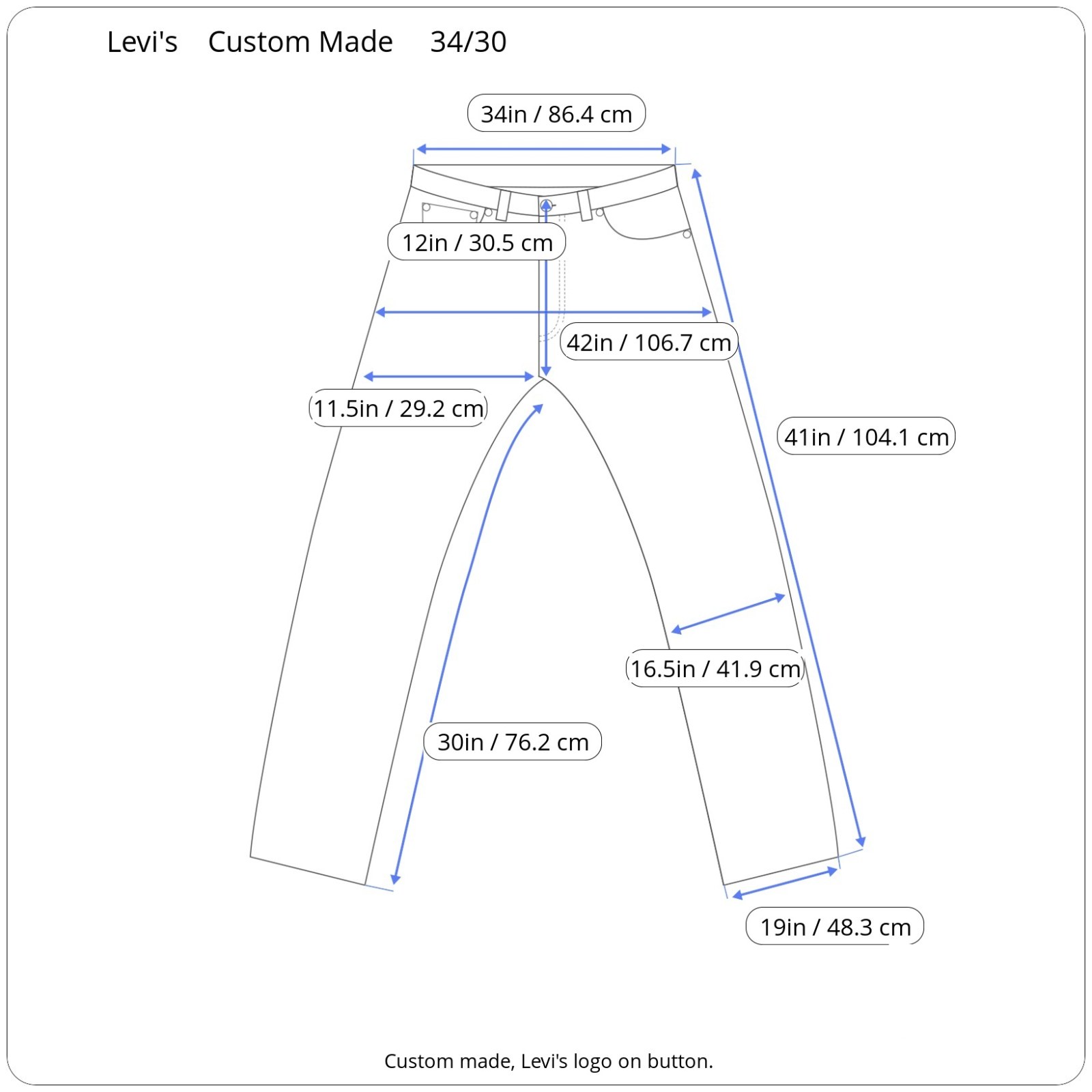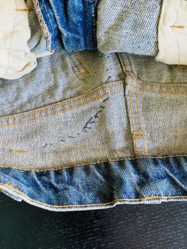The original Levi’s paper tags are no longer present, but the button is clearly marked Levi’s. The jeans were custom made or modified, making them distinct from standard production pieces. Wear is consistent with age and use, contributing to their authentic vintage character.