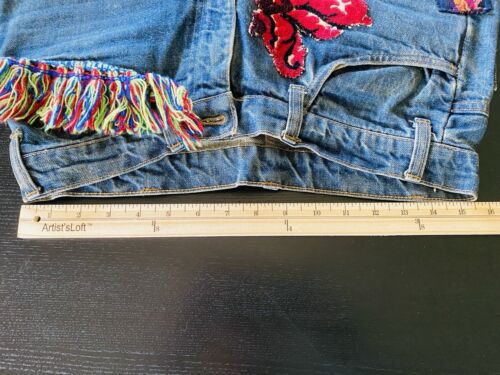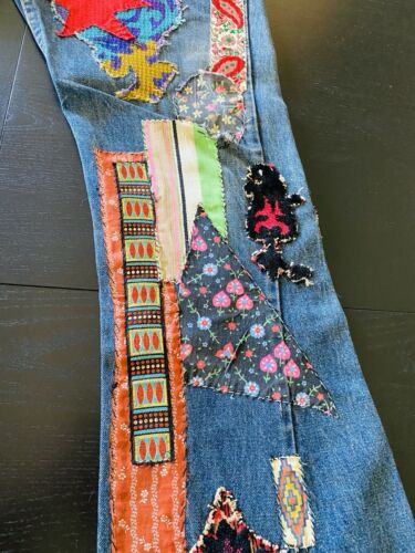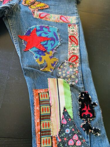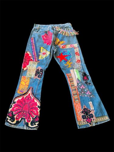 Vintage 1970s Levi’s jeans featuring hand-embroidered appliqués in a true hippie-era custom design. These men’s flared jeans reflect the individuality and creative expression of the 1970s, with decorative stitching added by hand rather than factory production.