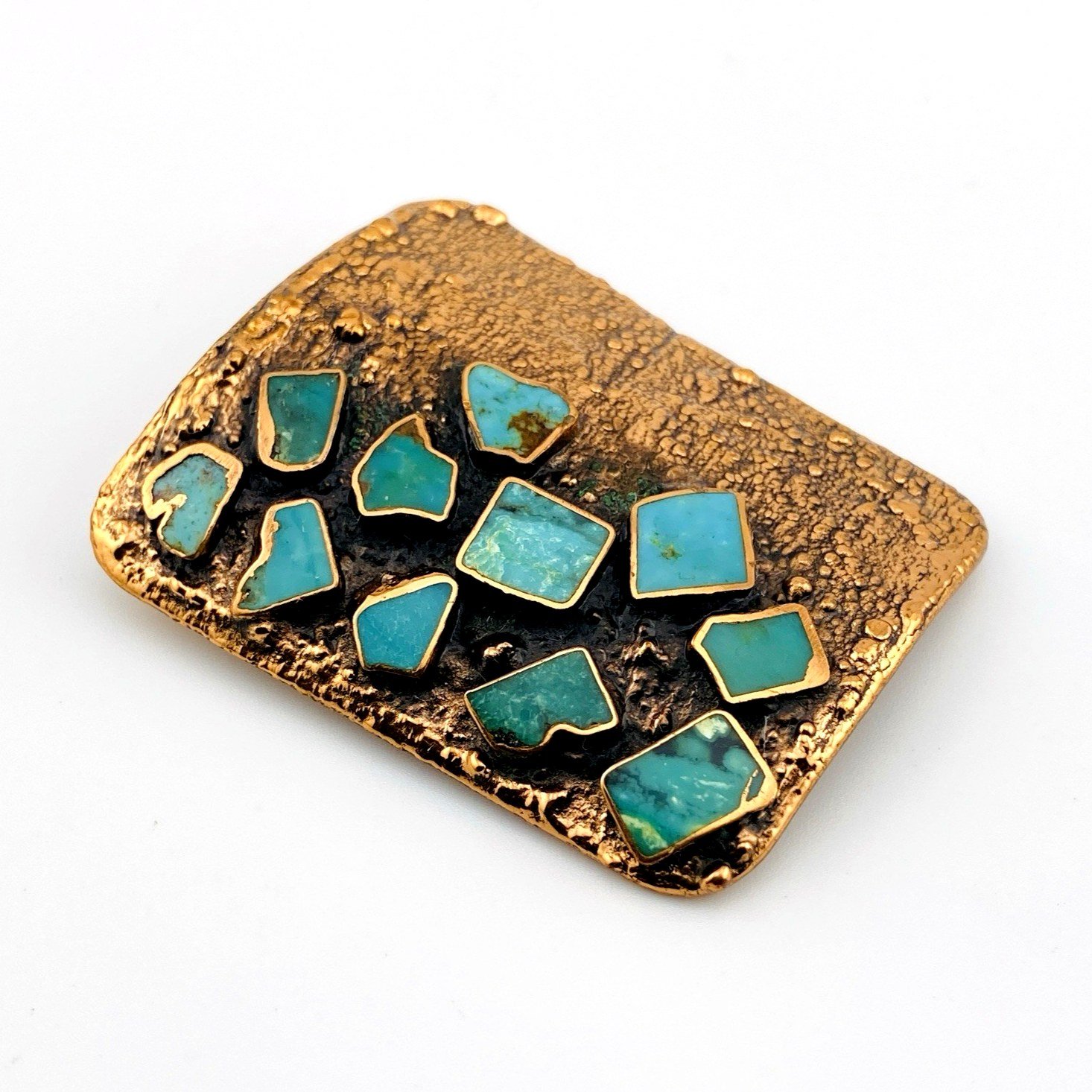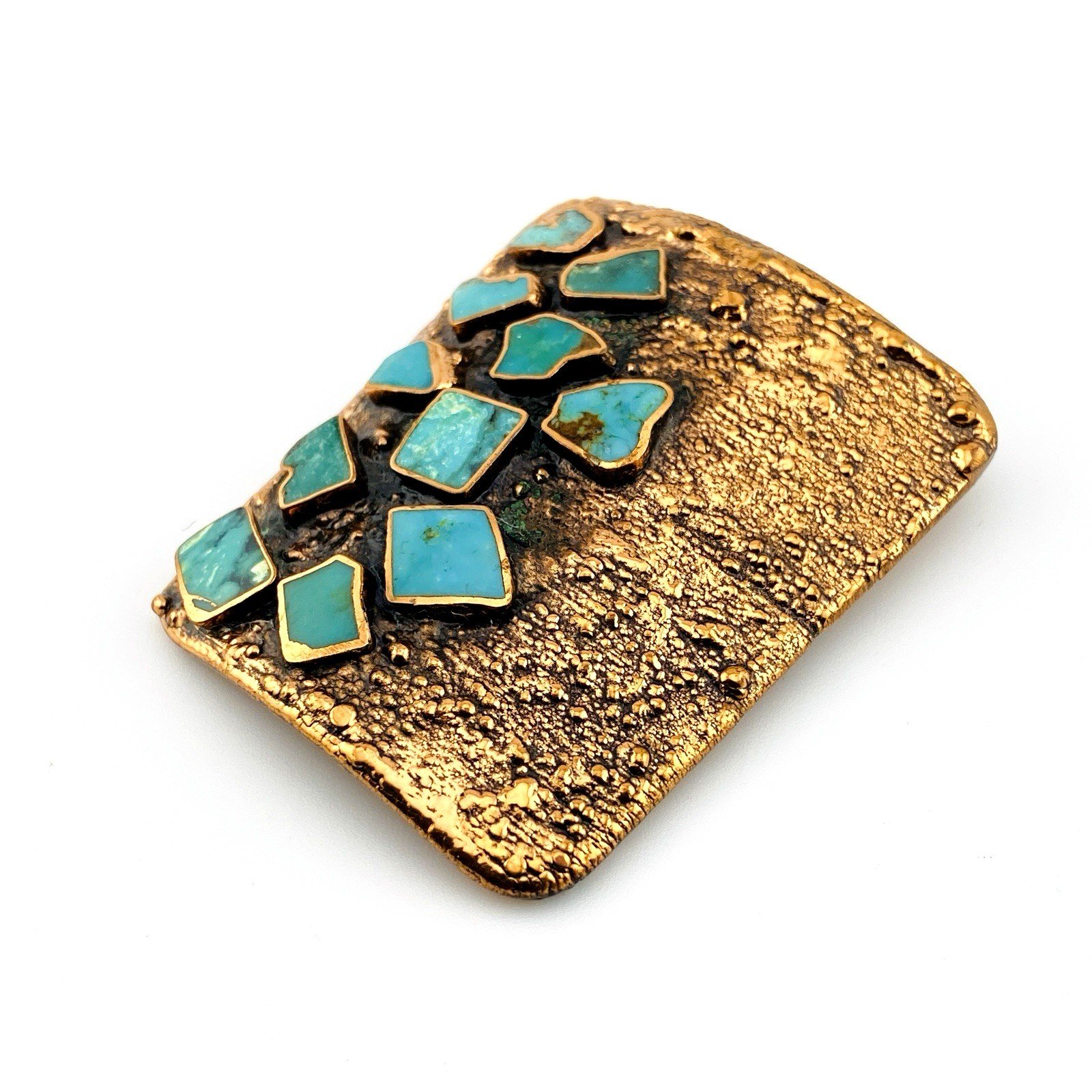 This Vintage Bell Trading Co Brutalist Copper & Turquoise Western Bolo Tie Slide from the 1960s exudes a rugged Southwestern style with its curved isosceles trapezoid shape and natural turquoise stabilized chips set in solid copper.