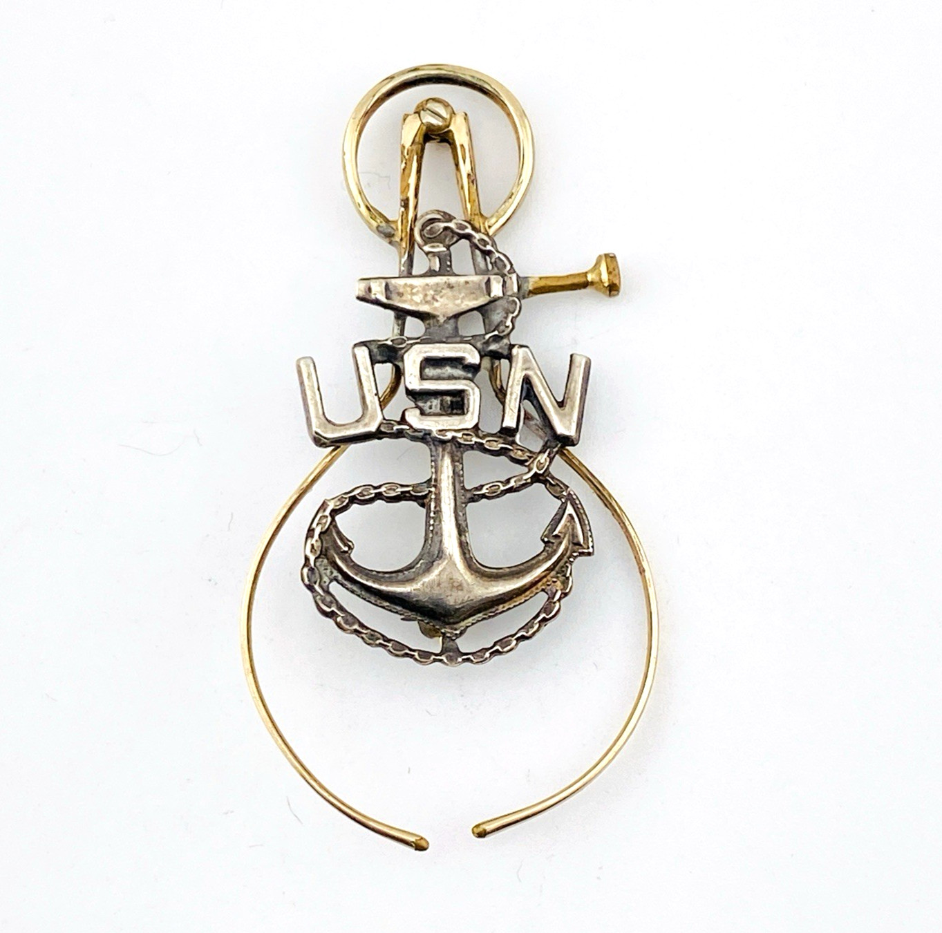 The anchor and USN letters represent naval service, tradition, and identity, while the caliper-like element may reference engineering, drafting, machinist work, or technical naval service. Jewelry incorporating occupational tools alongside military insignia was sometimes created as custom sweetheart pieces, presentation pins, or personal service keepsakes, often assembled individually rather than factory-produced.