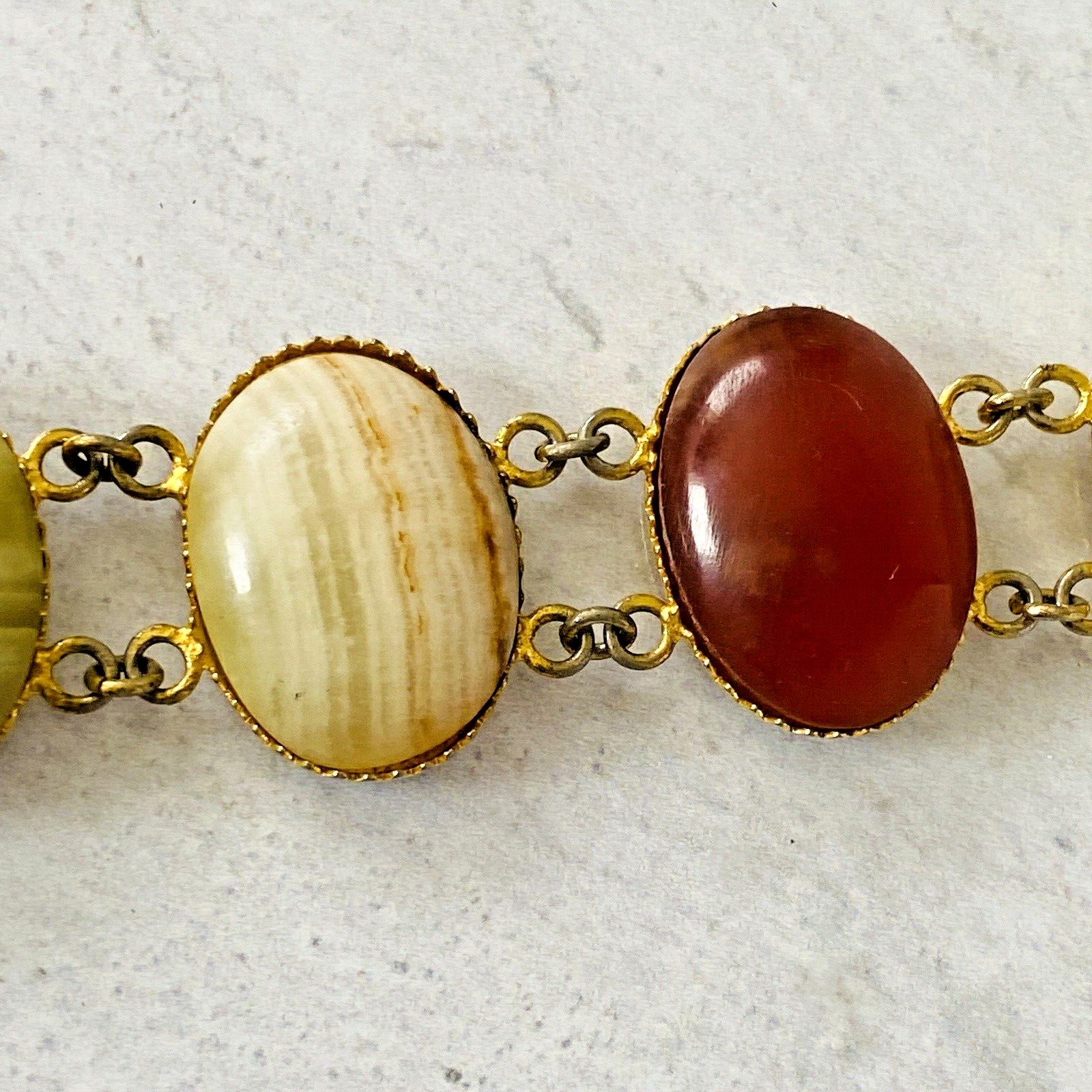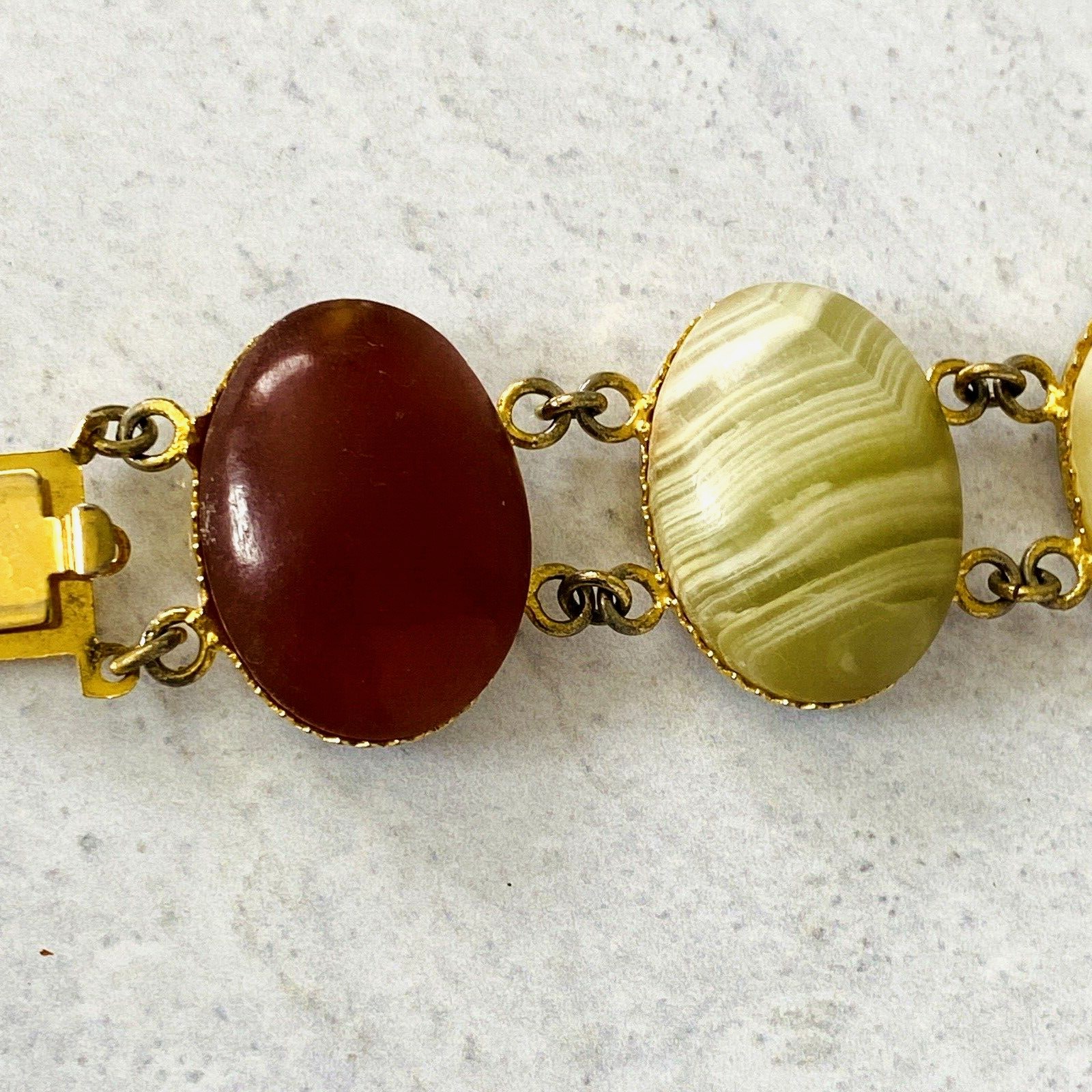 Vintage Italy Large Banded Chalcedony Cabochon Bracelet – Green Banded Agate & Red Carnelian