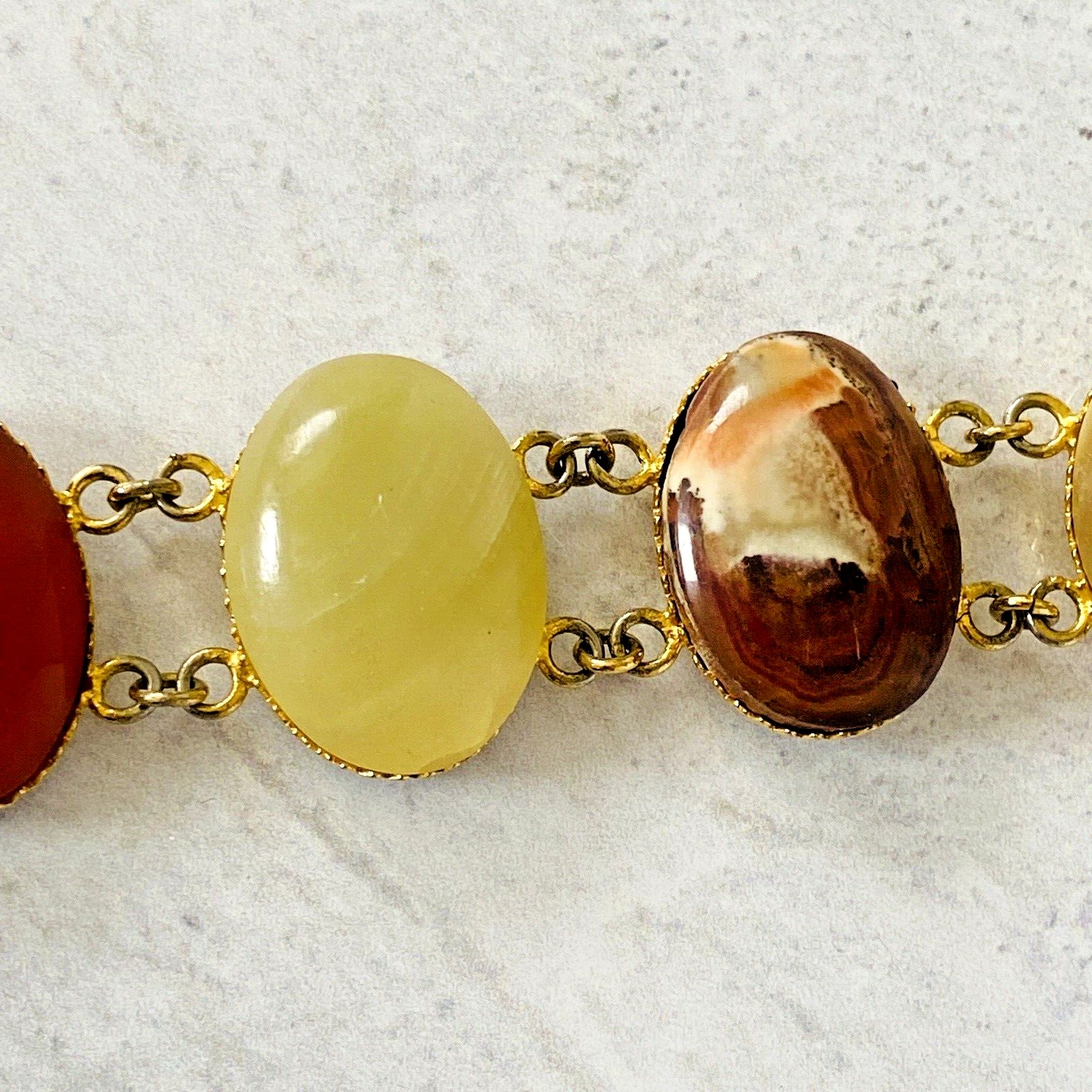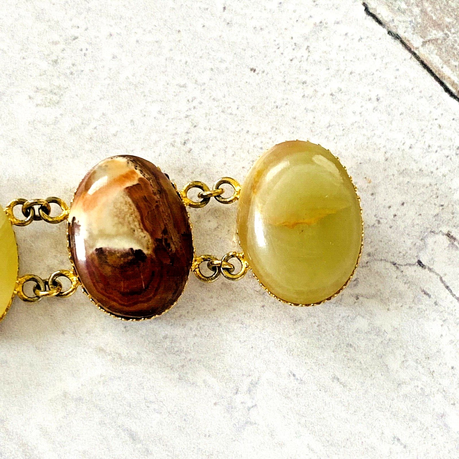 The cabochons are smoothly polished and set in gold-plated metal, allowing the natural banding and color transitions to take center stage. Subtle variations from stone to stone create visual rhythm across the bracelet, giving it an organic, sculptural presence on the wrist.