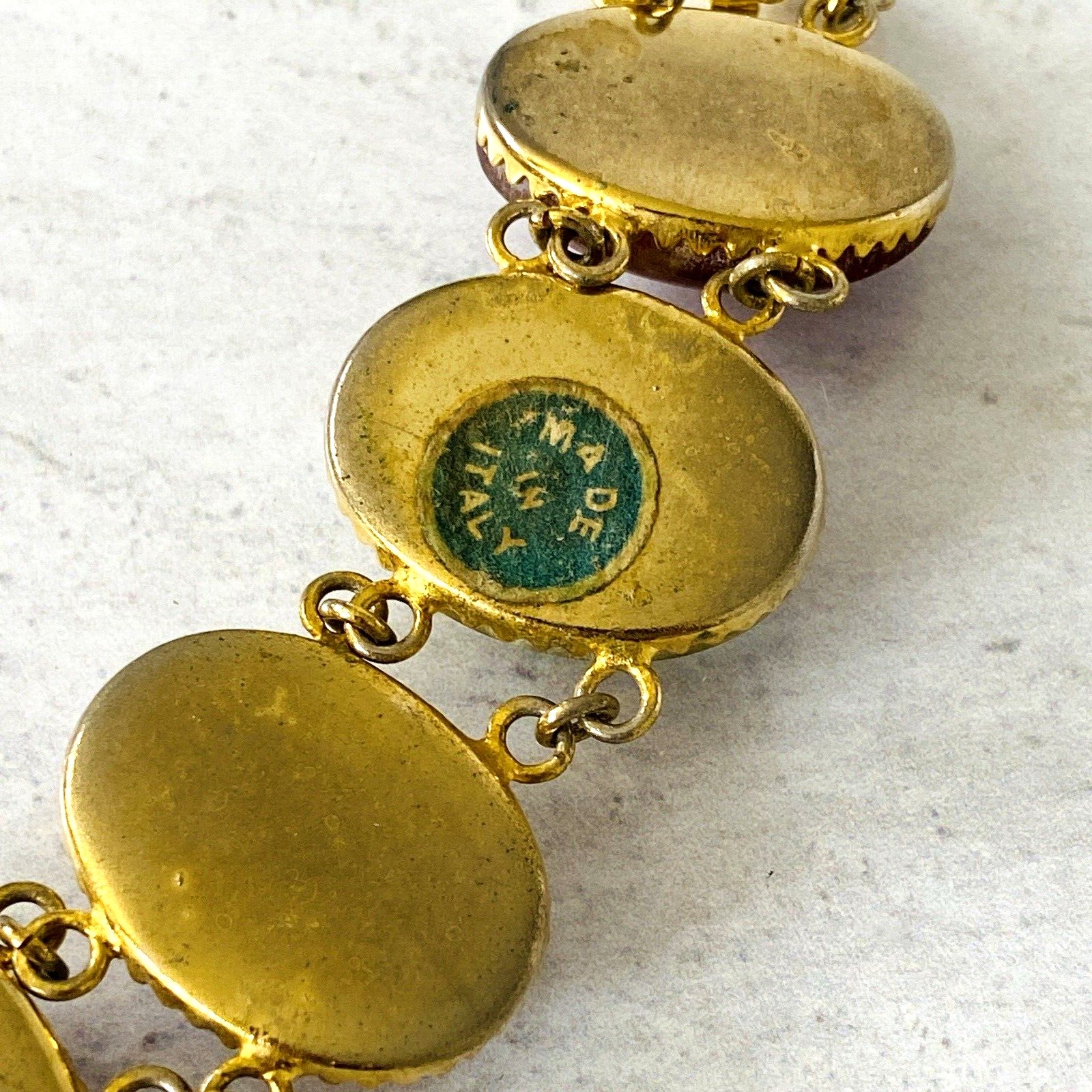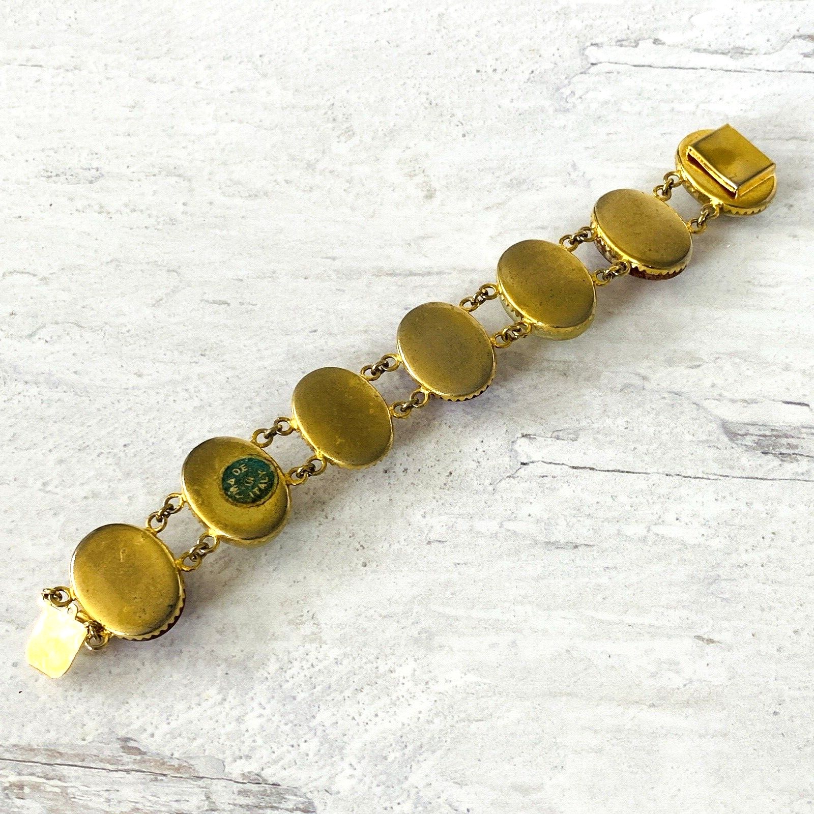The bracelet retains its original “Made in Italy” paper label, still intact—a wonderful detail suggesting minimal wear and careful preservation over time. There is light, age-consistent loss to the gold plating, visible only upon close inspection and in keeping with the bracelet’s vintage character.