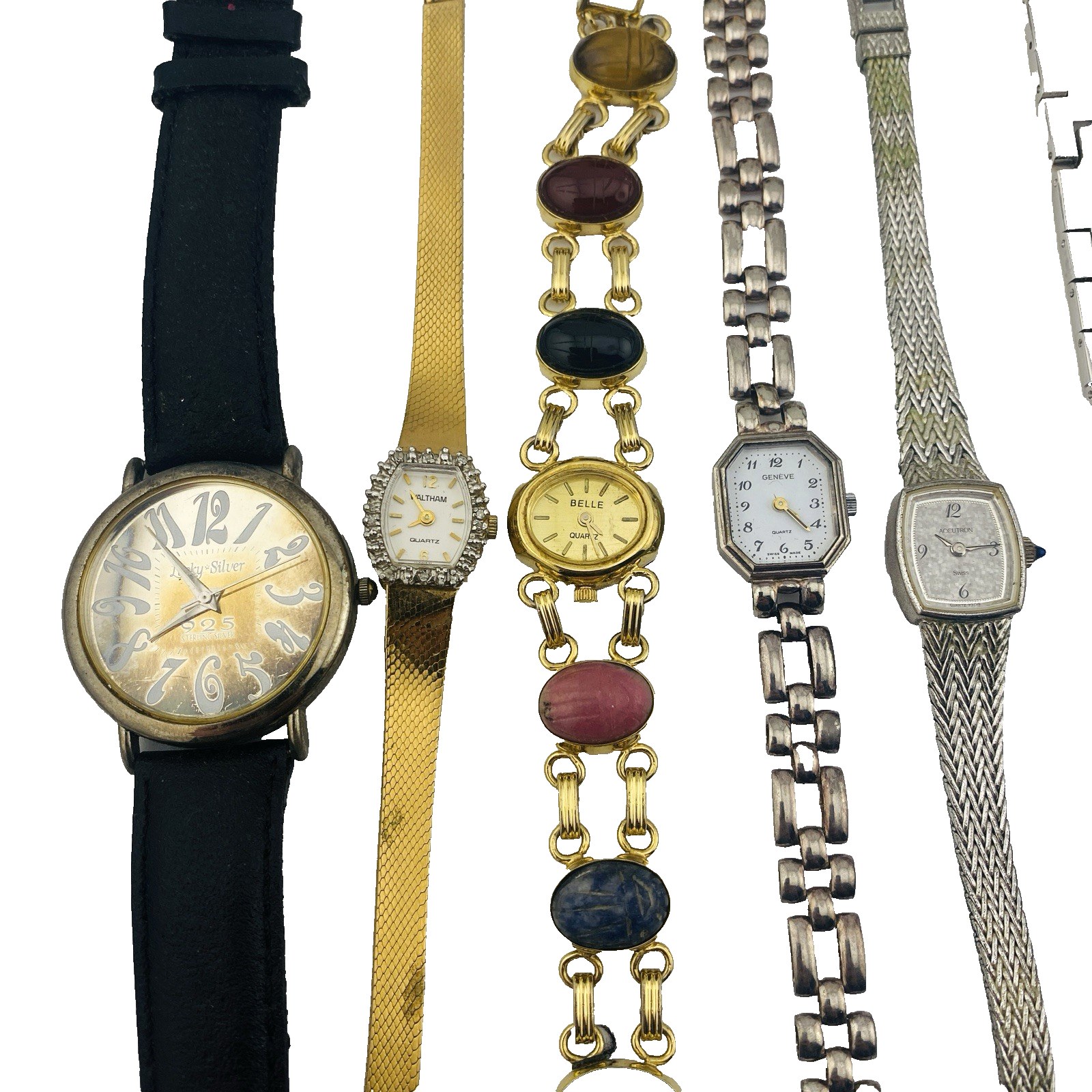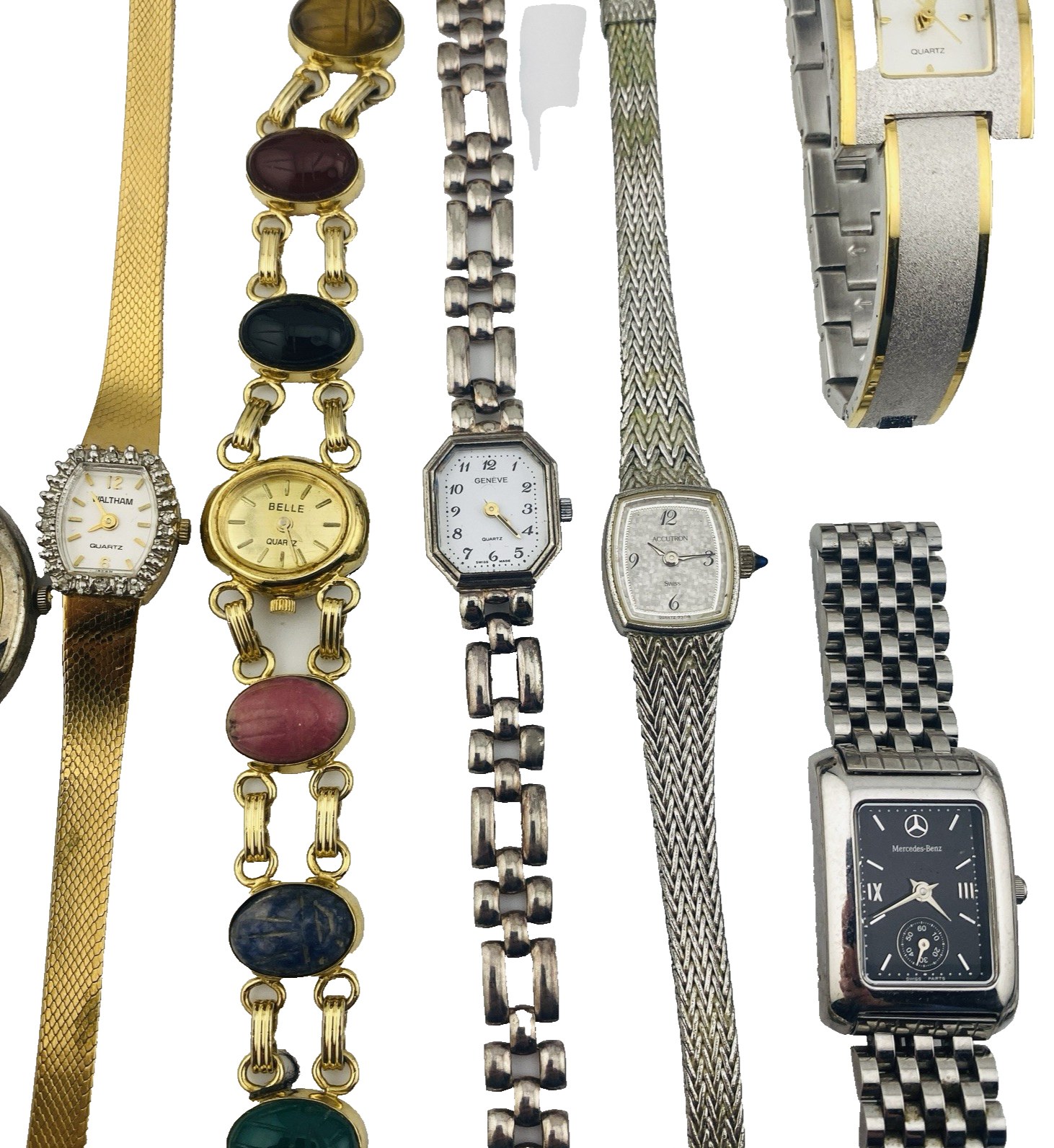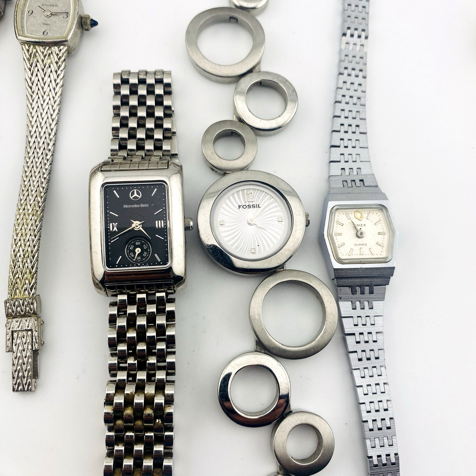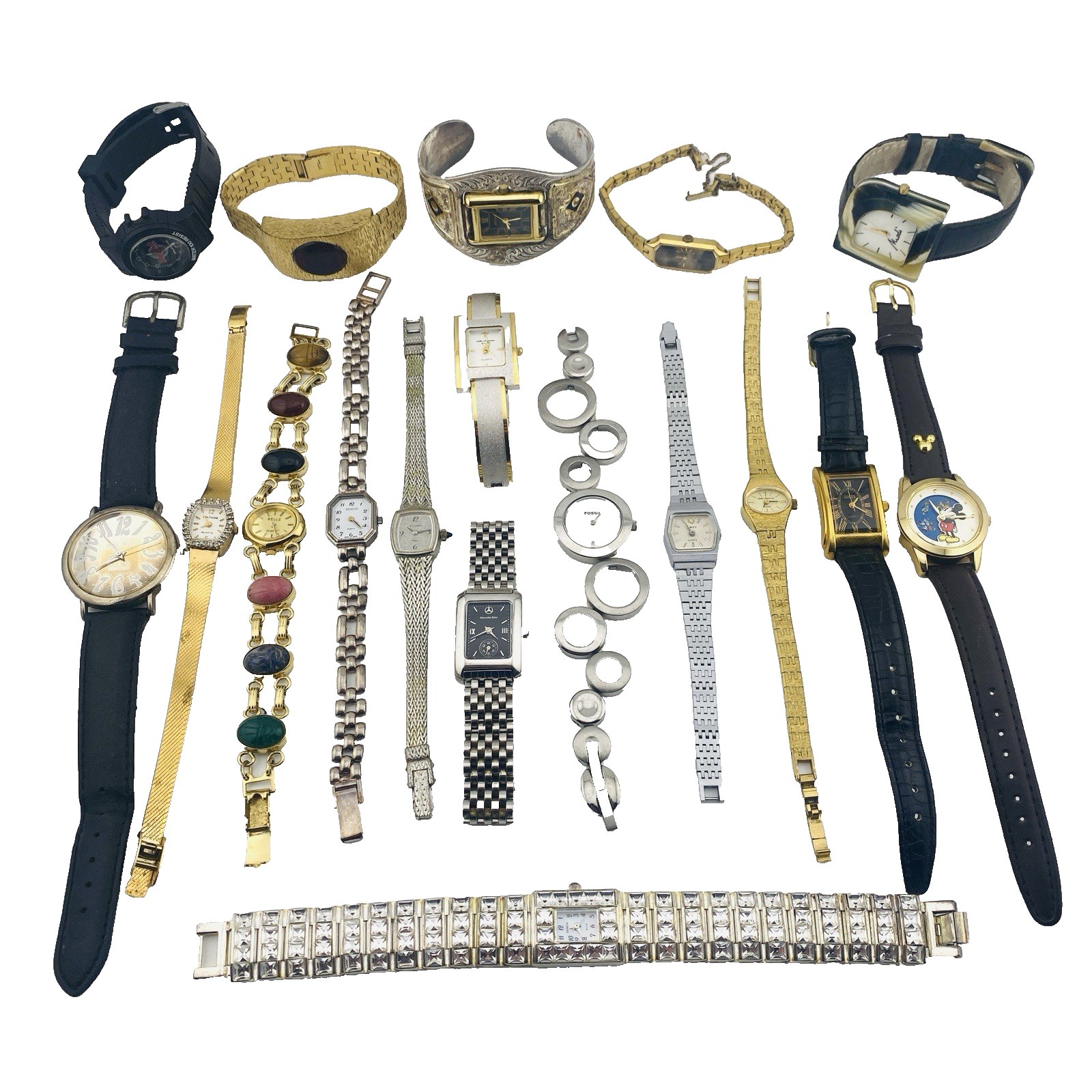 A collection of vintage ladies’ bracelet watches – ALL IN EXCELLENT COSMETIC CONDITION – SOLD AS IS – UNTESTED – for parts, repair, restoration. Collect or resell this excellent assortment of unique styles—a total of eighteen (18) different watches, all quartz movements. Seventeen (17) are analog.