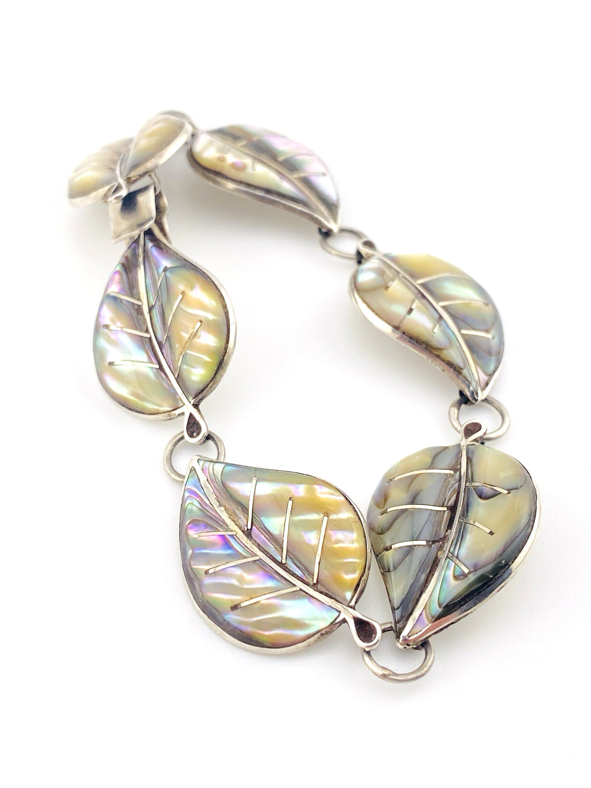 Vintage Mother of Pearl Leaf Link Sterling Silver BraceletA beautifully crafted vintage bracelet composed of six articulated leaf links set with luminous mother of pearl. The natural shell displays soft iridescent tones that shift subtly in the light.