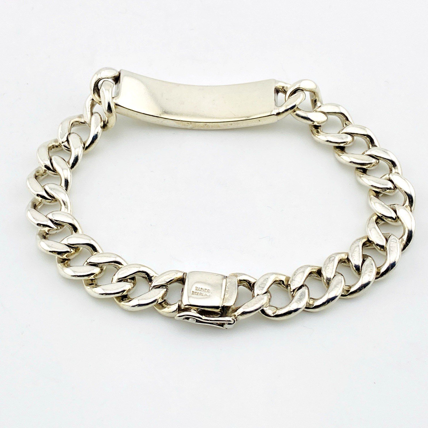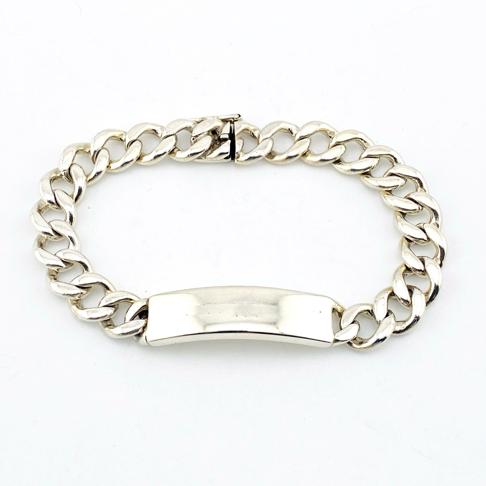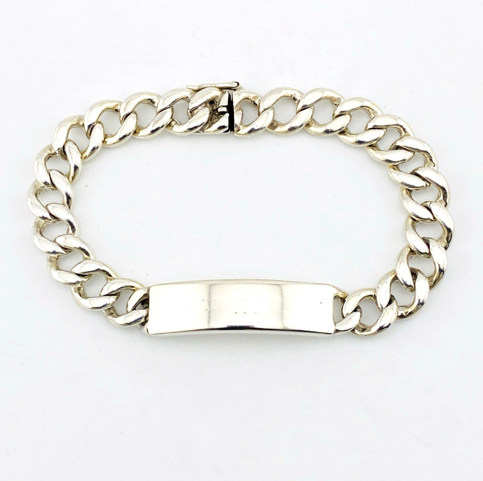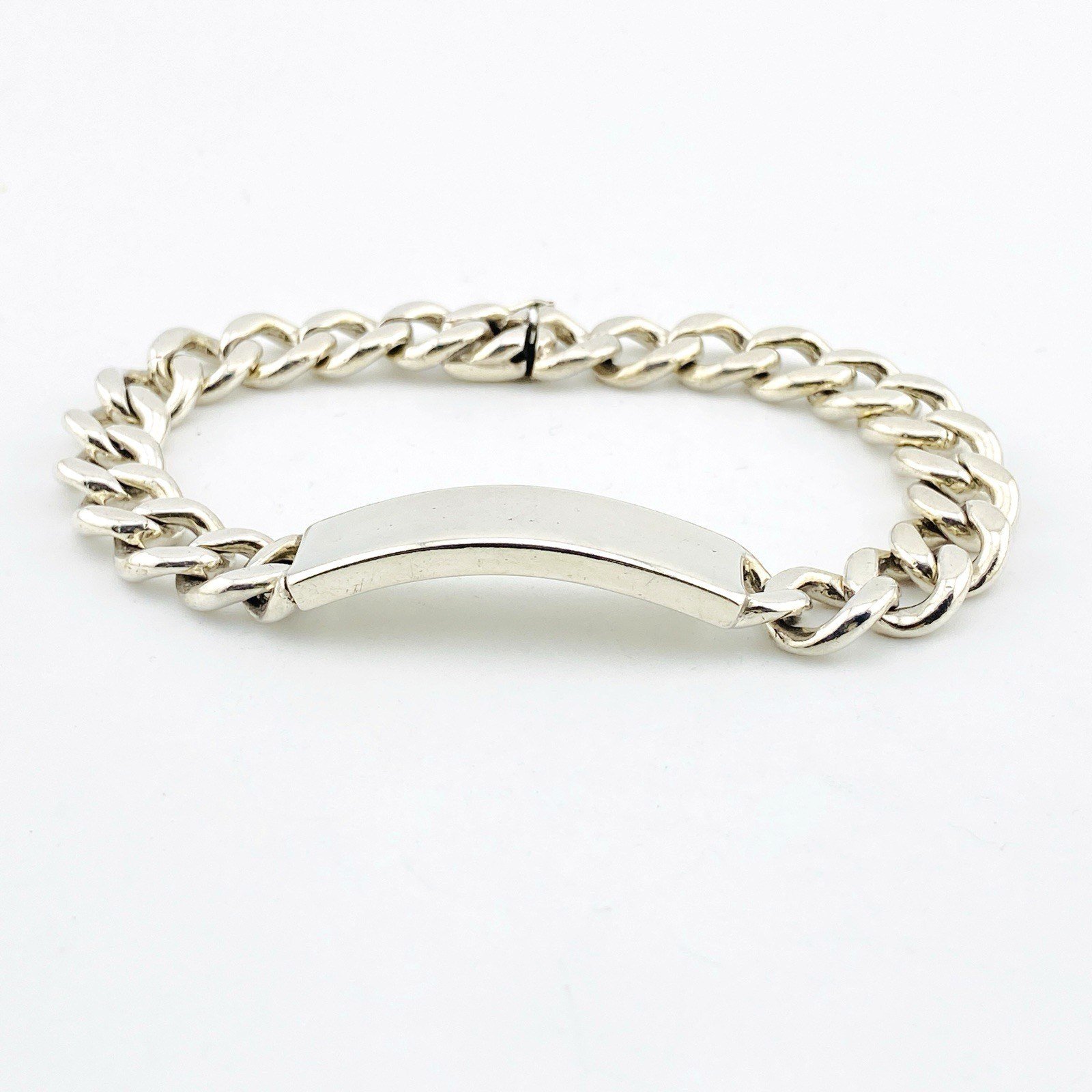 The bracelet is solidly constructed with wide links and finished with a secure box clasp and working safety latch. It has a reassuring weight on the wrist and a timeless, unisex appeal.