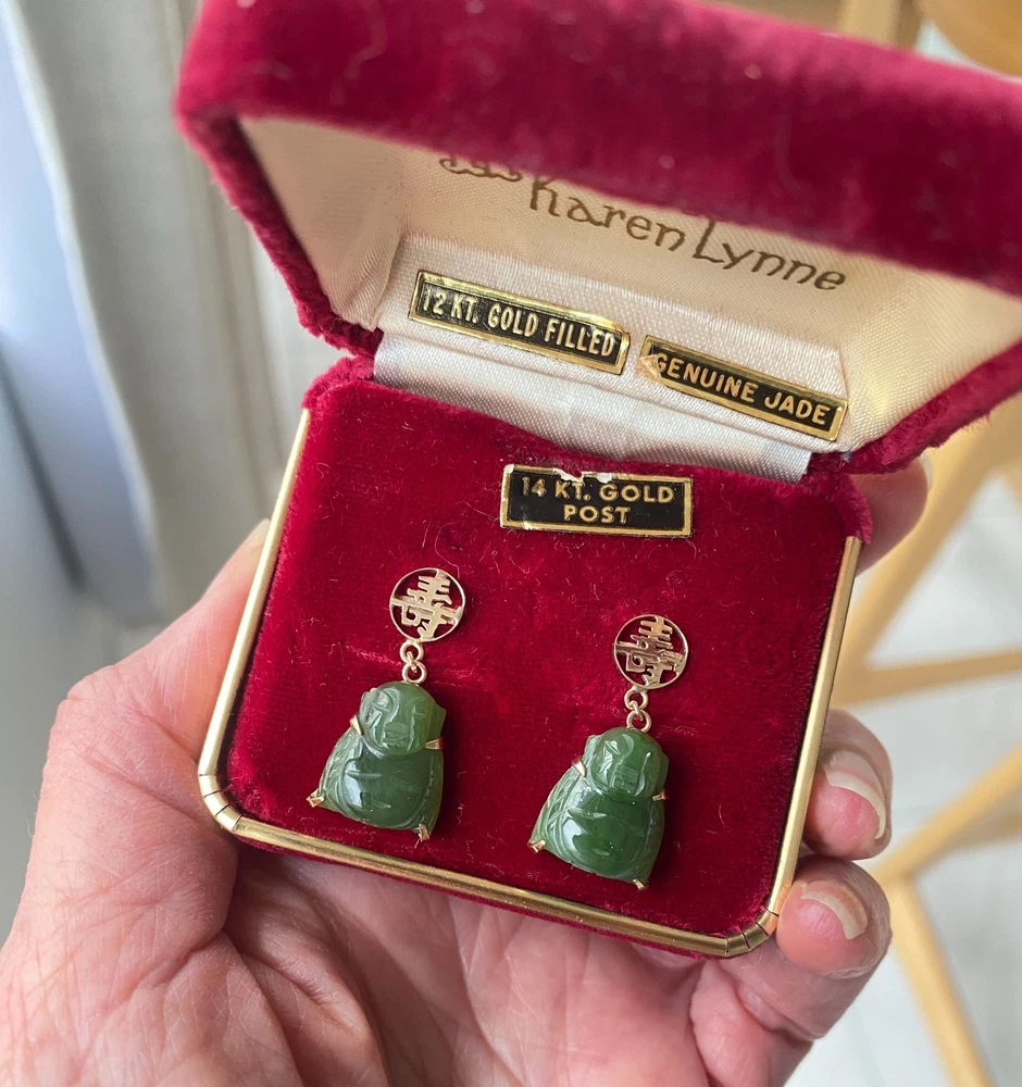 A beautifully made vintage pair of nephrite jade drop earrings featuring finely carved Buddha figures in rich green jade. Each figure is prong set in yellow gold filled and suspended from stud tops detailed with an openwork Chinese longevity character, adding both symbolism and visual interest.