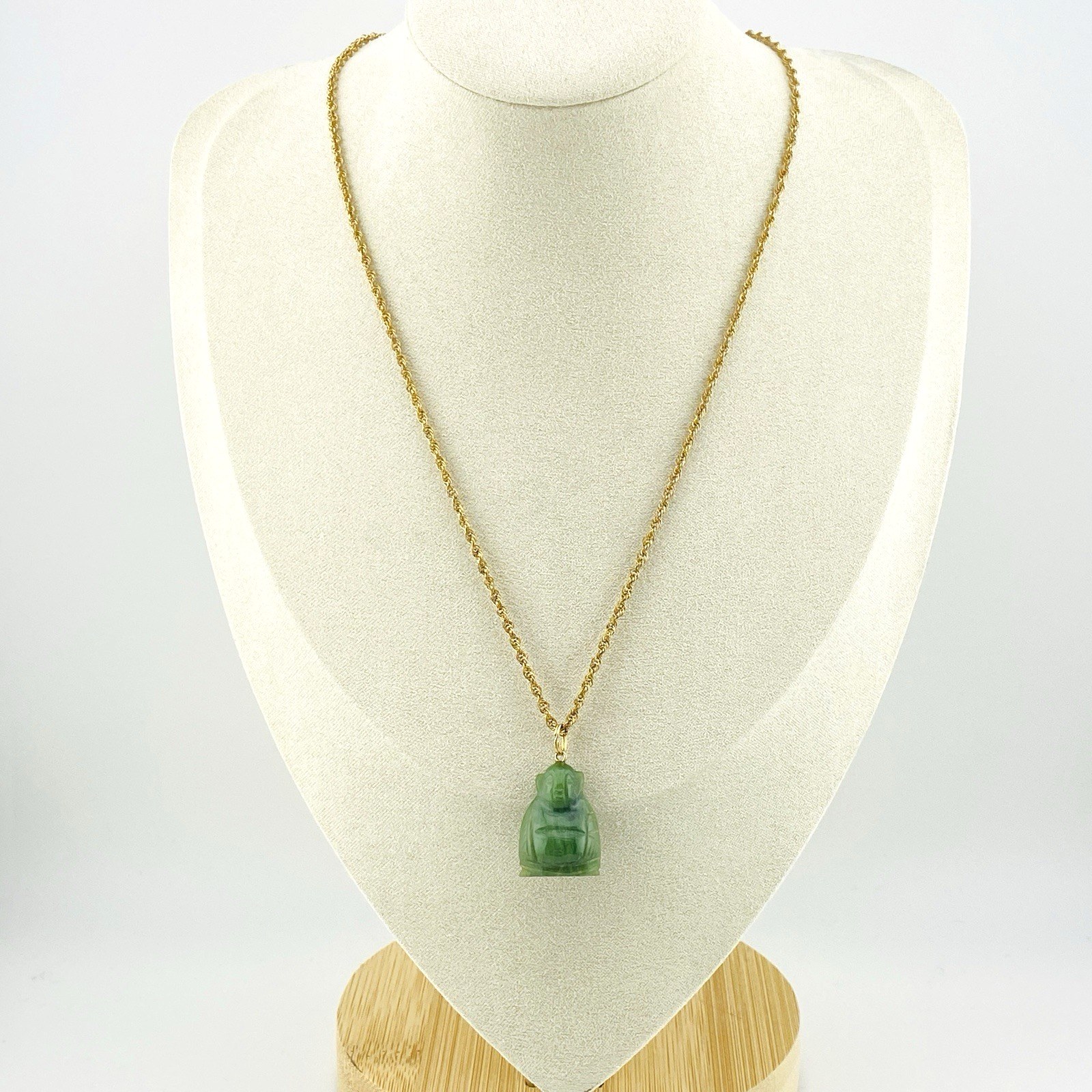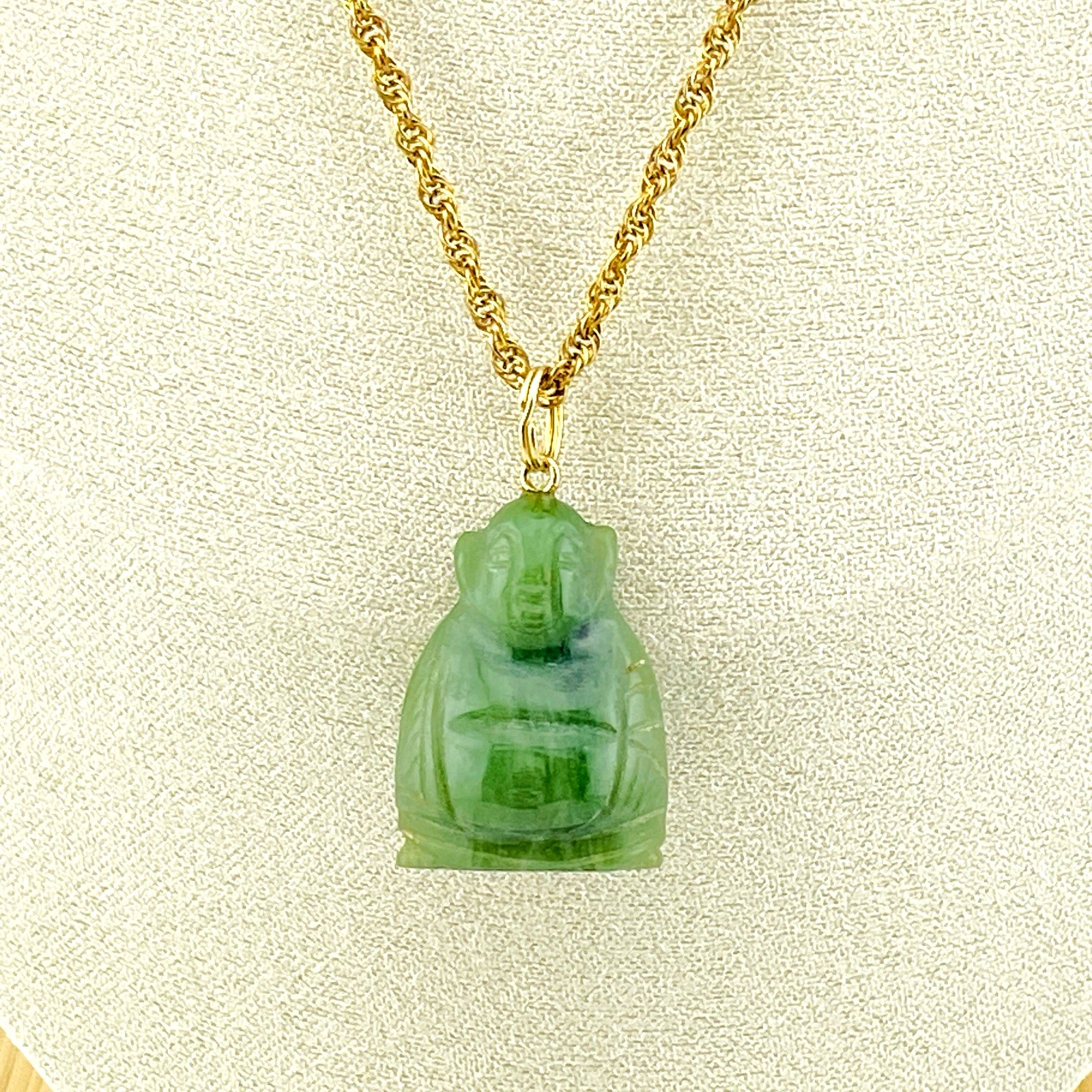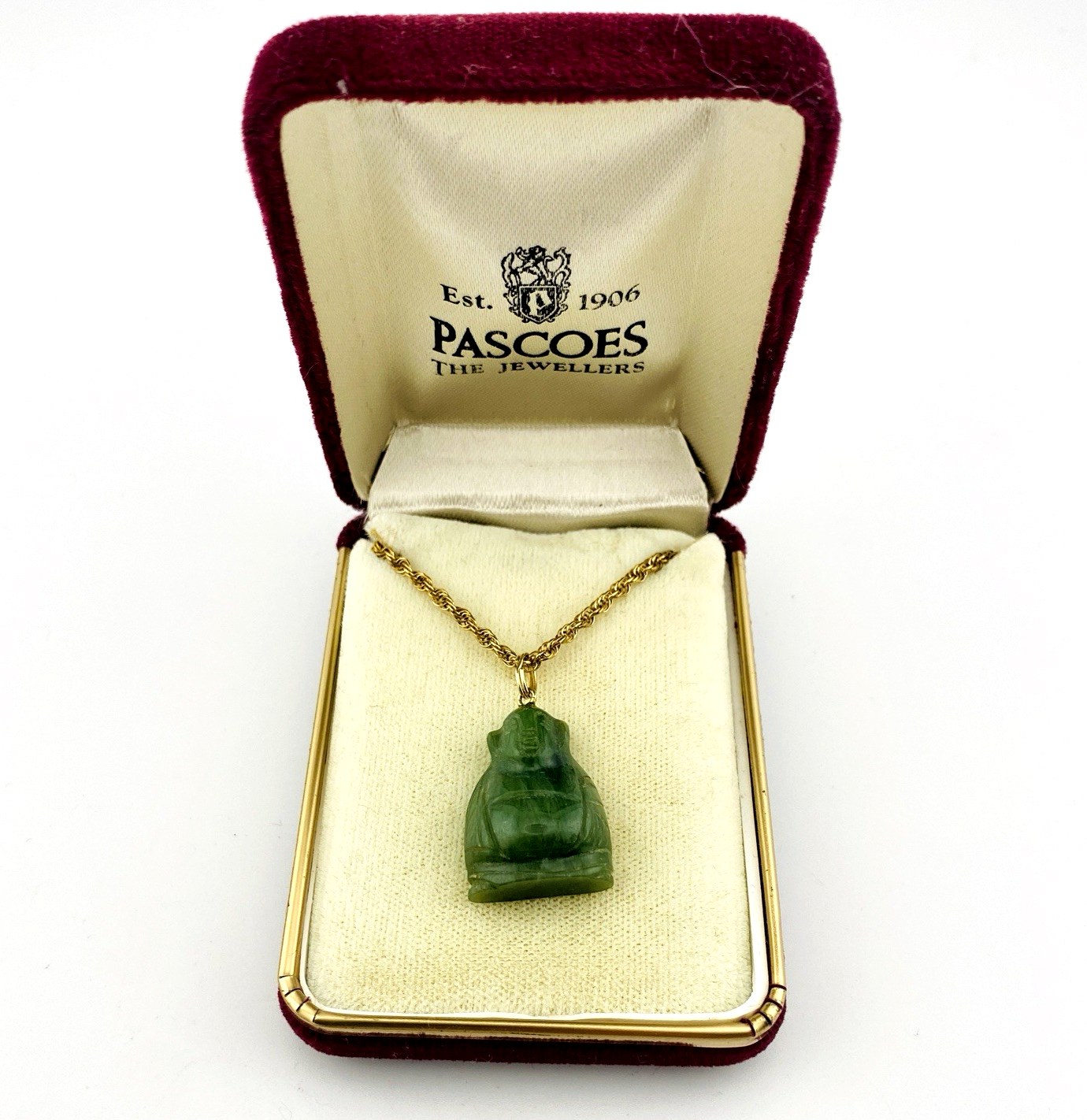 This vintage nephrite jade Buddha pendant is carved in the Billiken style and finished with a gold filled bail. Traditionally associated with good fortune and positivity, the Billiken-inspired Buddha has a warm, friendly expression and excellent carving detail.
