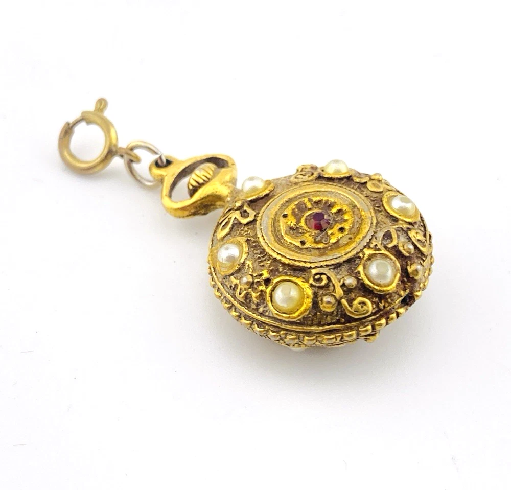 A finely detailed vintage figural pendant designed in the form of a miniature pocket watch, finished in rich gold plating and accented with faux pearls and a central turquoise cabochon.