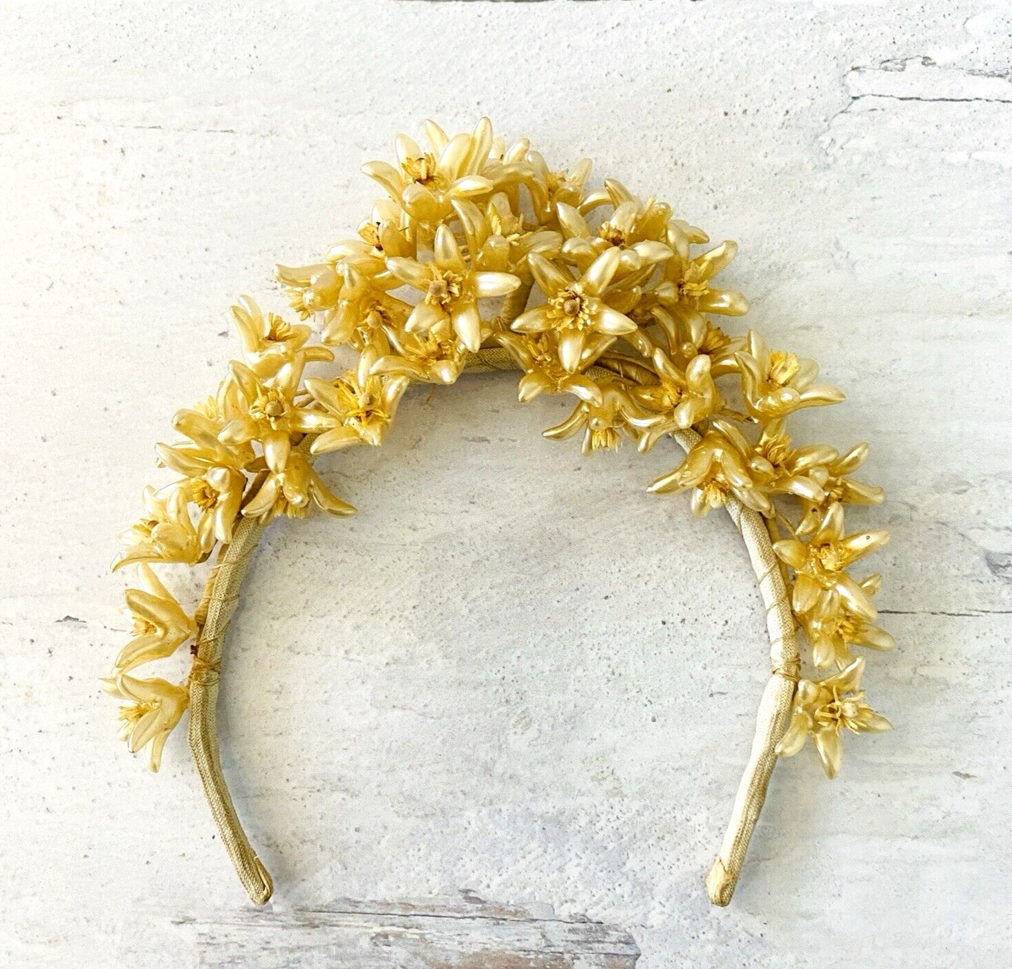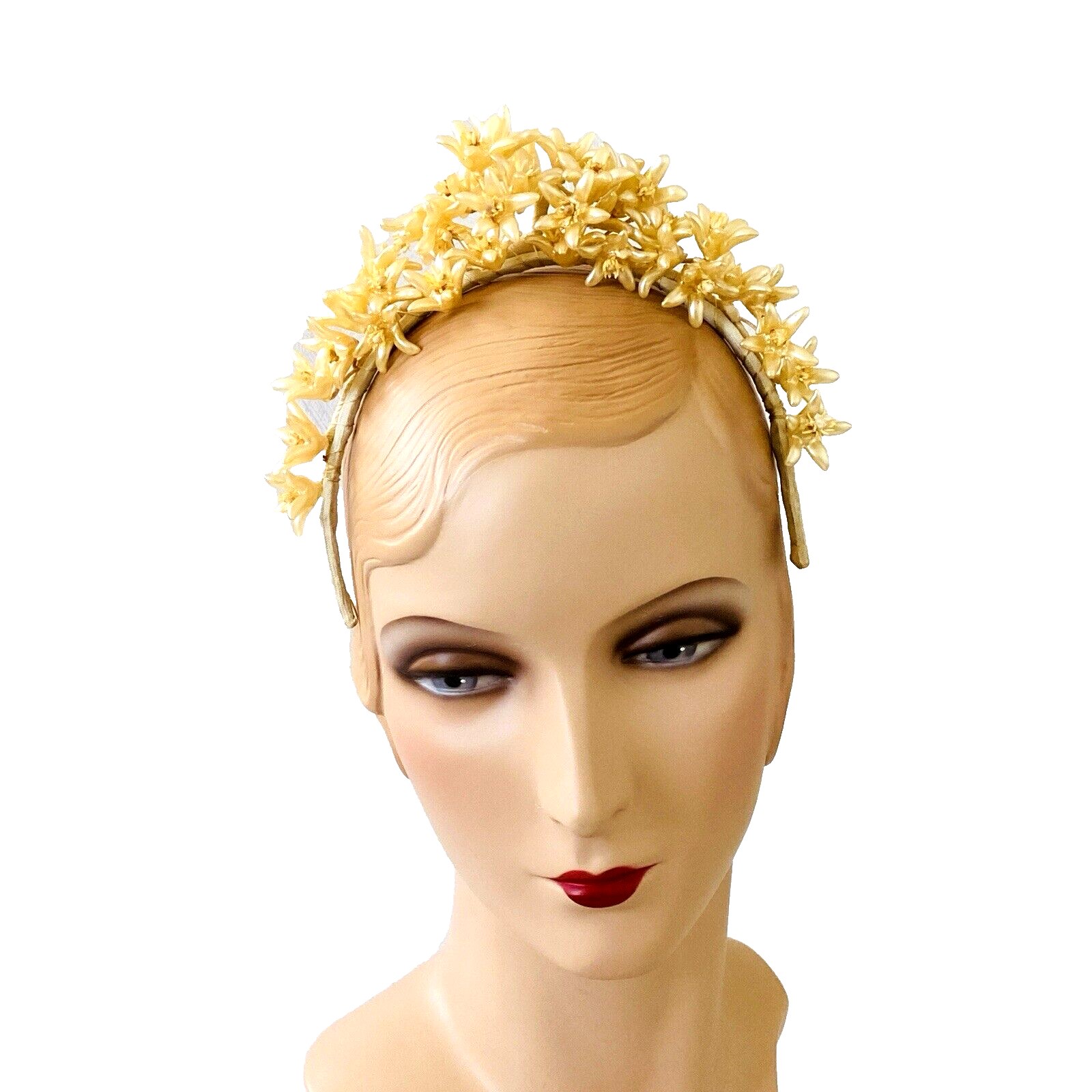 The cluster of flowers on the top of the headpiece reaches 2 inches tall.